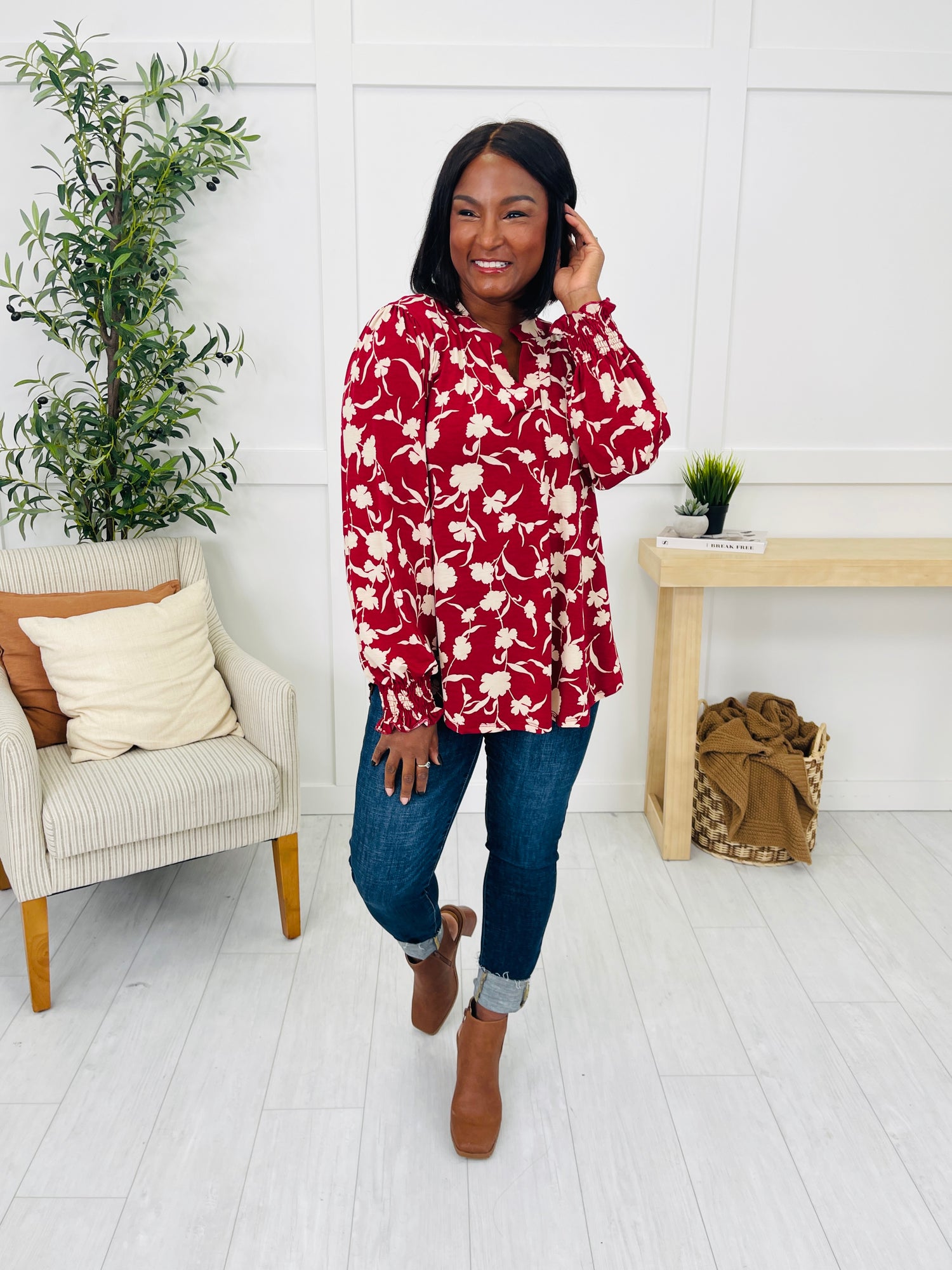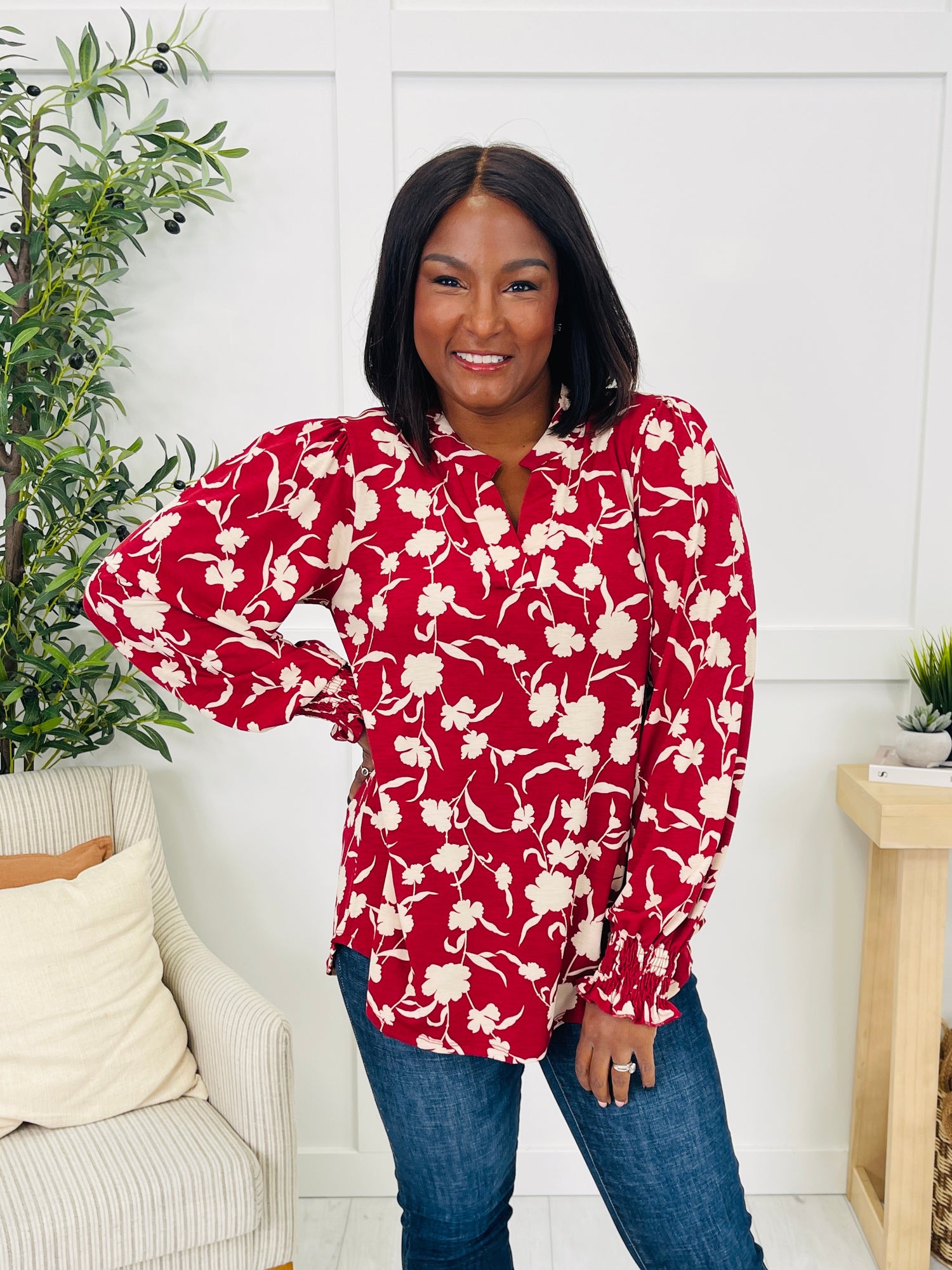 Pretty and polished, this long-sleeve top pairs a rich wine-colored base with an allover floral detailing for a standout look. The split neckline adds a relaxed touch up top, while the curved hem gives extra movement and makes front-tucking easy. Smocked ruffle cuffs finish the sleeves with a soft, feminine detail.
