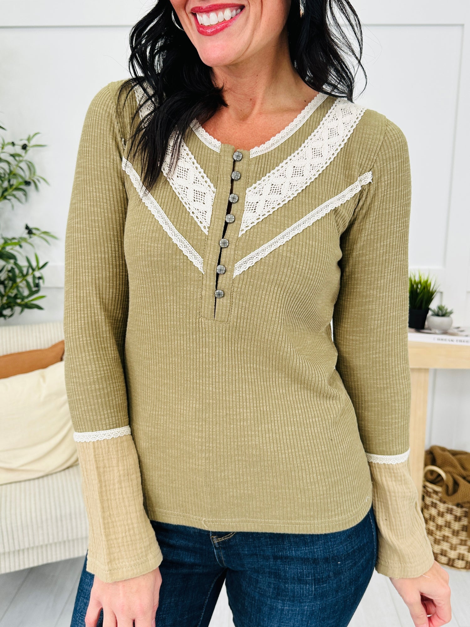 This charming top blends feminine touches with everyday ease. The delicate lace trim along the neckline and shoulders adds a soft, vintage-inspired feel, while the button front detail brings classic appeal. Finished with contrast cuffs for an extra hint of style, this piece is perfect for creating a polished yet cozy look.