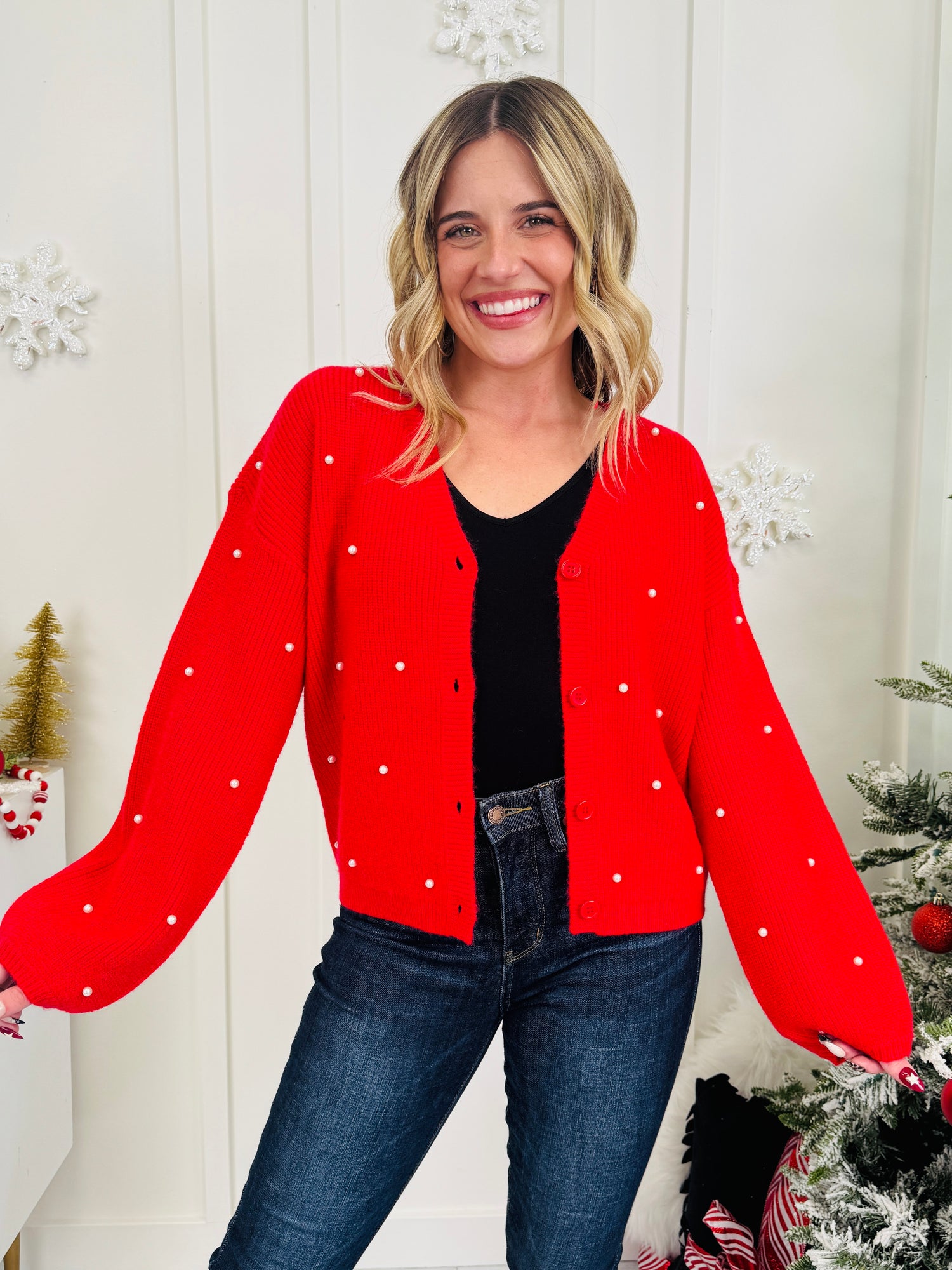 Add a touch of elegance to your holiday wardrobe and be pretty in pearls all season long. This new holiday arrival combines cozy comfort with timeless charm. Featuring delicate and trendy pearl accents that add the perfect hint of glam, this cardigan is soft, stylish, and oh-so-festive.