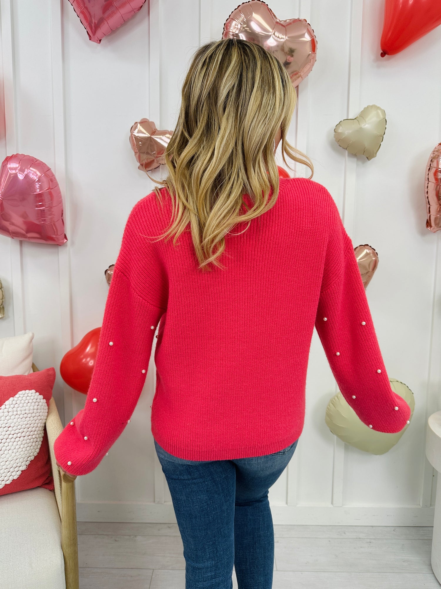 Add a pop of sweetness to your wardrobe with this darling new cardigan that's perfect for Valentine's and year-round wear. Featuring a vibrant pink hue and delicate pearl embellishments throughout, this knit brings just the right mix of playful and polished. The soft, cozy fabric and classic button-front design make it an easy layering piece you’ll reach for again and again.