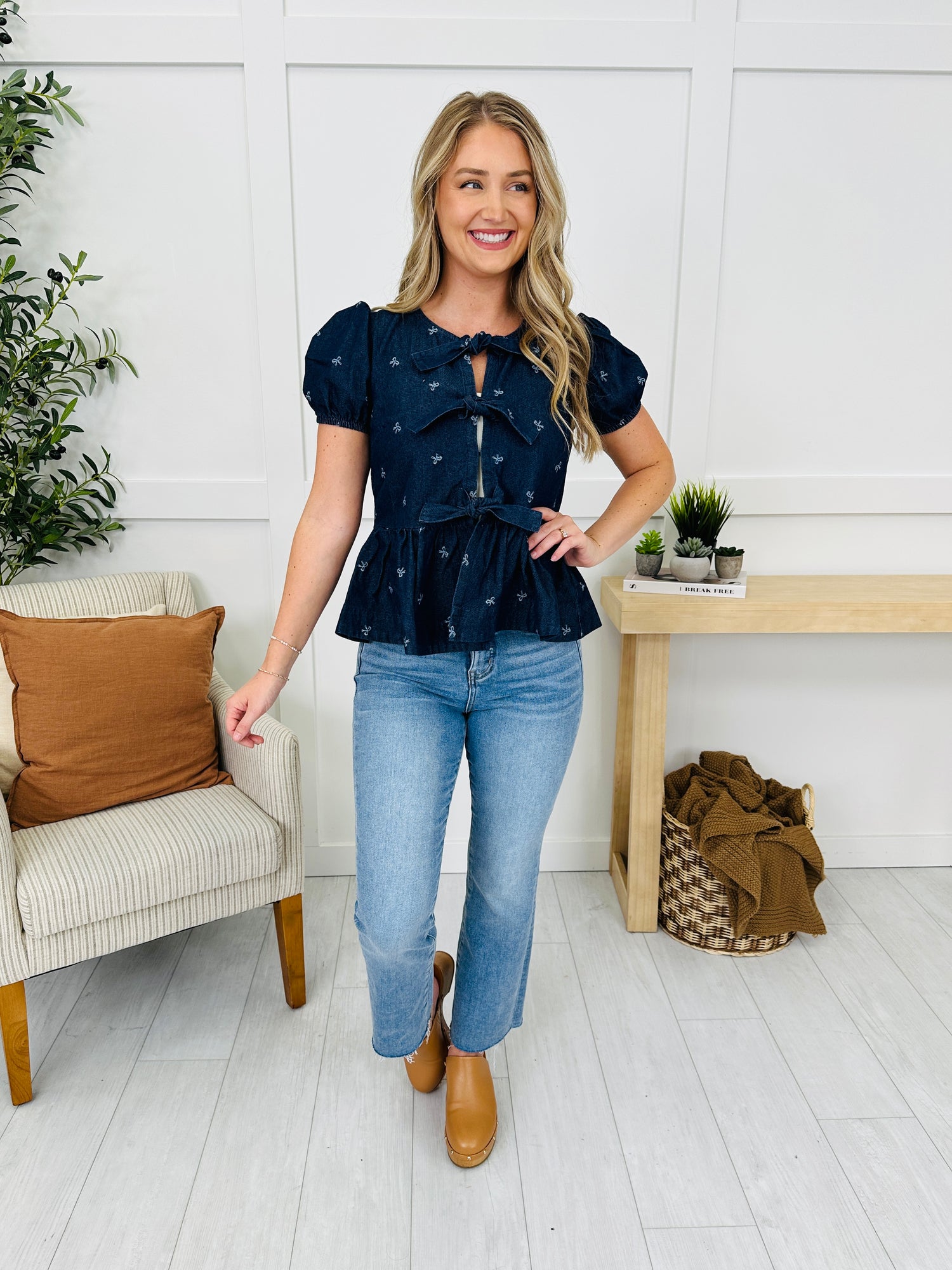 Sweet and statement-making, this top features three front tie bows that create subtle keyhole openings along the center front. The puff short sleeves with elastic cuffs add a touch of volume, while a ruffled hem gives it a soft, feminine finish. An allover bow-embroidered fabric rounds it out with playful detail—perfect with denim for a polished, pretty look.