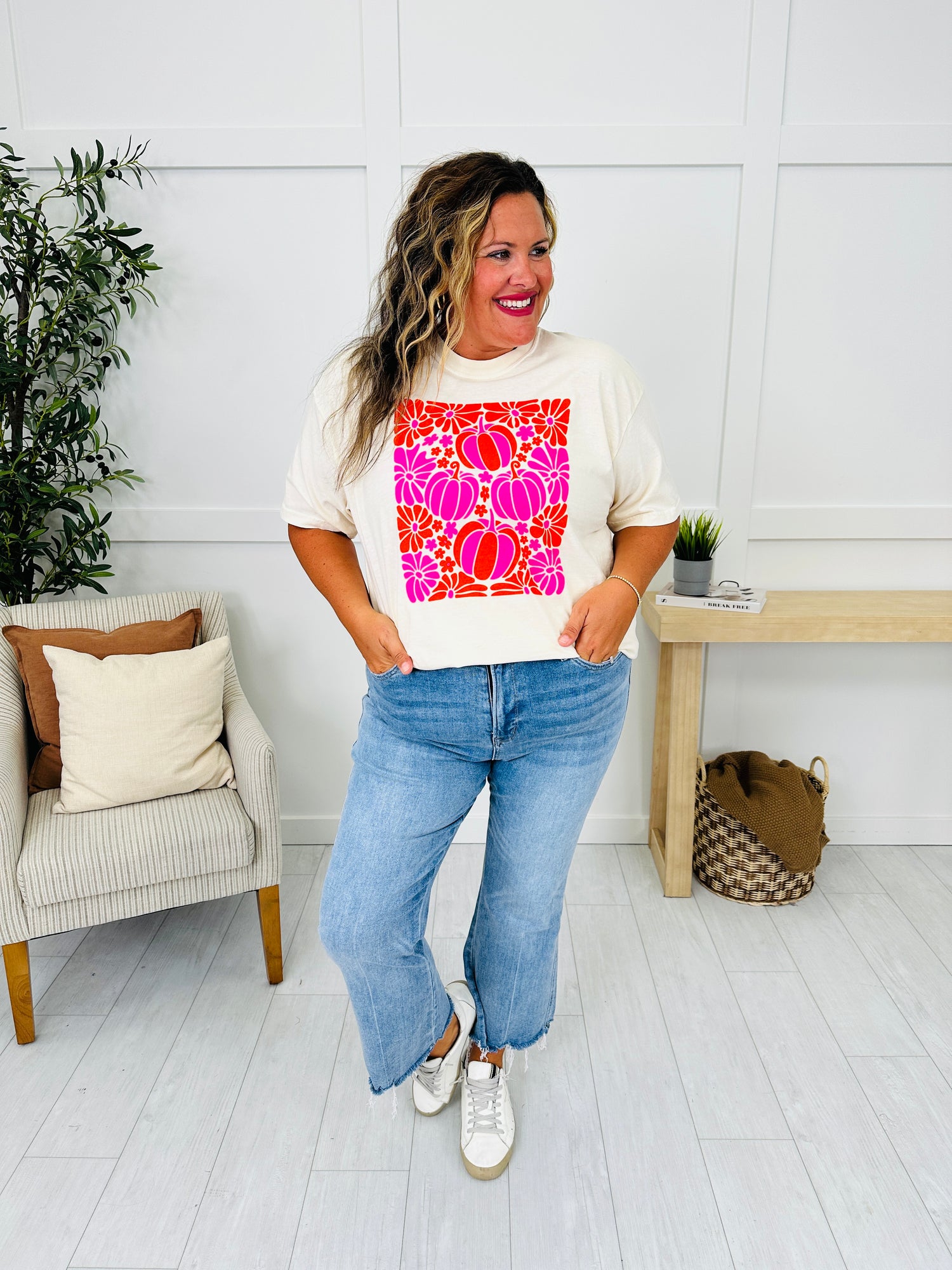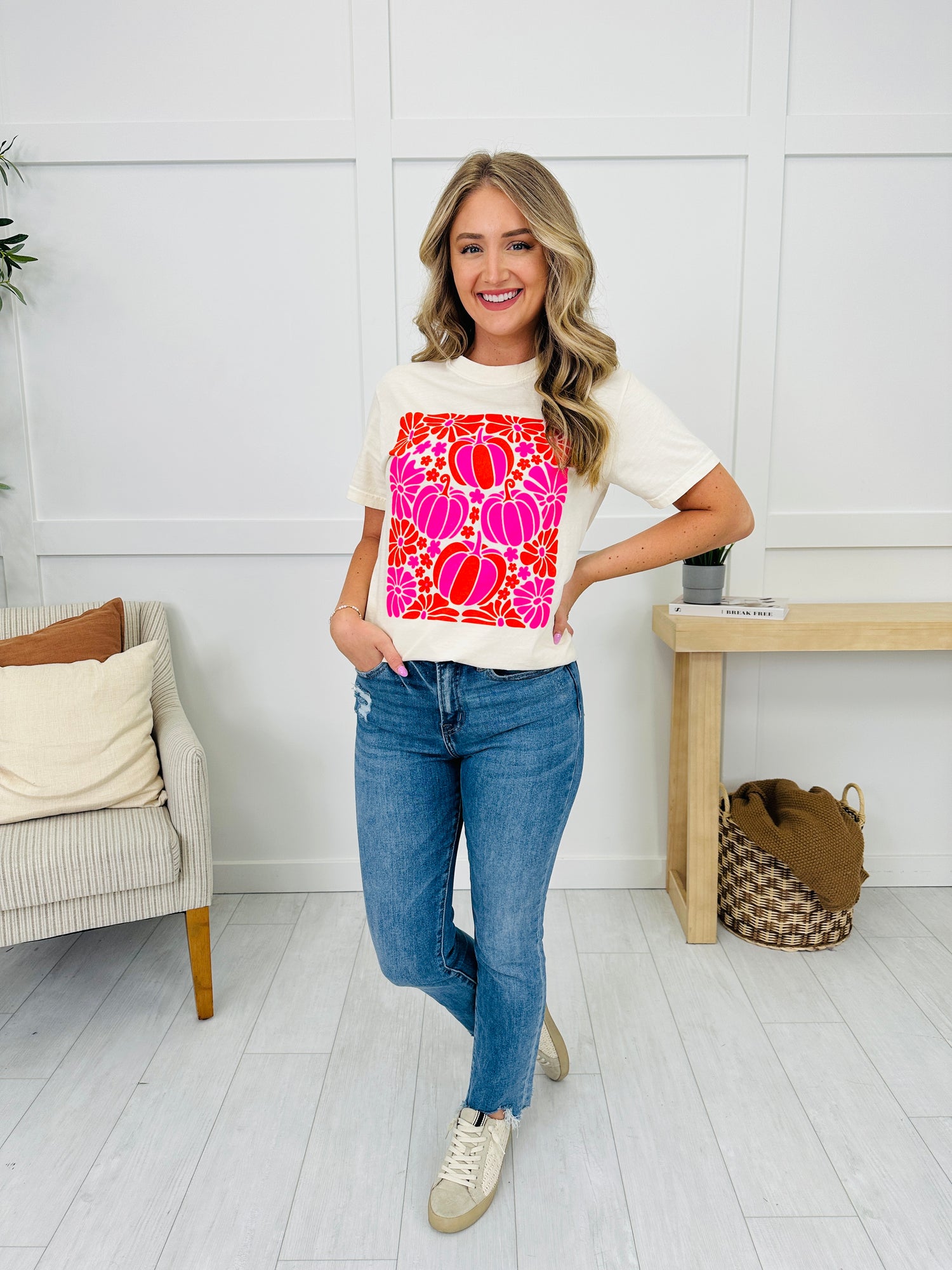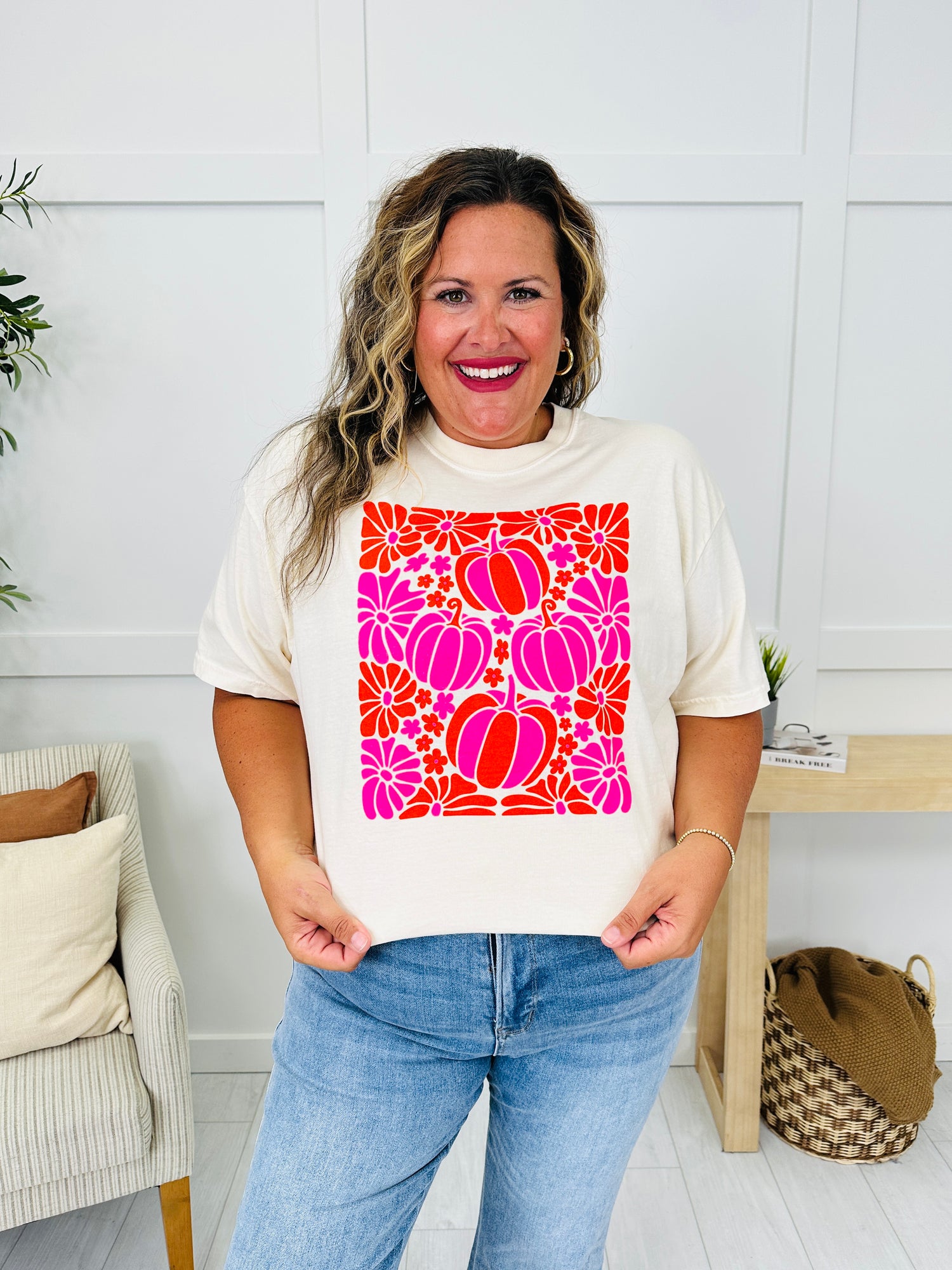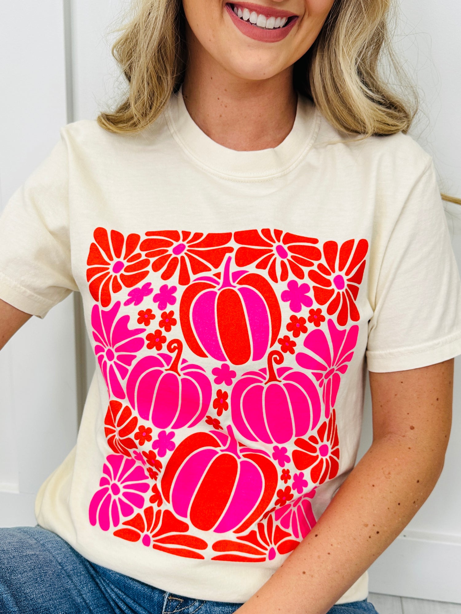 Bring on the fall vibes with this fun and colorful graphic tee! Featuring a bold mix of pumpkins and groovy floral accents in cheerful pinks and oranges, this tee is perfect for everything from pumpkin picking to cozy latte dates. This tee is screen printed in house on a garment dyed soft and comfortable Comfort Colors Tee. Comfy, casual, and totally cute—your new favorite fall top is here!