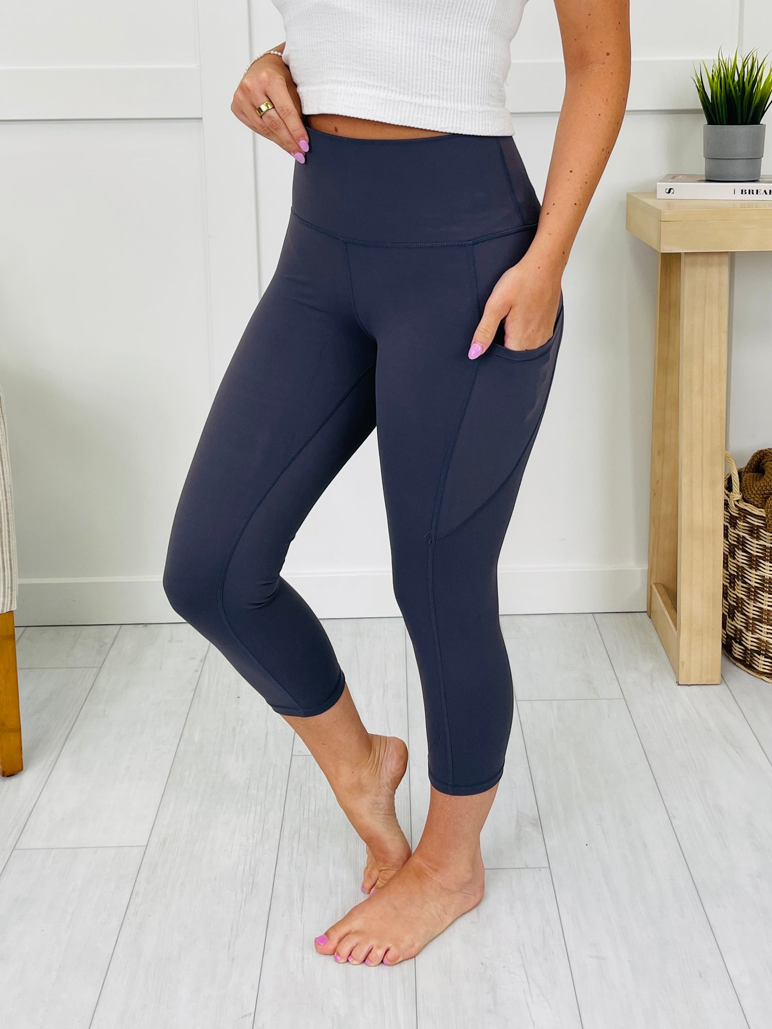 Featuring a straight leg design and capri length, these leggings provide maximum comfort and flexibility. The wide waistband ensures a secure and flattering fit, while the extra soft fabric adds a touch of luxury. Get ready to conquer your fitness goals in style. Style these with a comfy tank top and sneakers for the perfect on the go look, or change it up and wear them with a graphic tee!