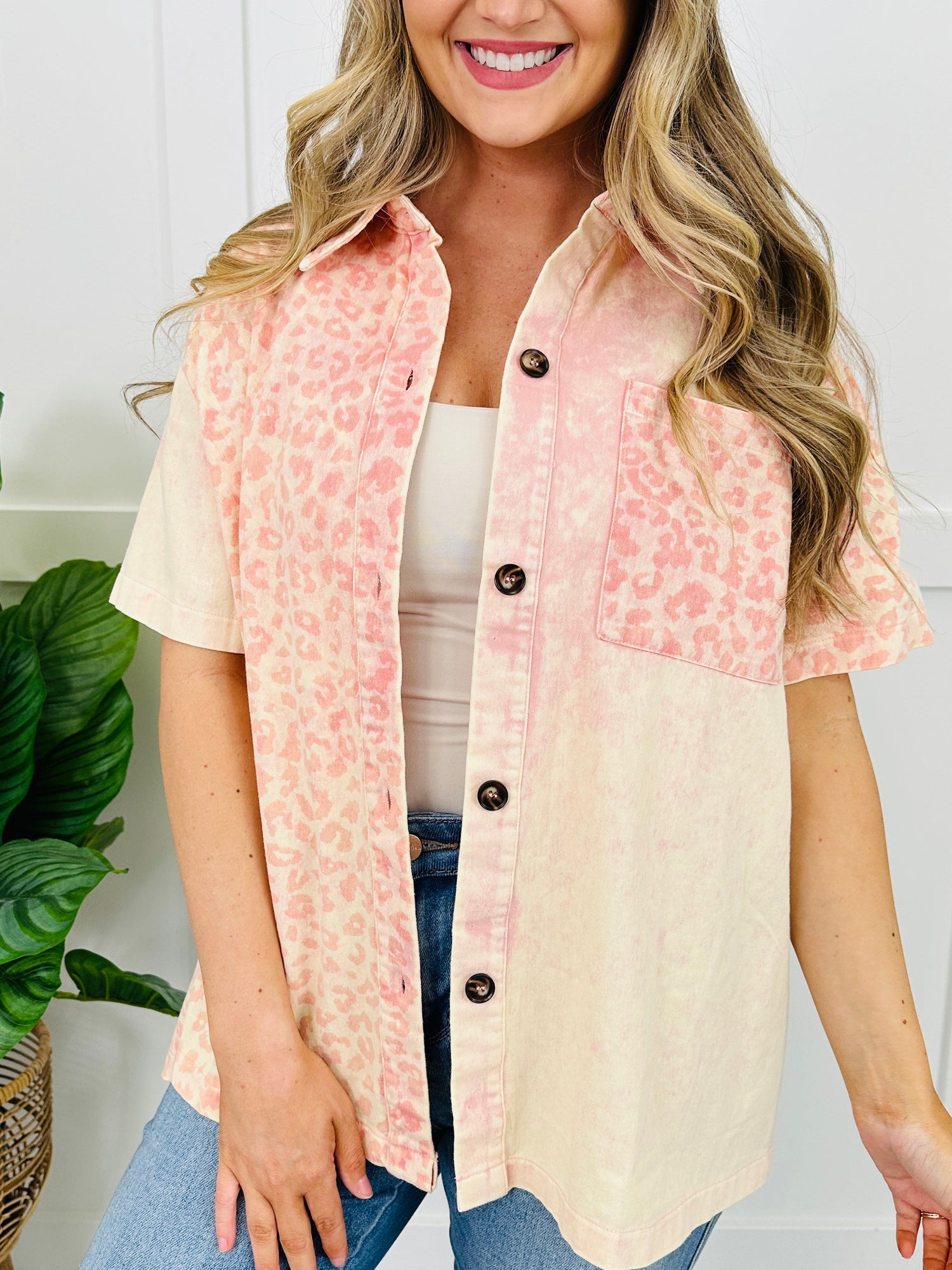 This button-front top features a clean collared neckline with a structured placket for an easy, polished look. The mixed-panel design pairs solid sections with subtle animal-print accents, while the front chest pocket adds a classic finishing touch.