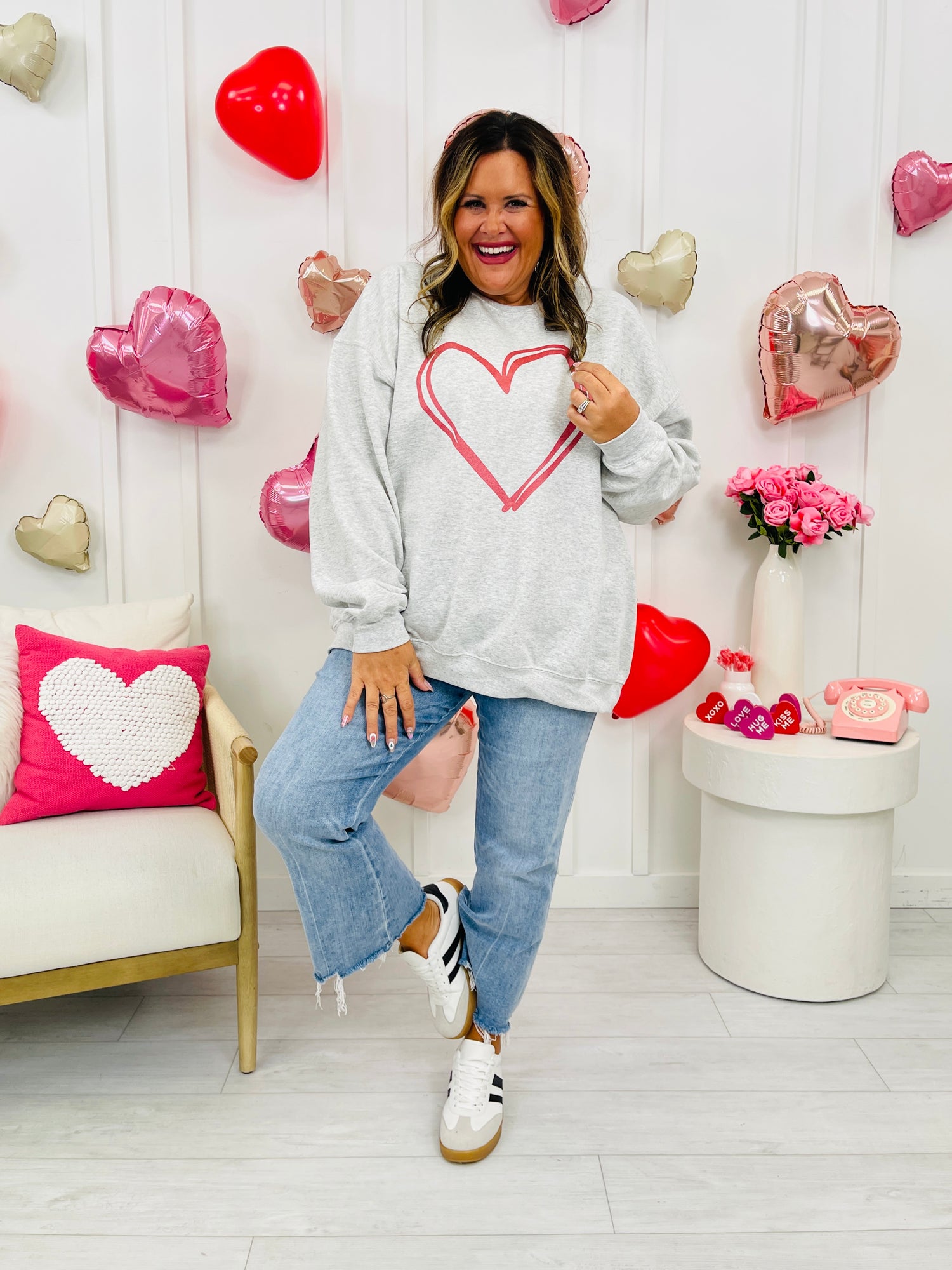 This new crewneck is screen printed in house for long lasting wear. This cozy grey colored sweatshirt is the ideal pick for Valentine’s season and beyond. Whether you’re dressing it up for a date night, keeping it casual for a girls’ day, or lounging at home with your favorite snacks, this piece delivers comfort, cuteness, and effortless charm in every wear.