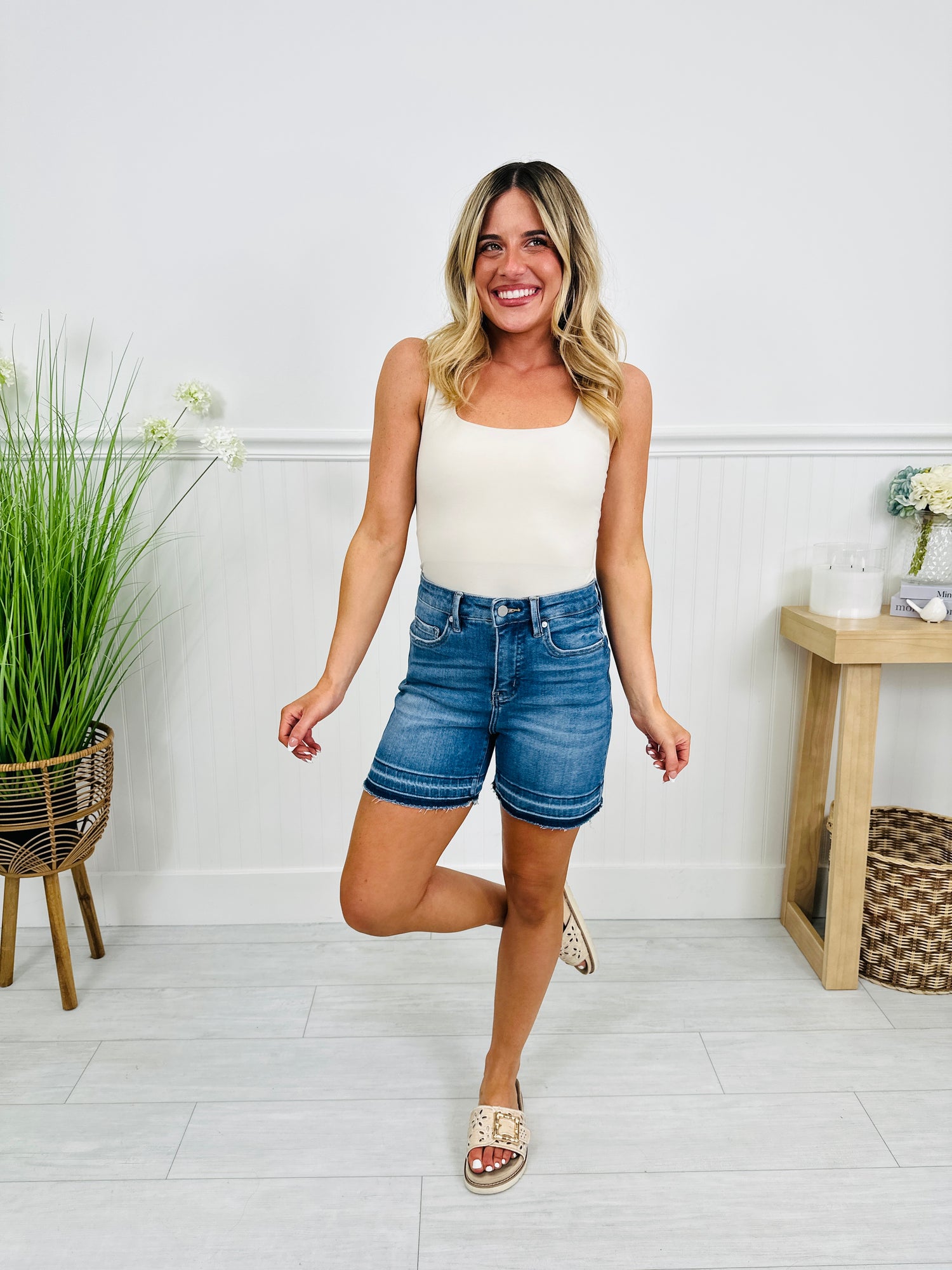 Featuring a flattering high rise and a built-in tummy control panel, these shorts smooth and support in all the right places for a confidence-boosting fit. The soft, stretchy denim moves with you, while the relaxed fit keeps things easy and comfortable.