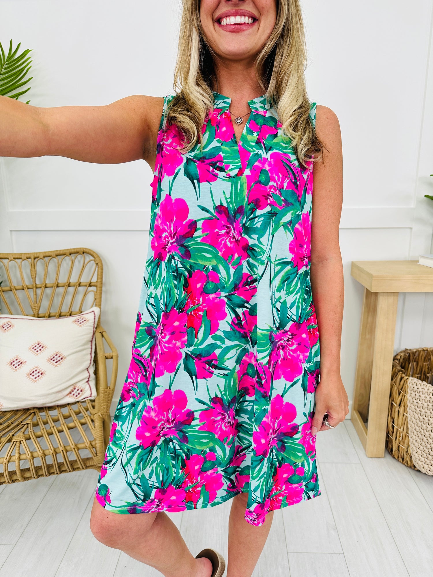 The Palms and Plans dress is officially our best selling dress this season. It's made form our best selling wrinkle material, which is cool to the touch and perfect for warmer weather! Our customers rave about this amazing material! This dress is flowy and flattering on every single body type. Did we mention it has pockets? This dress is so versatile, too! You can dress it up to brunch, church, wedding showers, and other events, and because it is wrinkle free, you can also throw it in bag and use it has a bathing suit cover up.