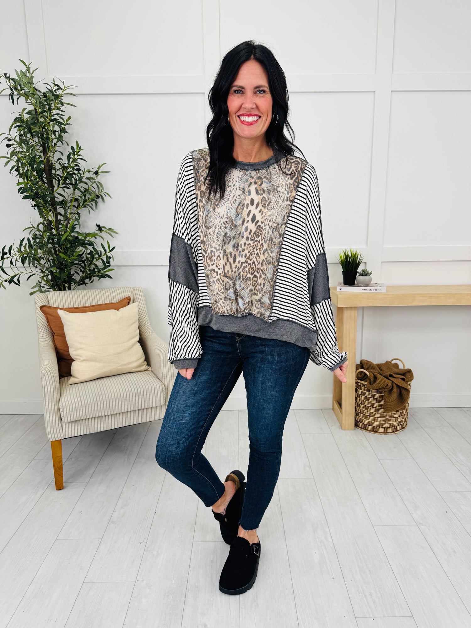 This unique top mixes patterns and textures in the best way, with an animal print front standing out against striped panel design for a playful yet polished look. The contrasting reverse stitch trim ties it all together while adding just the right amount of detail. Perfect for days when you want something casual with a creative twist, this top makes everyday dressing feel fresh and fun.