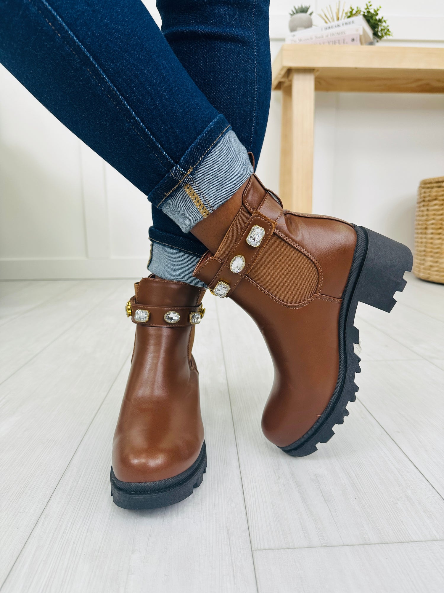 These stylish ankle boots are perfect for adding a touch of glam to your everyday outfits. Featuring statement gemstone accents across the strap, they combine chic elegance with rugged durability. The chunky, comfortable heel makes these boots perfect for both style and function, ensuring you can walk with confidence while looking fashionable.