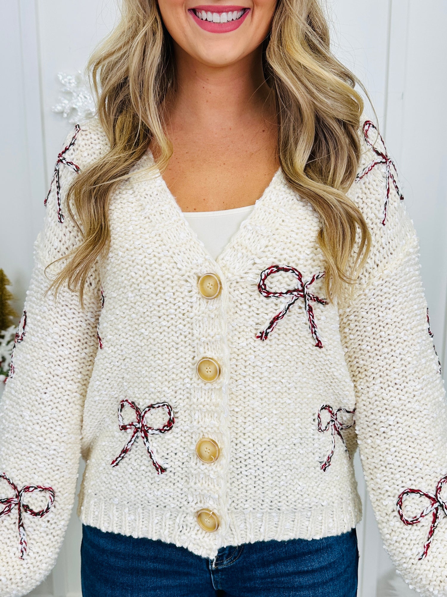 This sweet and festive cardigan is full of charming details you’ll love! The textured knit fabric creates a cozy look and feel, while the button front detail adds a classic touch. Finished with 3D bow accents throughout, it’s the perfect blend of playful and timeless for the holiday season and beyond.