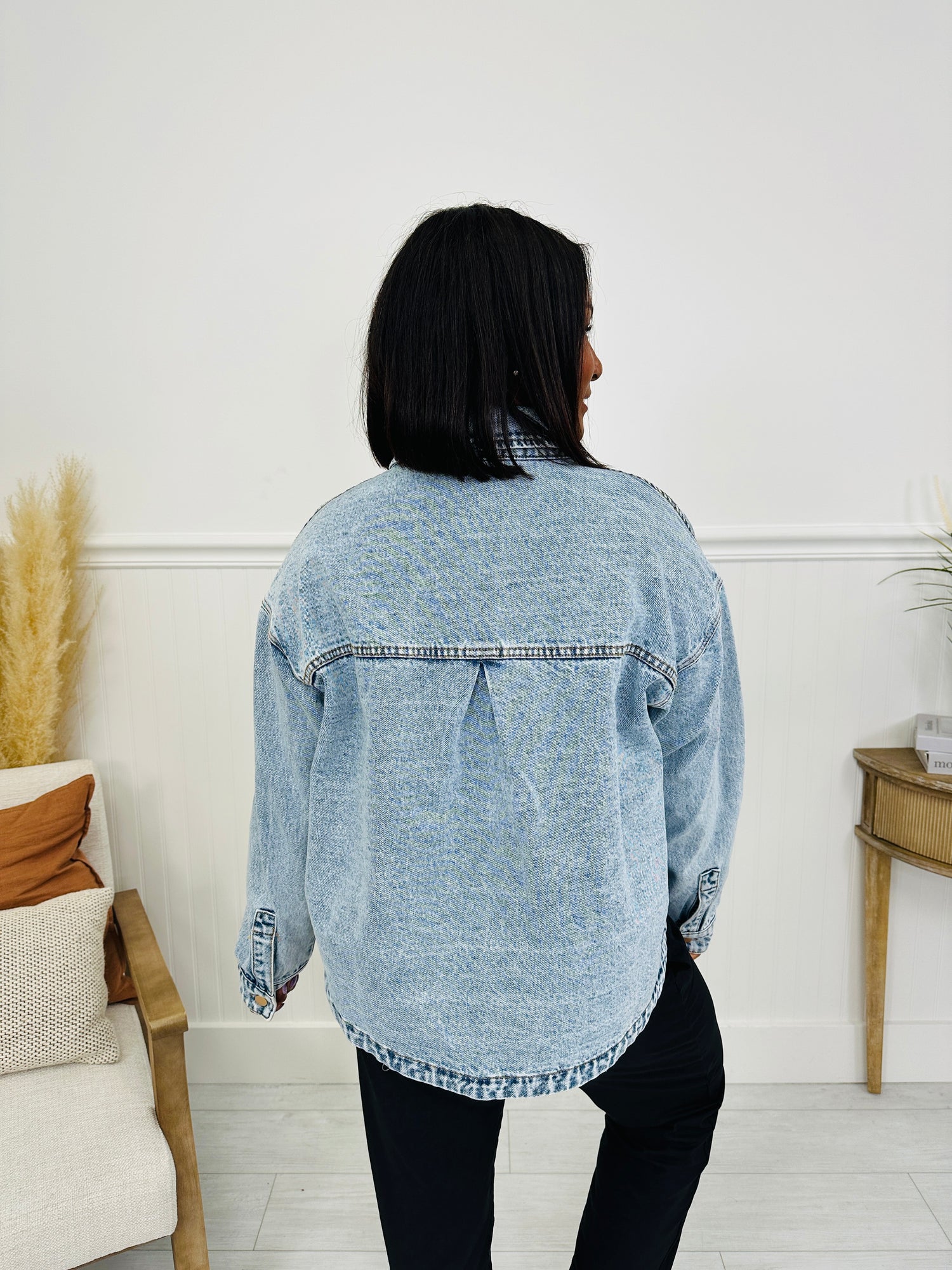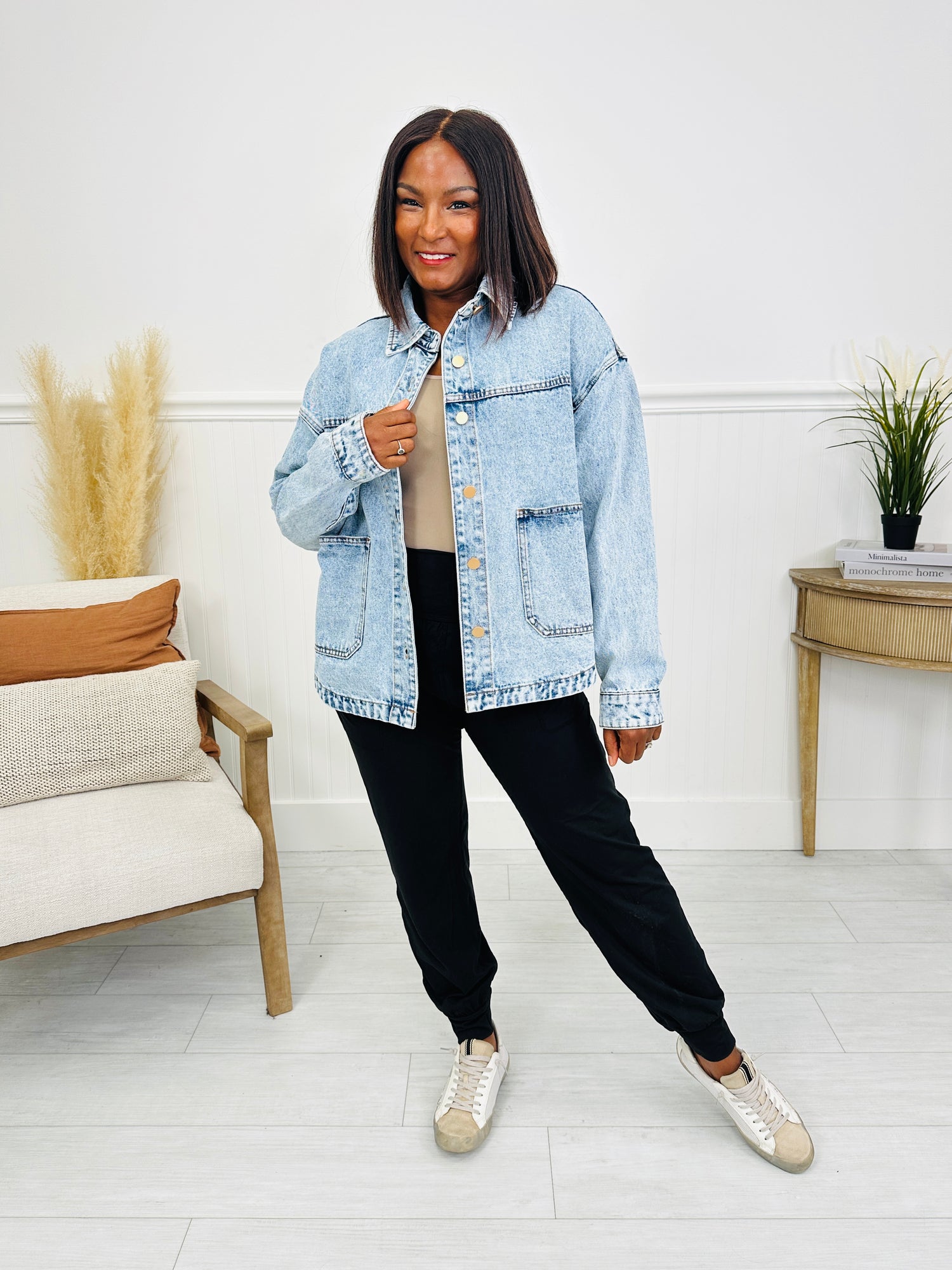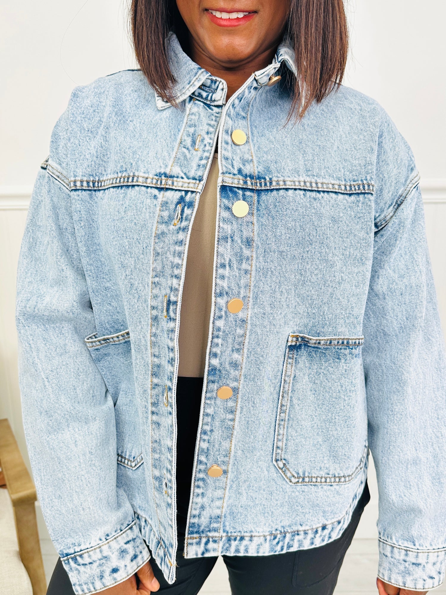 This denim jacket is a staple piece you'll reach for again and again. Crafted from classic denim with a button front closure and functional front patch pockets, it combines effortless style with everyday practicality. Layer it over anything from casual tees to cozy sweaters for an easy, laid-back finish.