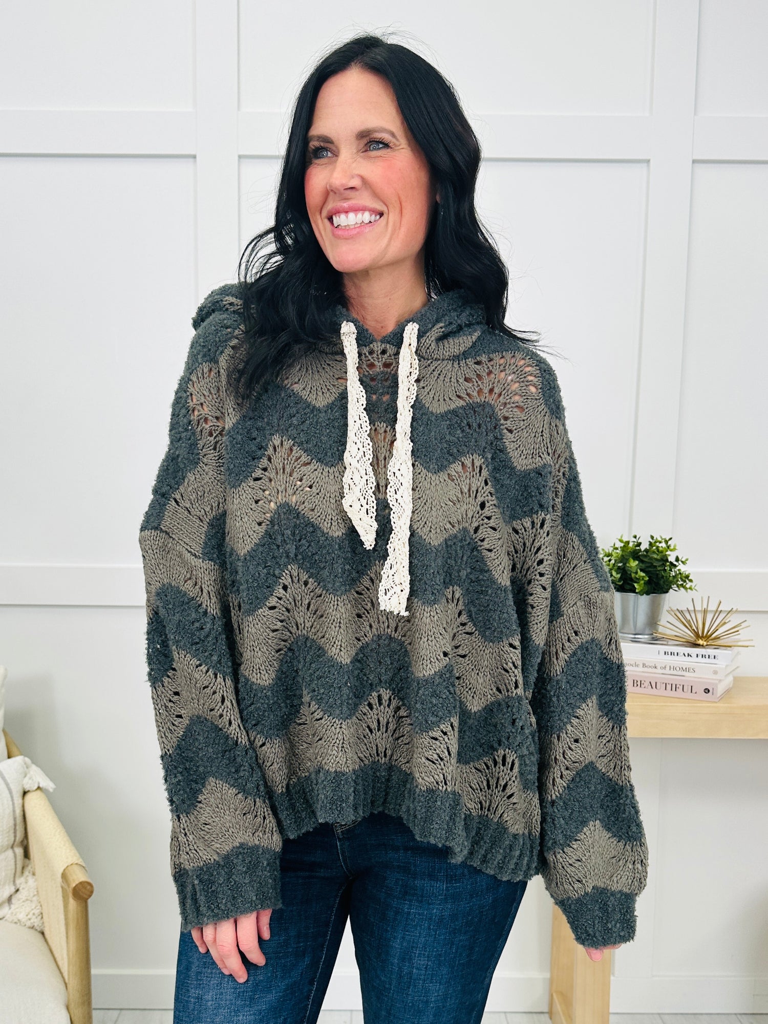 This relaxed fit hoodie combines cozy comfort with a stylish textured chevron knit pattern. The soft, chunky knit is perfect for layering on cooler days, while the crochet drawstring adds a unique touch to the hood. With its relaxed fit and neutral tones, it's an easy-to-style piece that pairs effortlessly with jeans or leggings for a chic, casual look.