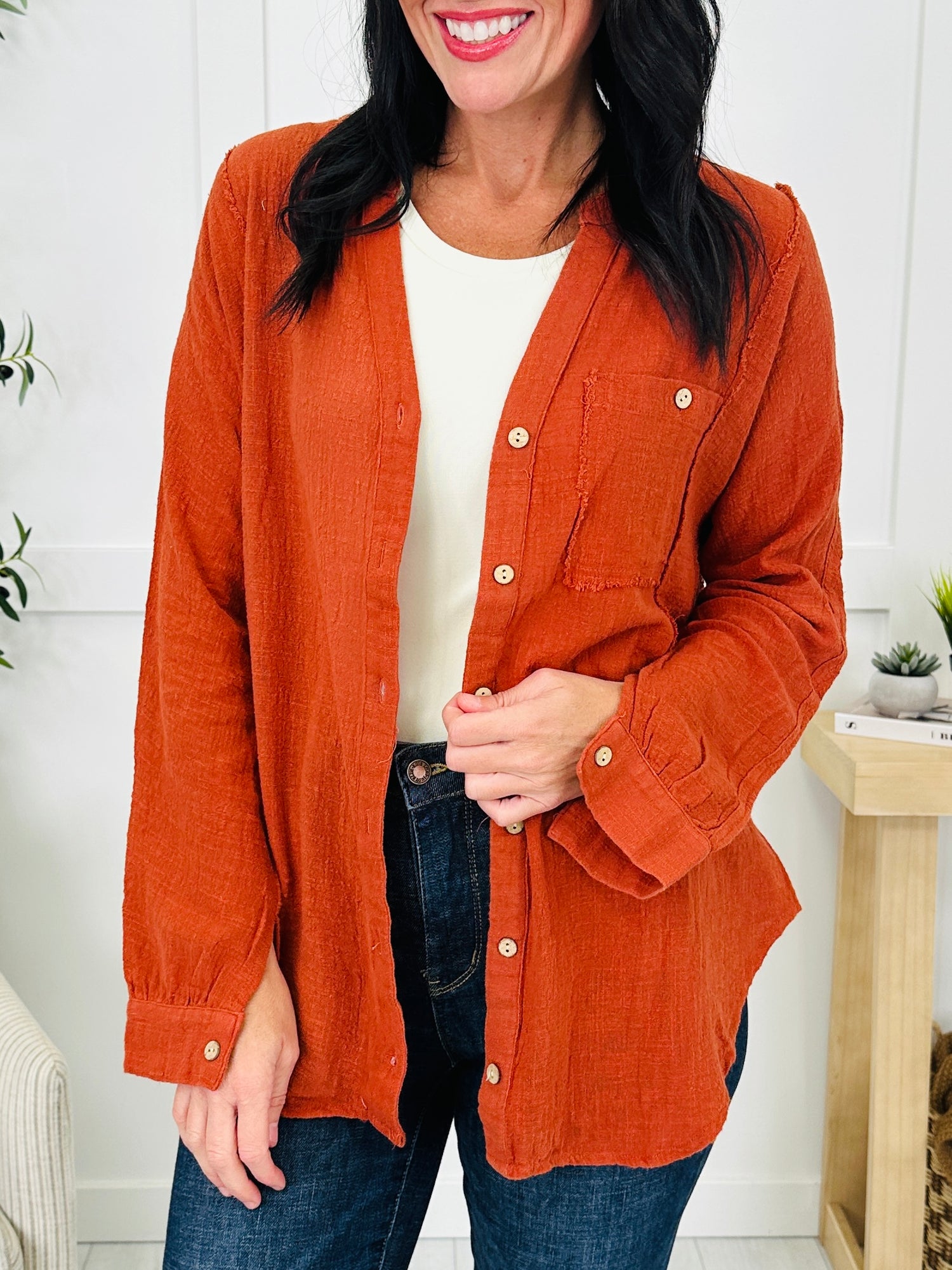 This versatile button-down top is the perfect addition to your wardrobe with its classic fit and effortless style. Featuring a chest pocket and frayed edge details, this top pairs easily with jeans or leggings for a laid-back look. Available in multiple colors, it’s a casual yet stylish piece that transitions seamlessly between seasons.