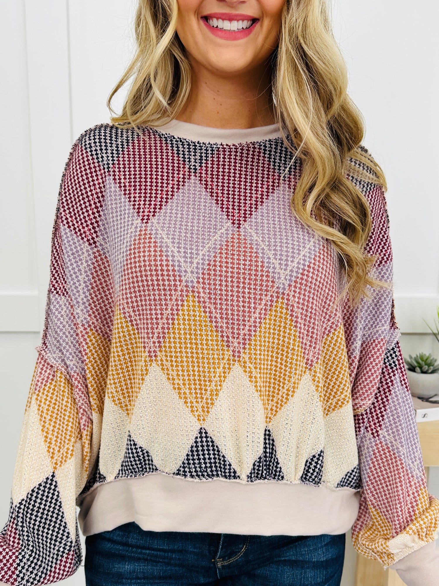 This cozy knit top brings together a bold diamond pattern in rich, warm colors, making it a standout piece in any wardrobe. The soft, textured fabric provides a comfortable fit, while the relaxed shape ensures easy layering for casual style. Whether paired with jeans or leggings, this top adds a playful and stylish twist to any look.