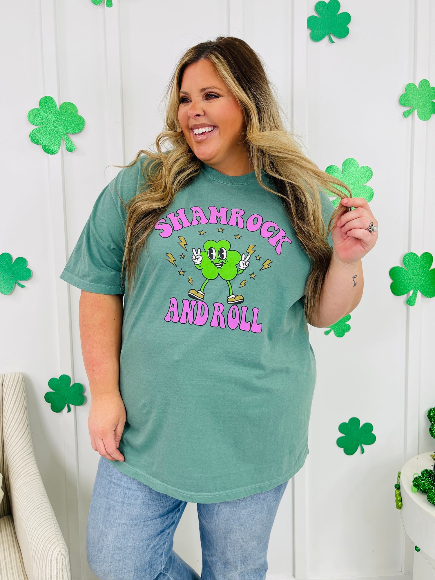 Bring a playful, rockstar-ready vibe to your everyday look with the Shamrock and Roll tee — a fun, festive design that’s made to stand out. The groovy lettering, cute shamrock character, and little lightning bolt details (made from glitter paint!) give it that bold, energetic feel that’s perfect for St. Patrick’s Day season (and any day you’re feeling a little extra).