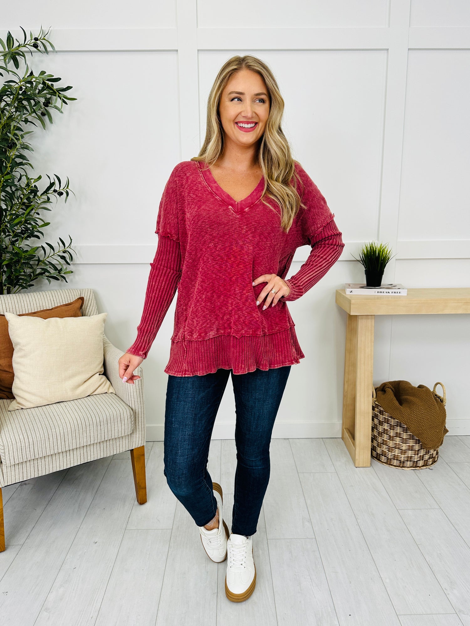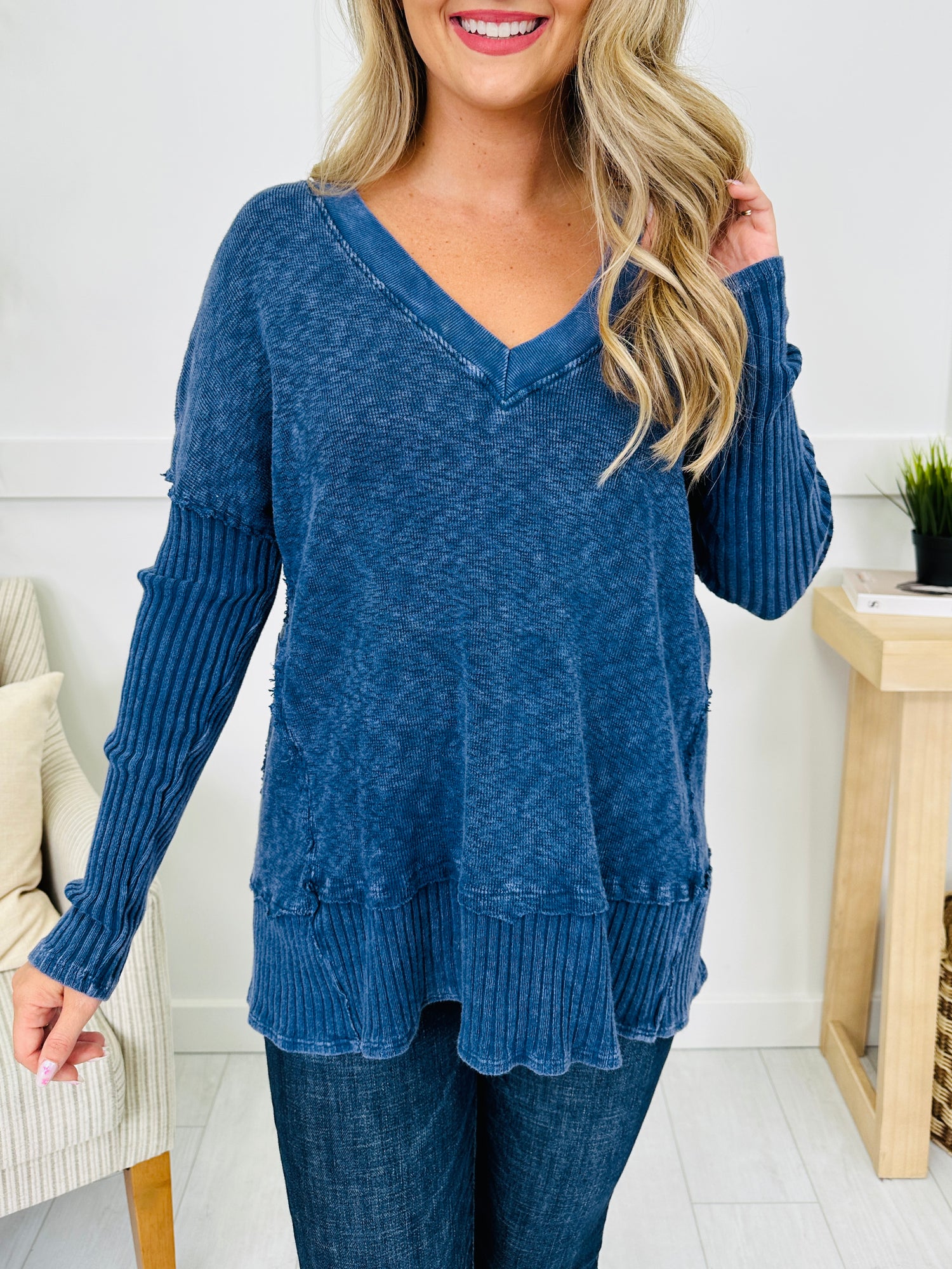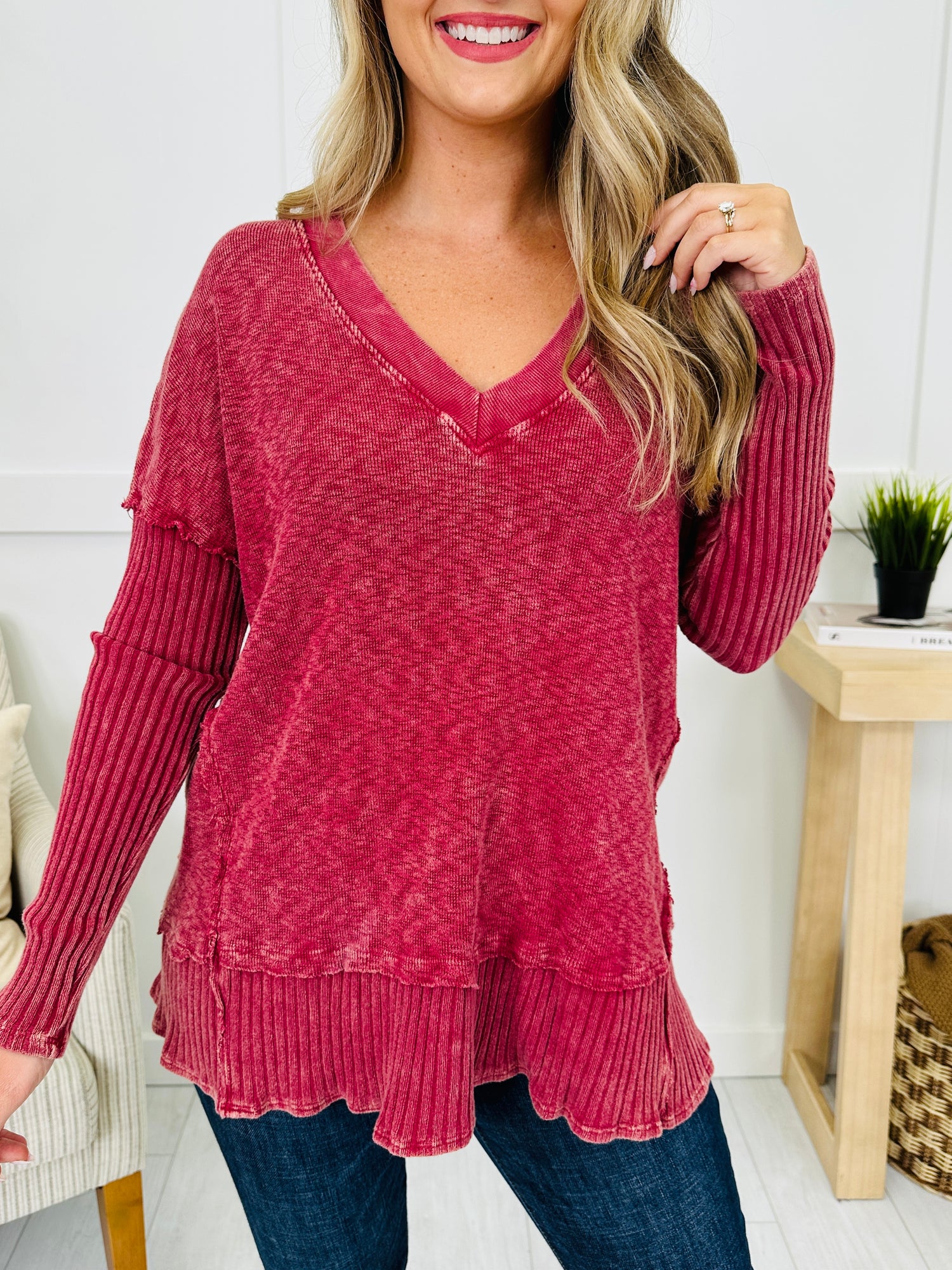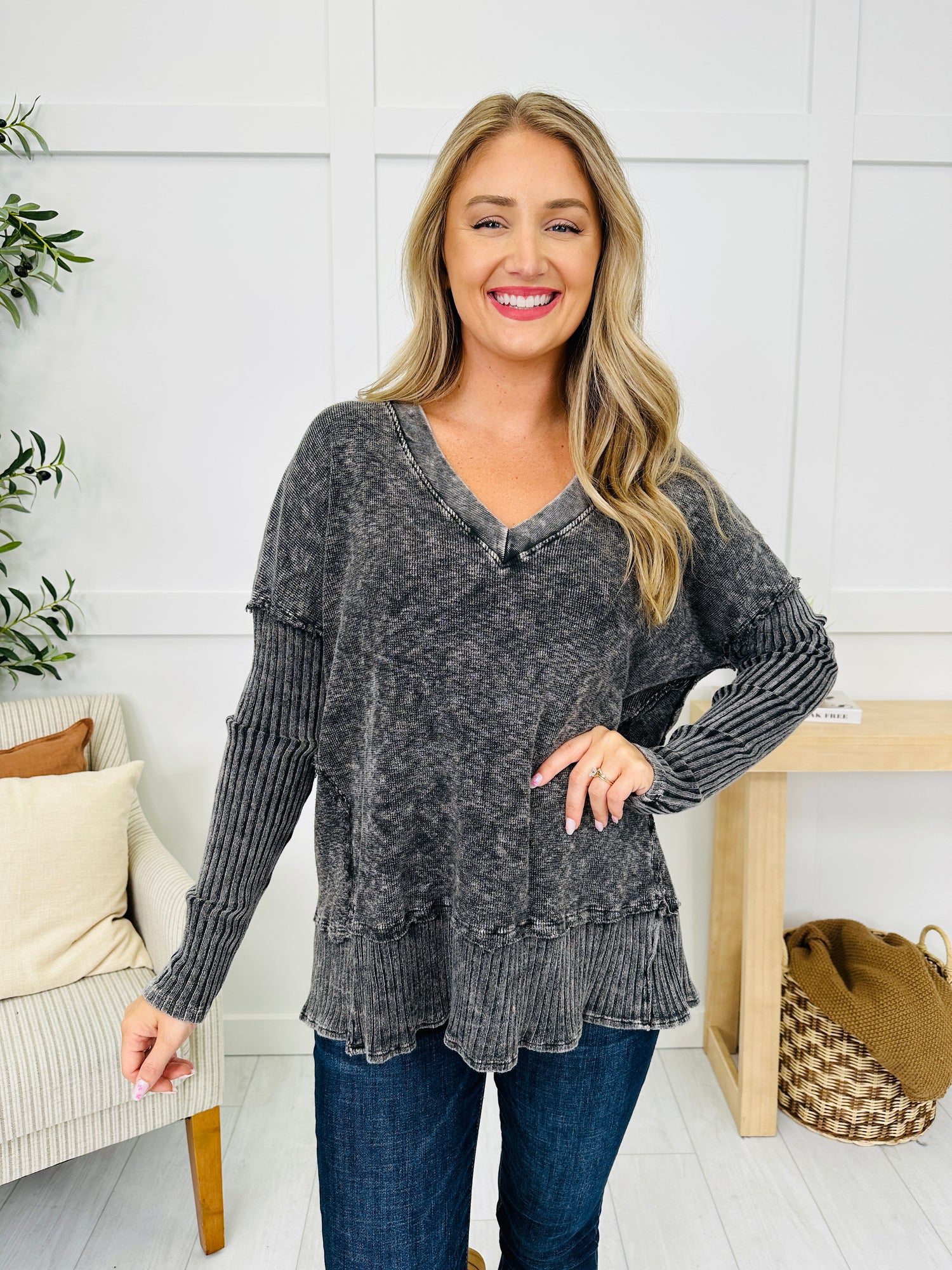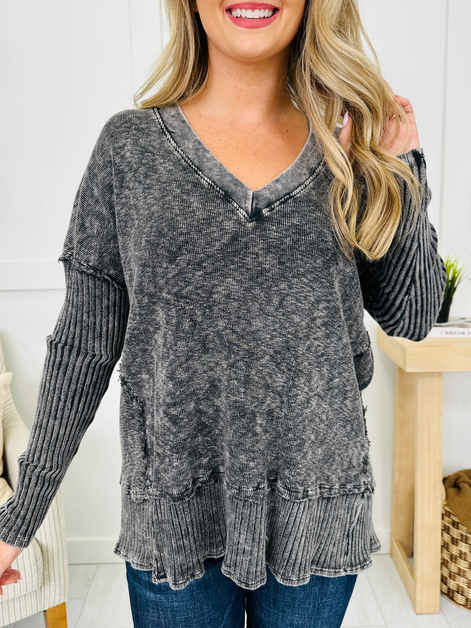 A relaxed knit body pairs with fitted textured knit sleeves for that effortless, throw-on feel. The V-neckline and exposed seam touches add a casually lived-in vibe, while the reverse stitch finishes with a soft scalloped edge that drapes beautifully. Just add denim and go—this top brings texture and shape without trying.