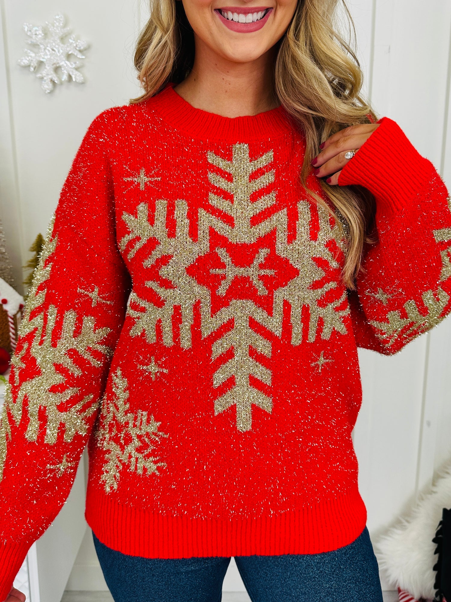 Shine bright this holiday season with this stunning red sweater! Featuring large gold snowflake designs with metallic shimmer throughout, it’s the perfect way to add sparkle to your winter wardrobe. The bold color and eye-catching pattern make it ideal for festive gatherings, cozy nights in, or simply spreading cheer wherever you go.