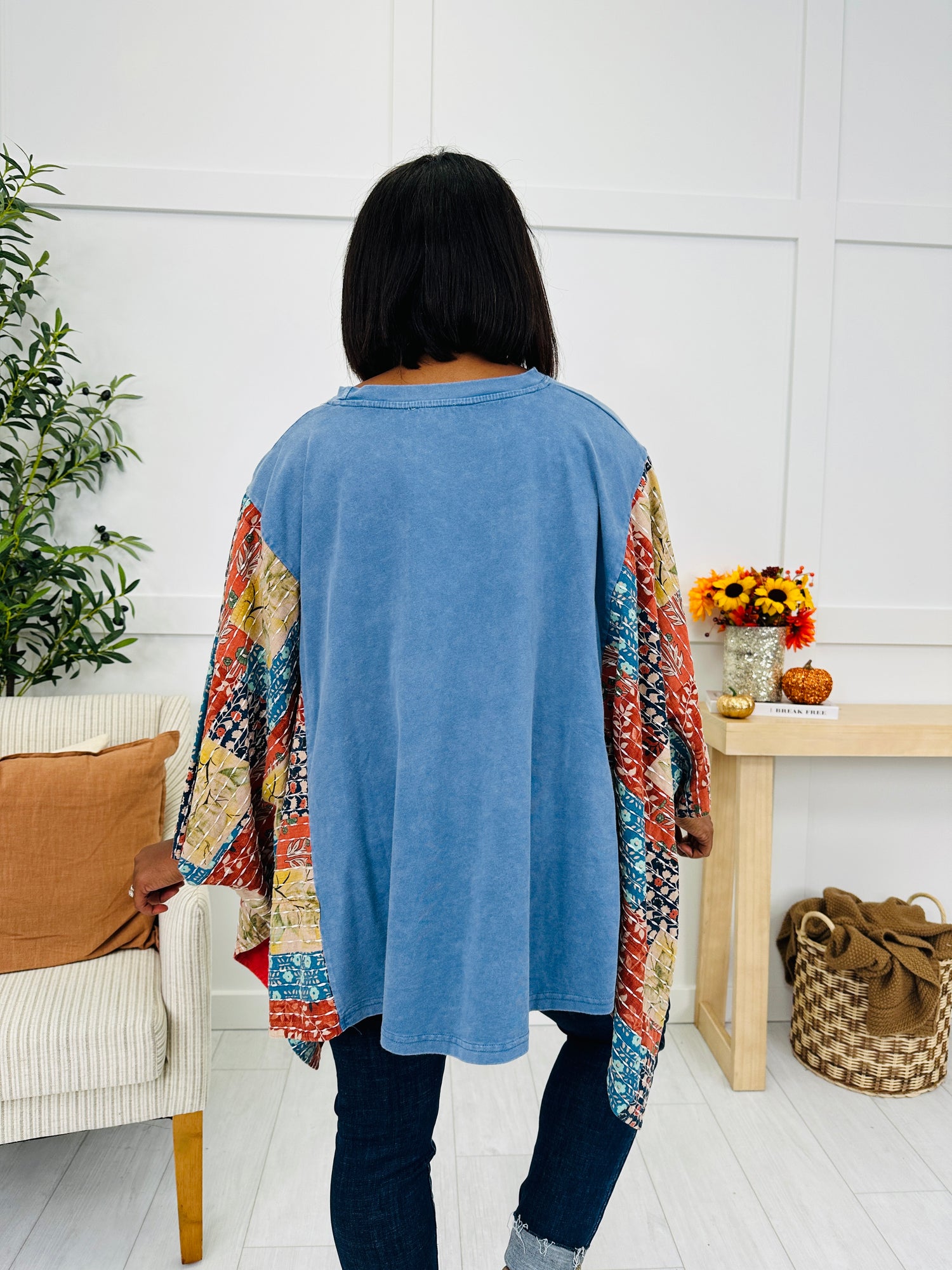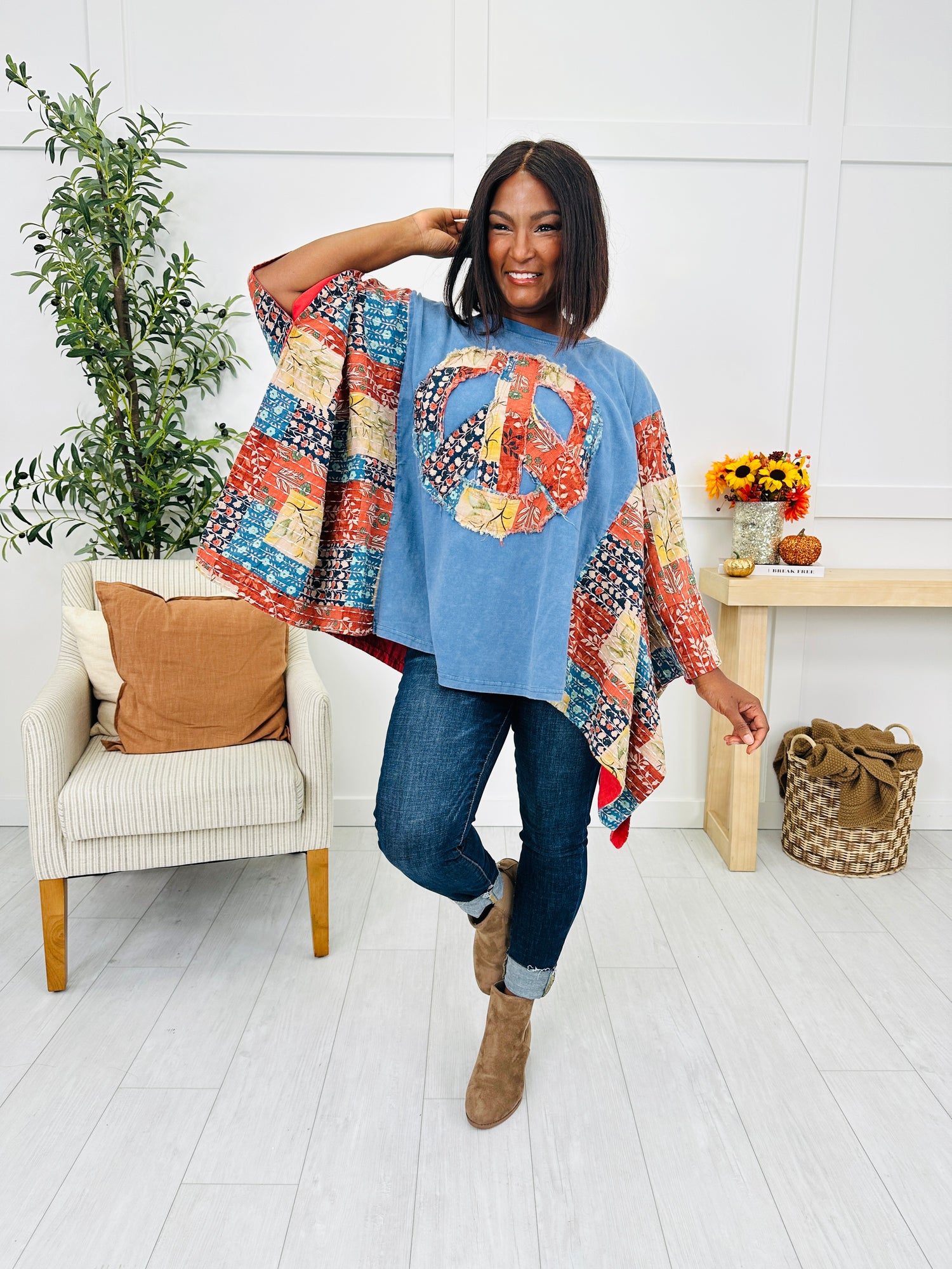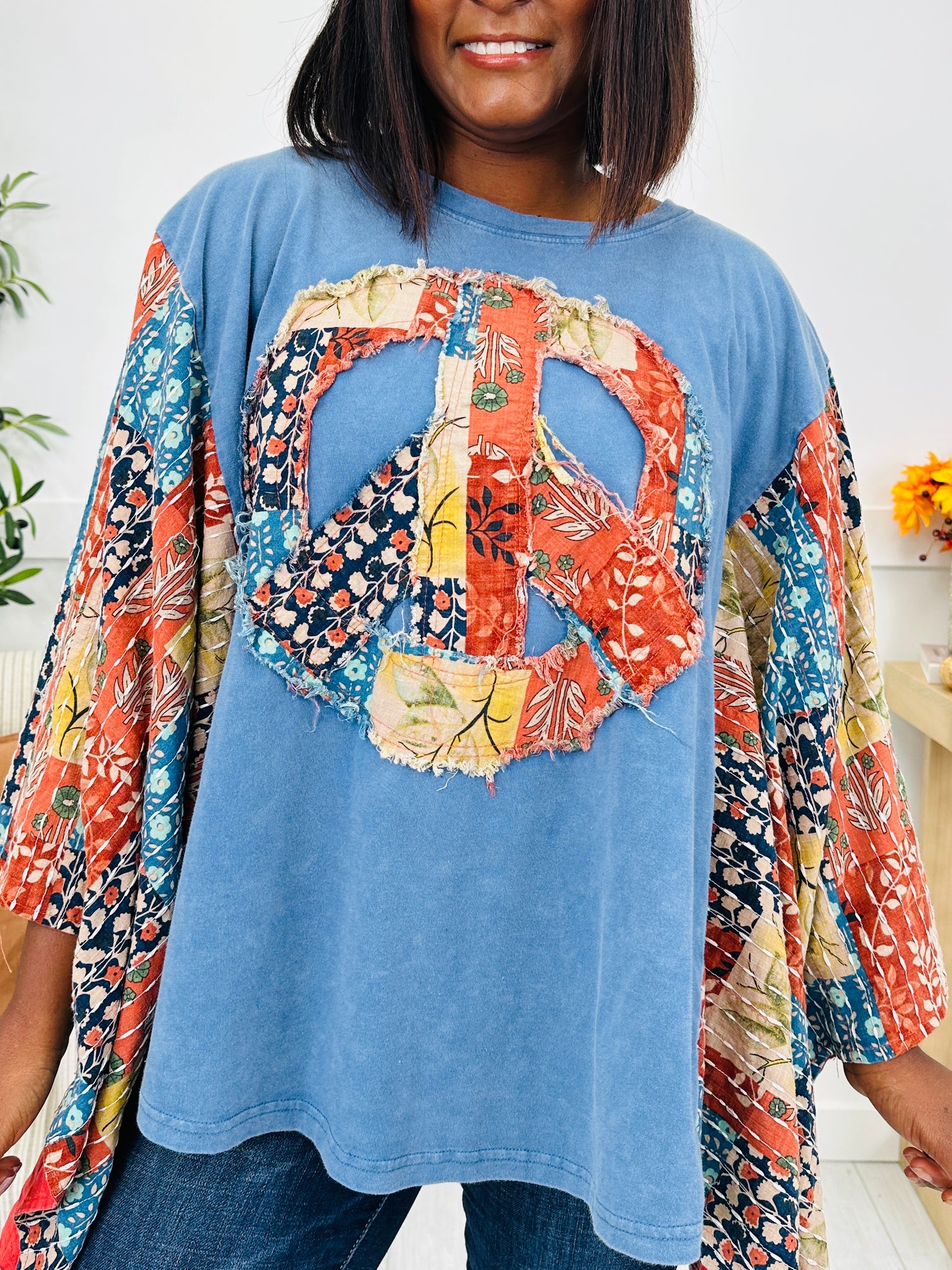 This eye-catching top brings all the boho charm with its vibrant patchwork peace sign and coordinating patterned sleeves. The flowing, open sleeve design adds a playful touch and gives it that relaxed, carefree vibe. With its soft washed blue base and bold mixed prints, this statement piece is perfect for adding color and personality to your look.