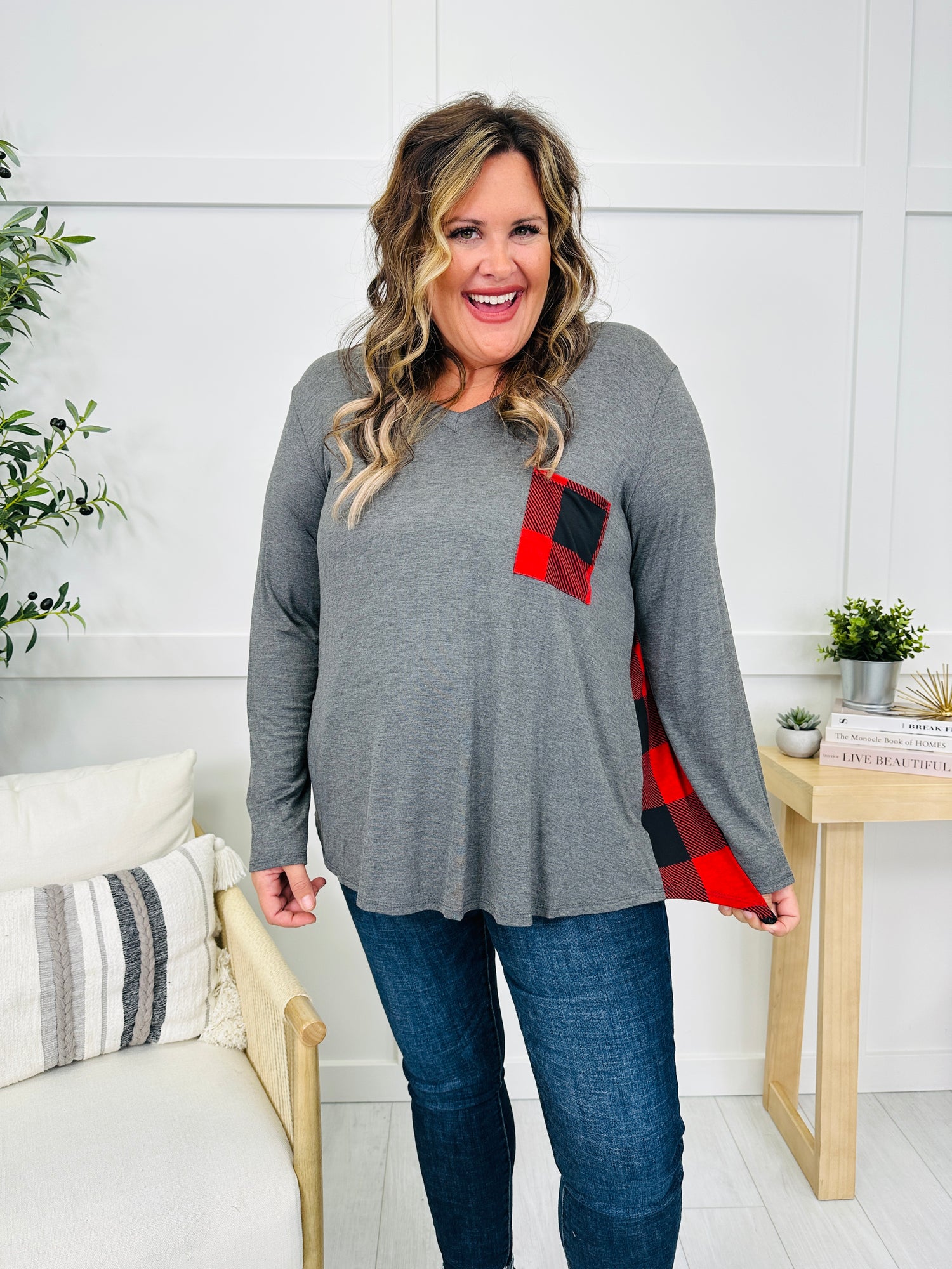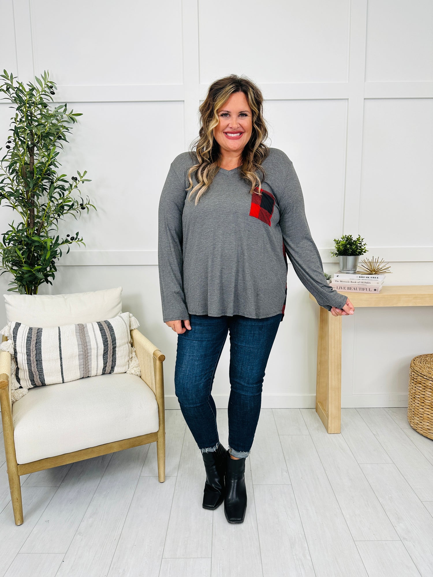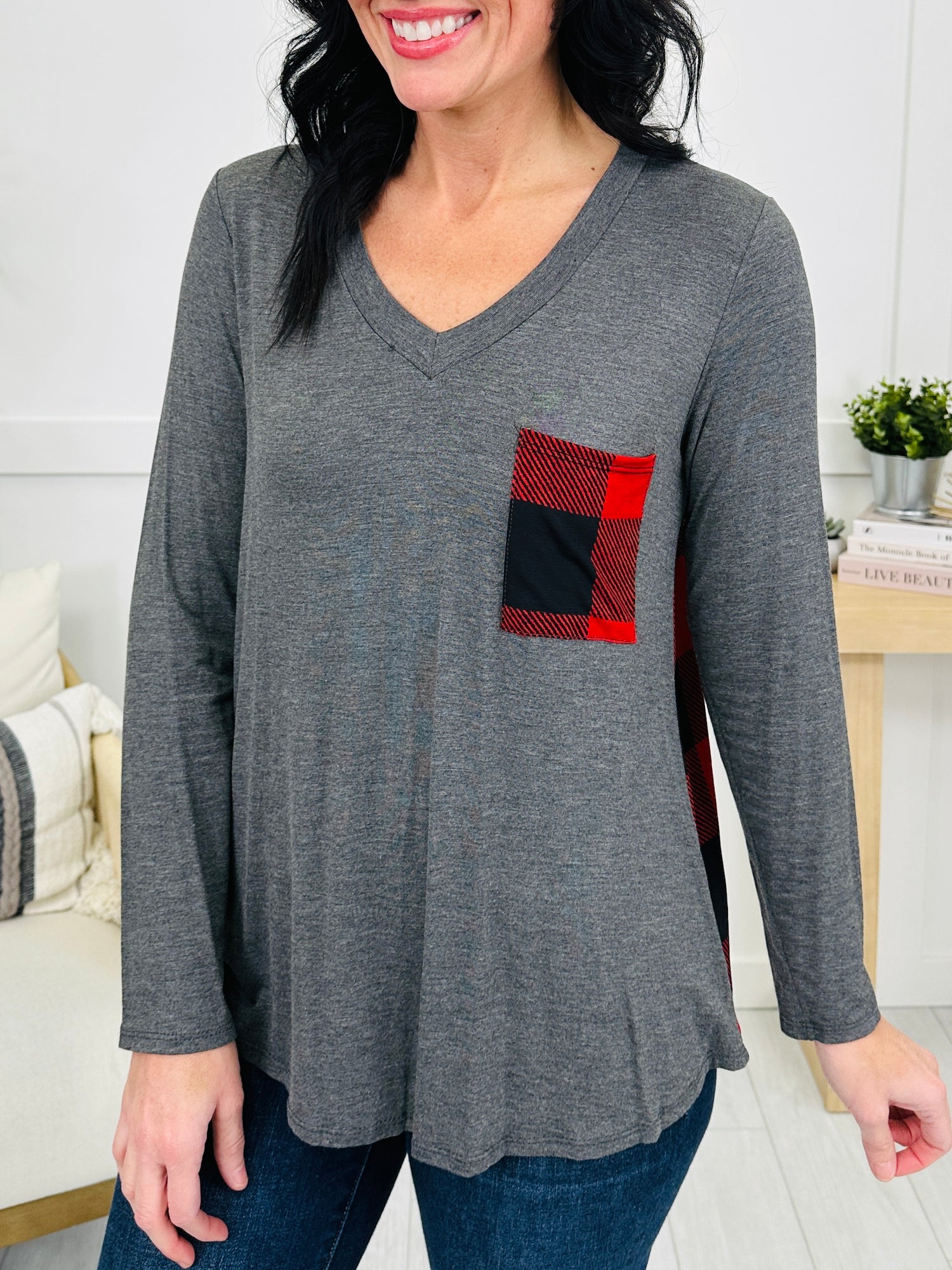 A playful blend of solid and buffalo plaid creates a standout contrast that instantly elevates this top while keeping it effortless for everyday wear. The front chest pocket adds a touch of pattern up top, tying in perfectly with the printed side panels for a coordinated, eye-catching look. Finished with a comfortable, easy silhouette, this piece pairs beautifully with denim for a fun take on casual styling.
