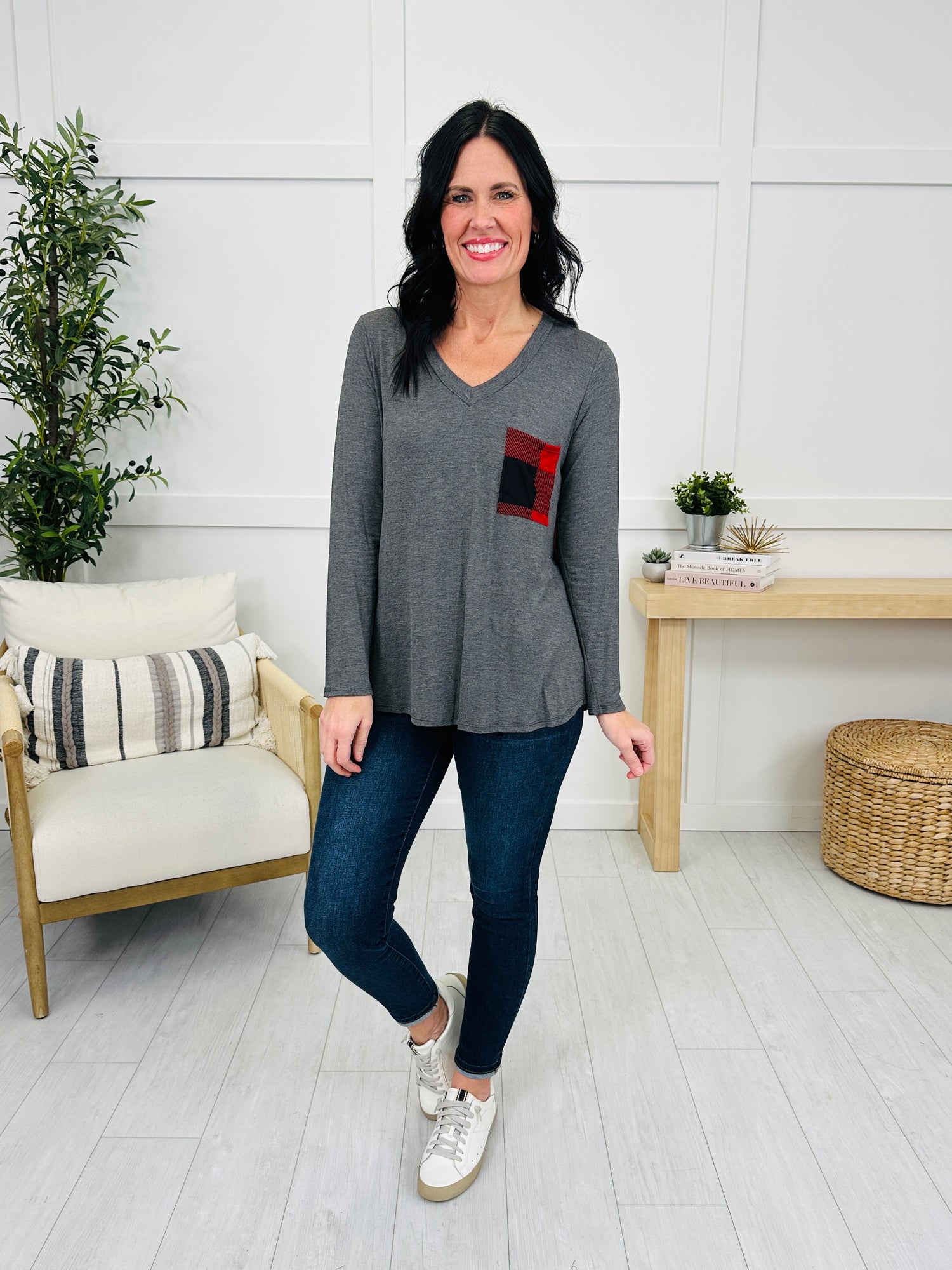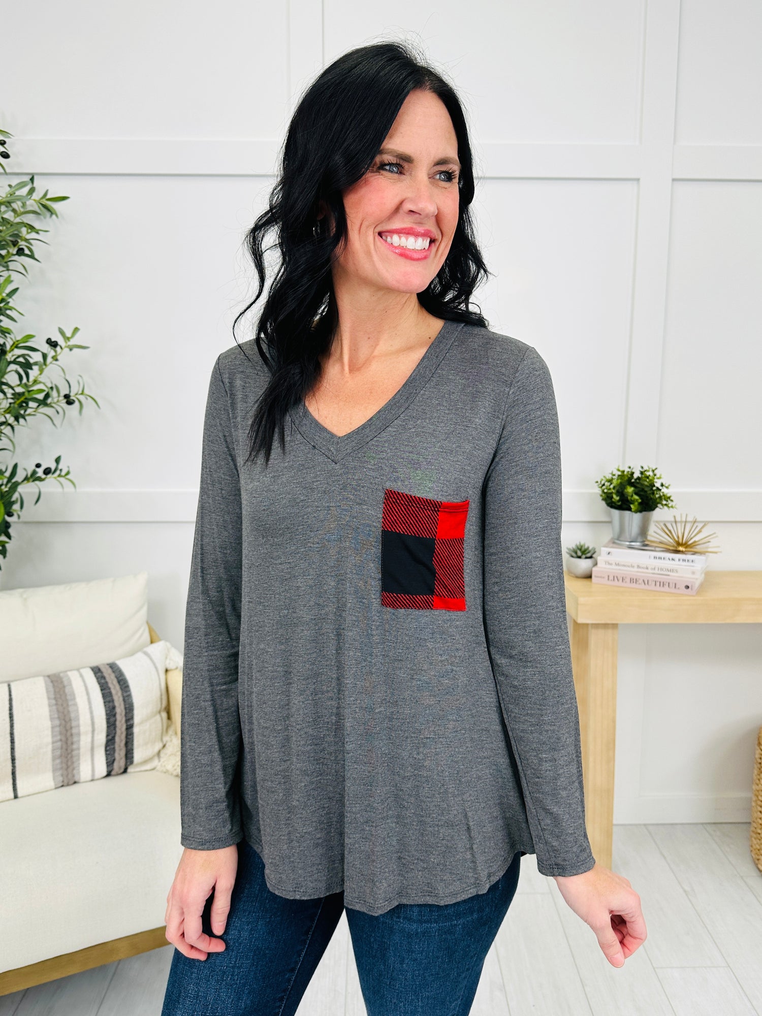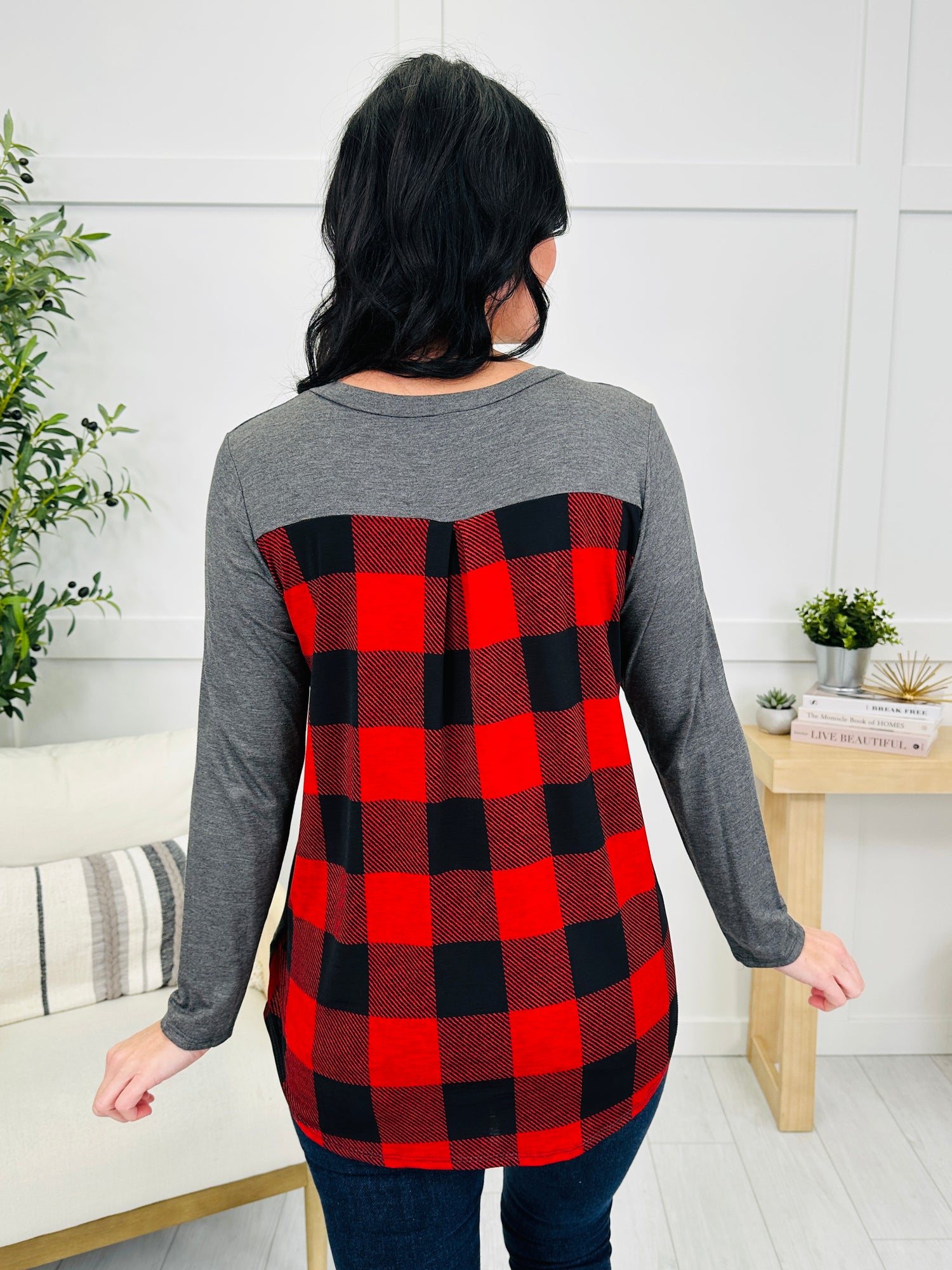 A playful blend of solid and buffalo plaid creates a standout contrast that instantly elevates this top while keeping it effortless for everyday wear. The front chest pocket adds a touch of pattern up top, tying in perfectly with the printed side panels for a coordinated, eye-catching look. Finished with a comfortable, easy silhouette, this piece pairs beautifully with denim for a fun take on casual styling.