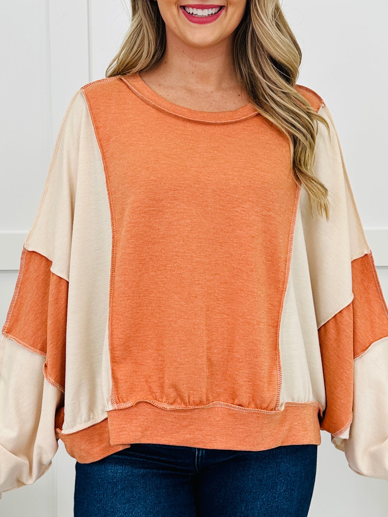 Turn heads with this striking top that mixes stunning seasonal colors with trendy modern details. You'll love how the relaxed silhouette and billowy lantern sleeves make it effortlessly comfy while still standing out. Finished with exposed seam detailing throughout, it brings an edgy yet fun vibe to your everyday look.