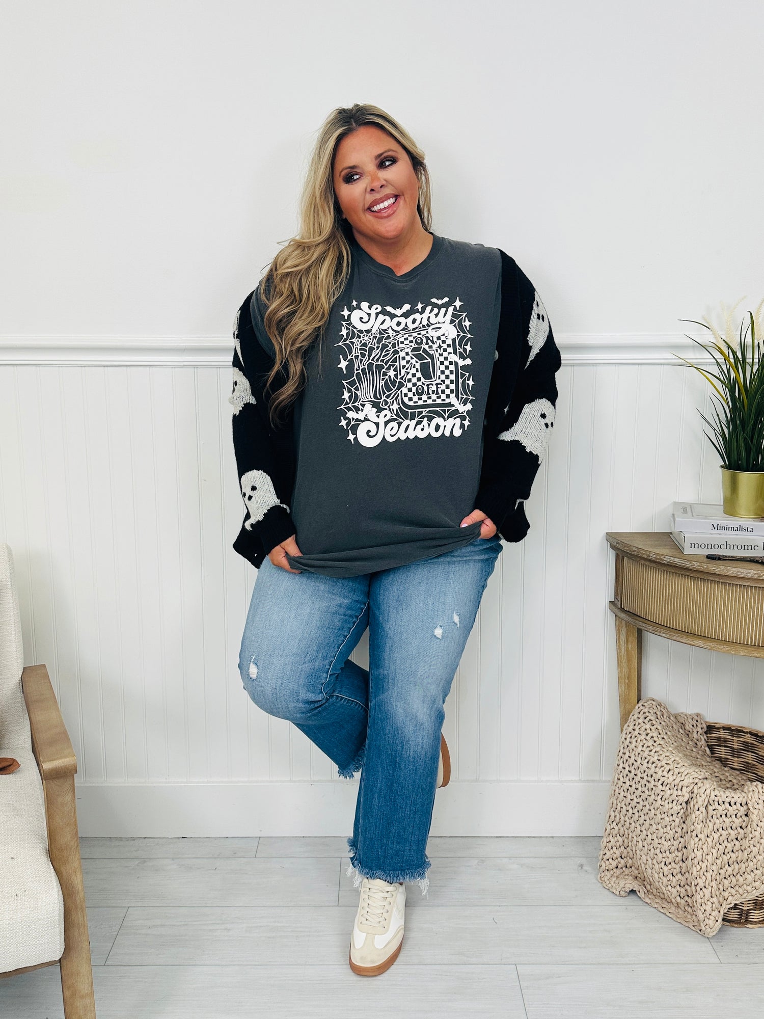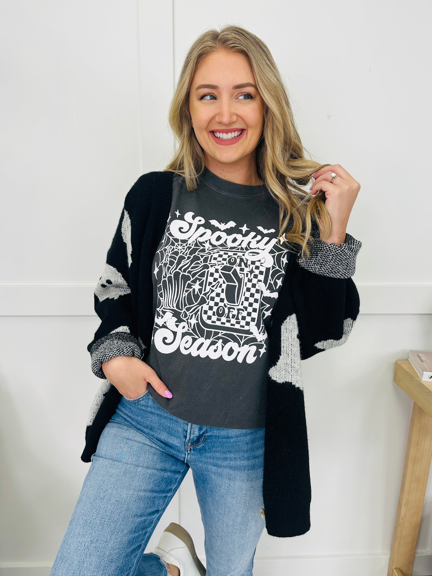 Flip the switch because spooky season is officially ON! This fun graphic is screen printed in house on a garment dyed Comfort Colors Tee. From the checkered on/off switch to the skeleton hand and flying bats, every detail screams festive and fun. Comfy, cute, and oh-so-spooky—this one’s a must-have for your Halloween lineup!