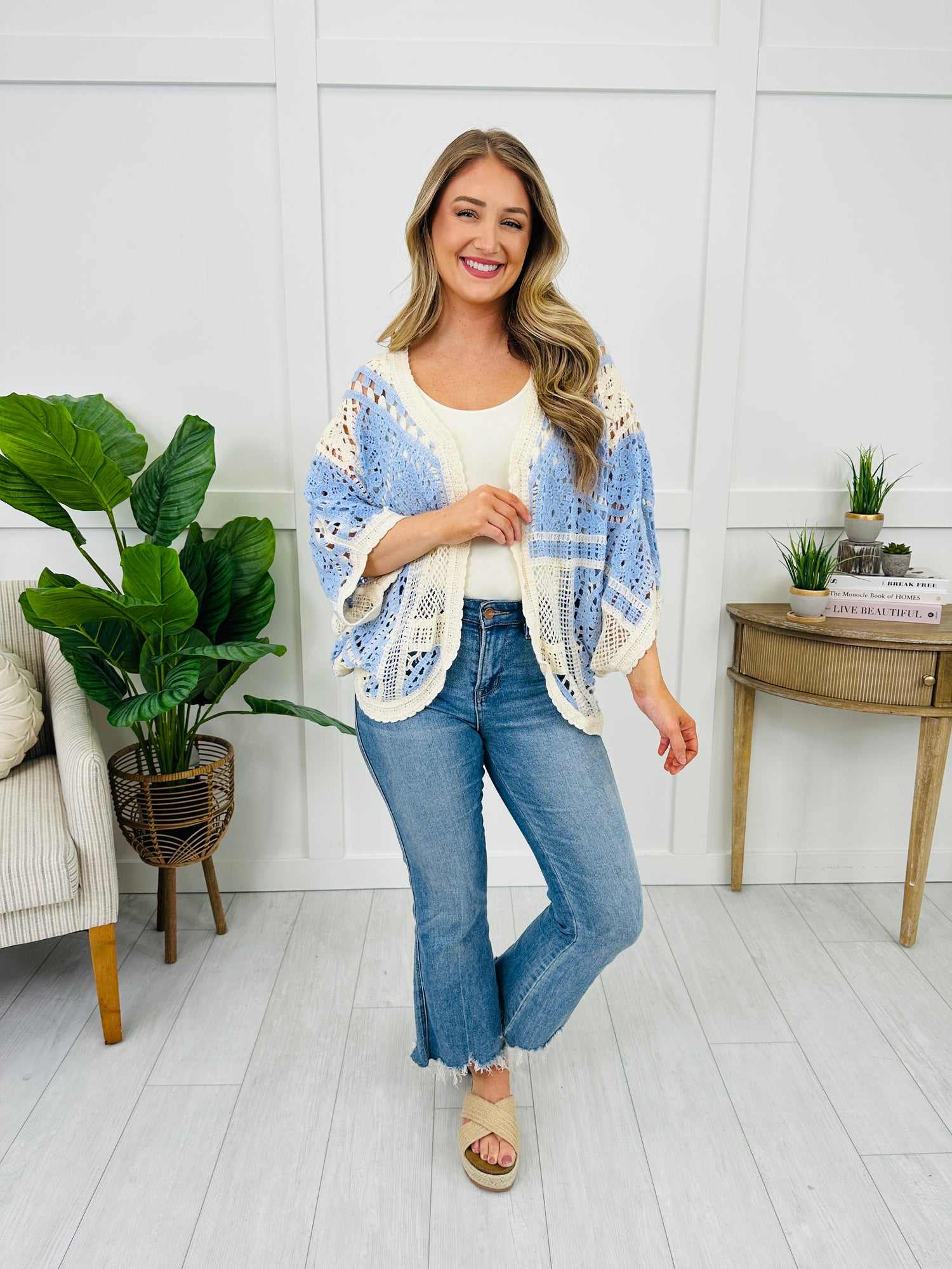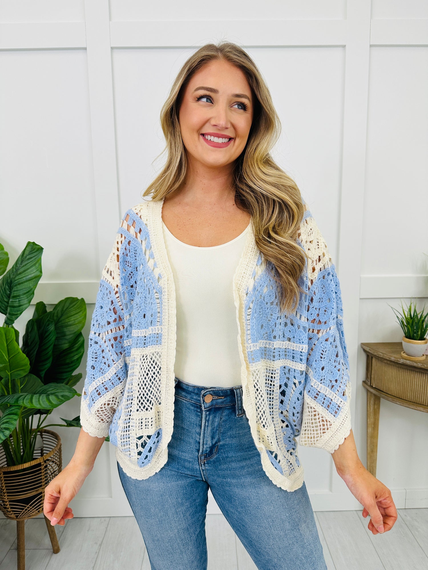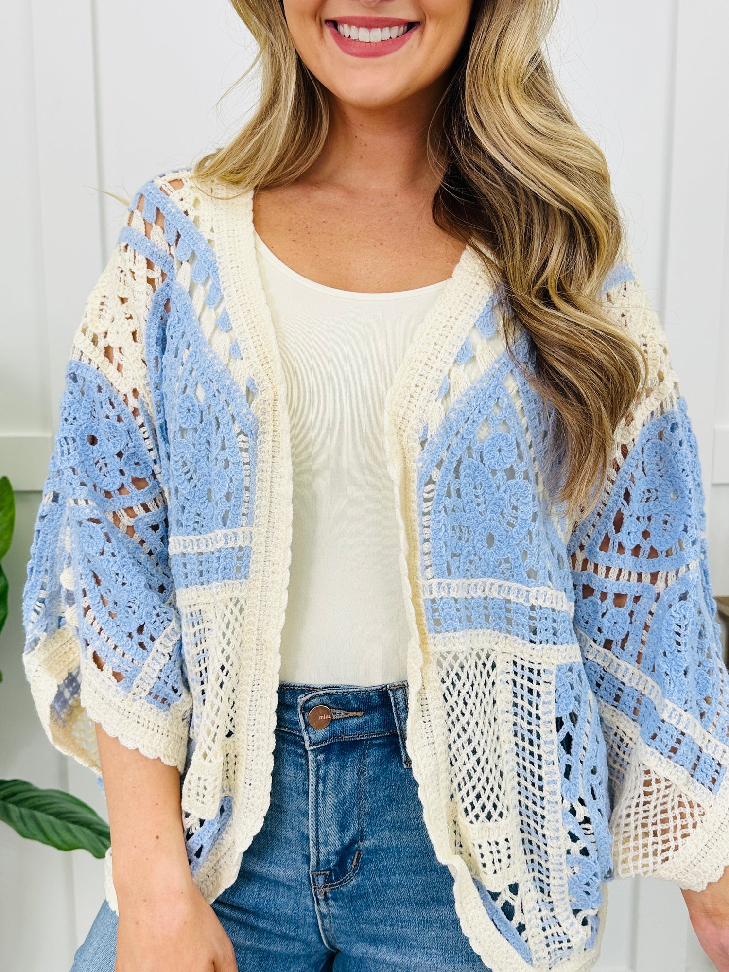 This open crochet top stands out with its mixed texture design that blends floral-inspired and geometric patterns for a detailed, statement look. The open-front shape makes it an easy throw-on-and-go layer, while the scalloped edging adds a pretty finished touch at the neckline, sleeves, and hem.