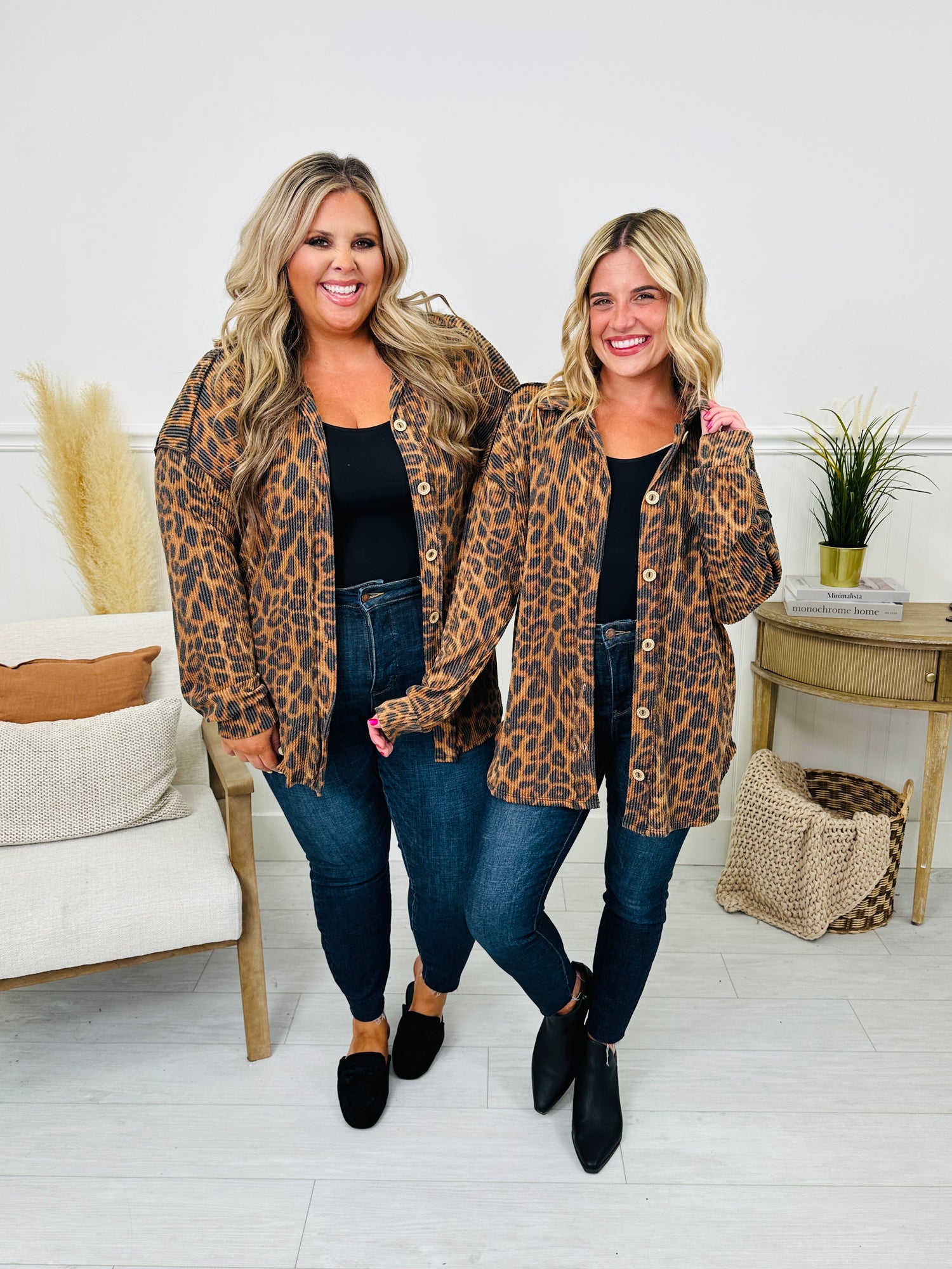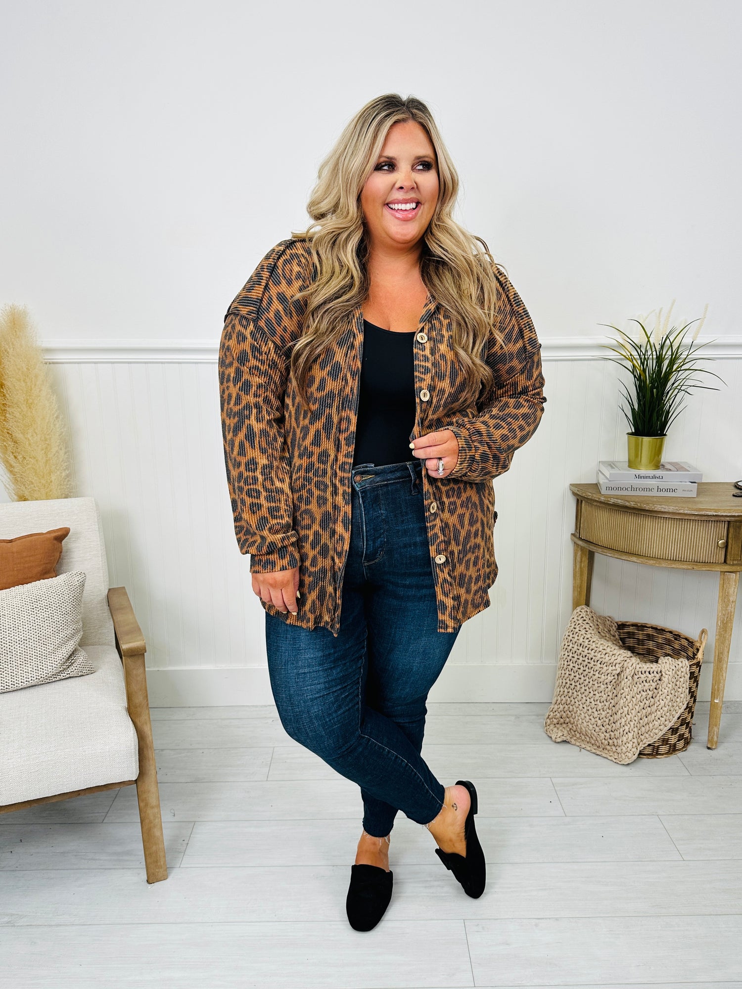 You will be spotted in style in this new leopard print shacket that is a must-have for the season. This shacket is made from our best selling raised rib material that our customers rave about. It is soft, lightweight, stretchy, and so comfortable. It is the perfect layering piece to transition from summer into fall. Dress it up with booties or down with a graphic tee and booties for multiple, versatile looks. Leopard is back and you'll be spotted in style and on trend in this new, must have shacket this season!