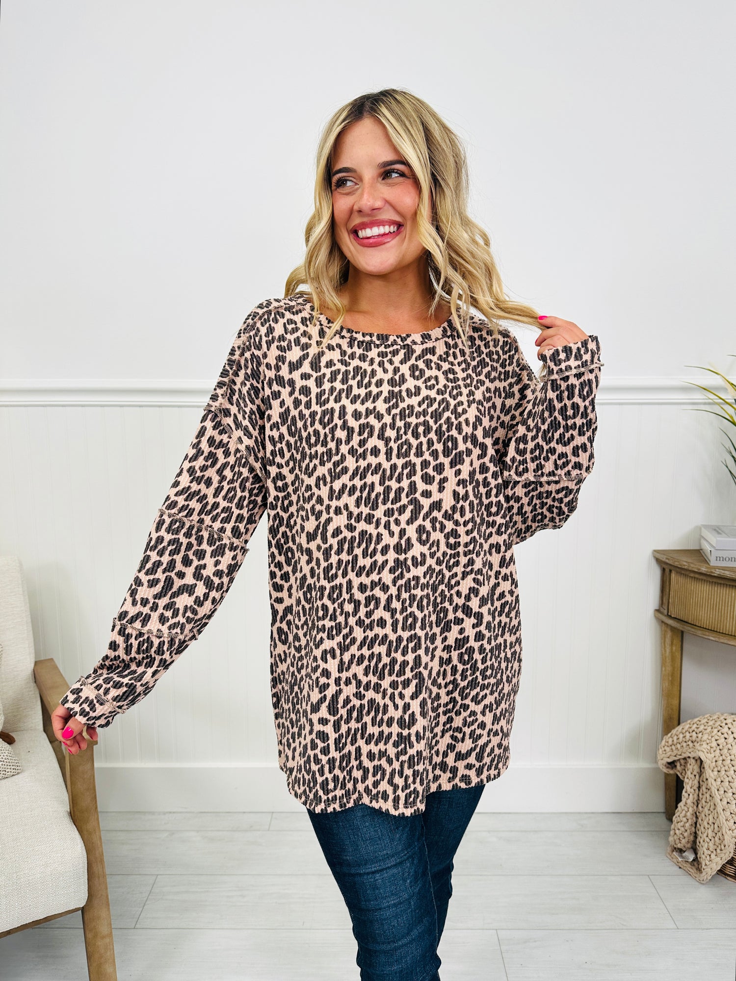We can't keep it a secret any longer-- our best selling raised rib material is now available in a leopard print in three colors. Our customers rave about how soft this material is! This stretchy top is flowy and flattering on all body types and the perfect length to pair with both jeans and leggings! It is the perfect addition to your fall wardrobe! Add it to your cart before it's gone!