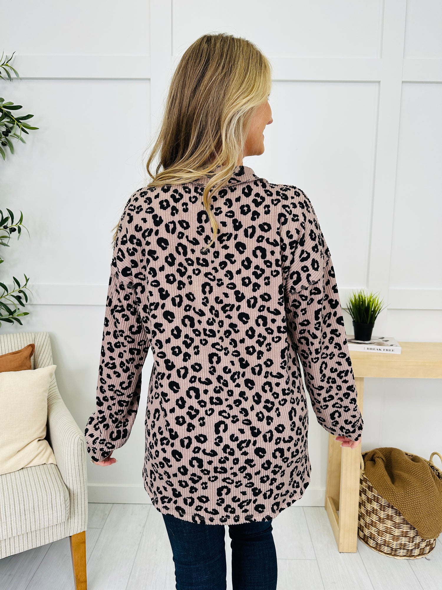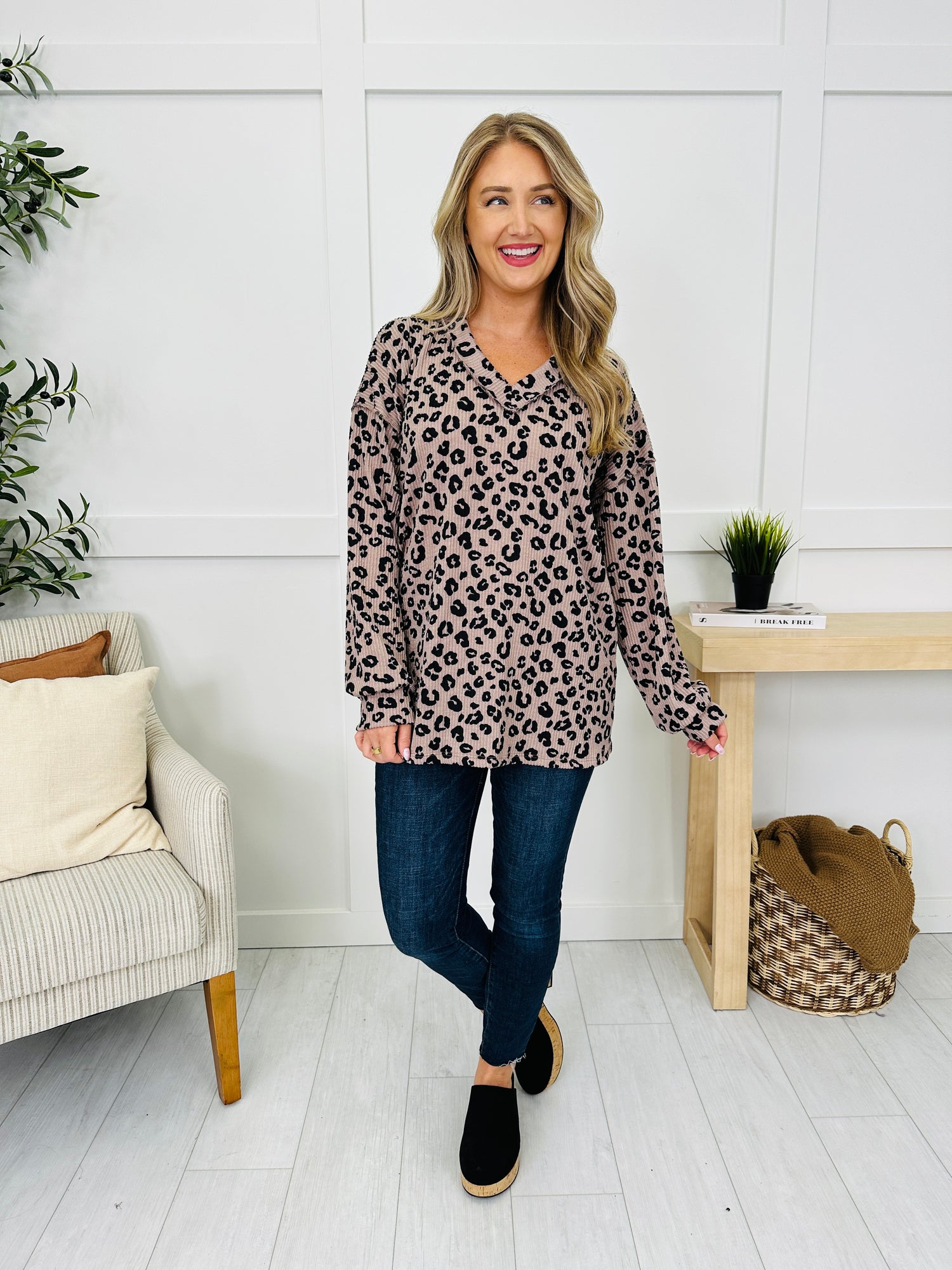 This chic raised rib leopard print top brings together comfort and style with its relaxed fit and trendy v-neck. The subtle cuffed sleeves add a flattering touch, making it perfect for dressing up or down. Pair it with your favorite denim for a fashionable yet comfortable everyday look.