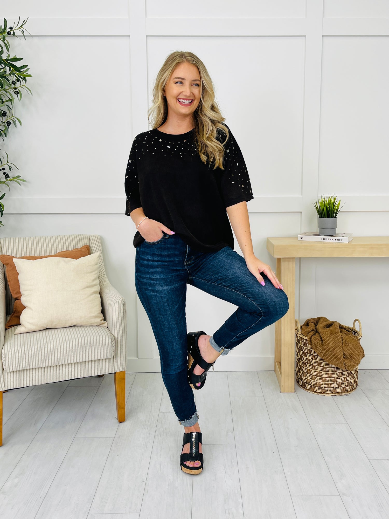 This stunning top is adorned with sparkling embellishments across the shoulders, offering a touch of glam while maintaining a casual, relaxed vibe. Its trendy fit and soft, breathable fabric ensure all-day comfort, whether you're dressing it up or down. Perfect for adding a little sparkle to any look, this top effortlessly blends style and ease.