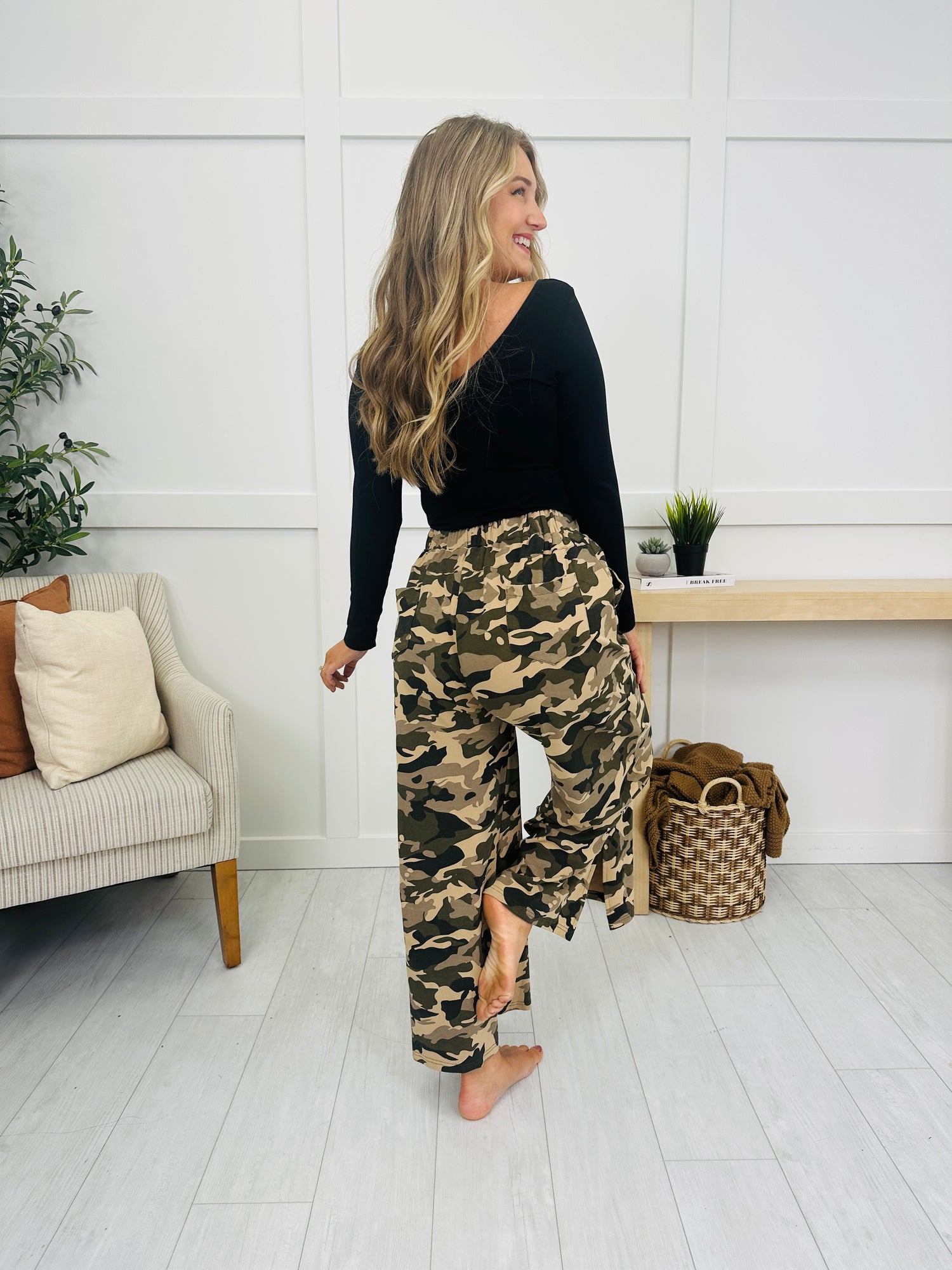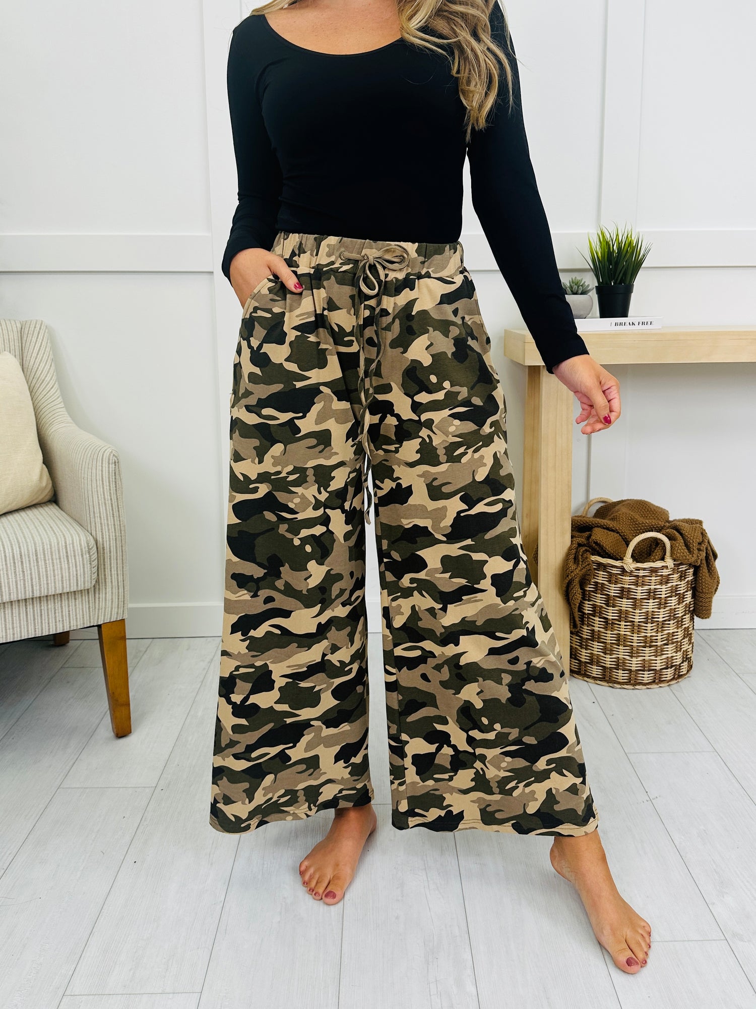 These camo print bottoms are perfect for combining comfort with style. With their relaxed wide-leg fit and drawstring waist, they offer a flattering and adjustable silhouette. Whether you're lounging at home or running errands, these versatile pants are ready to be styled in multiple ways for a laid-back, on-trend look.