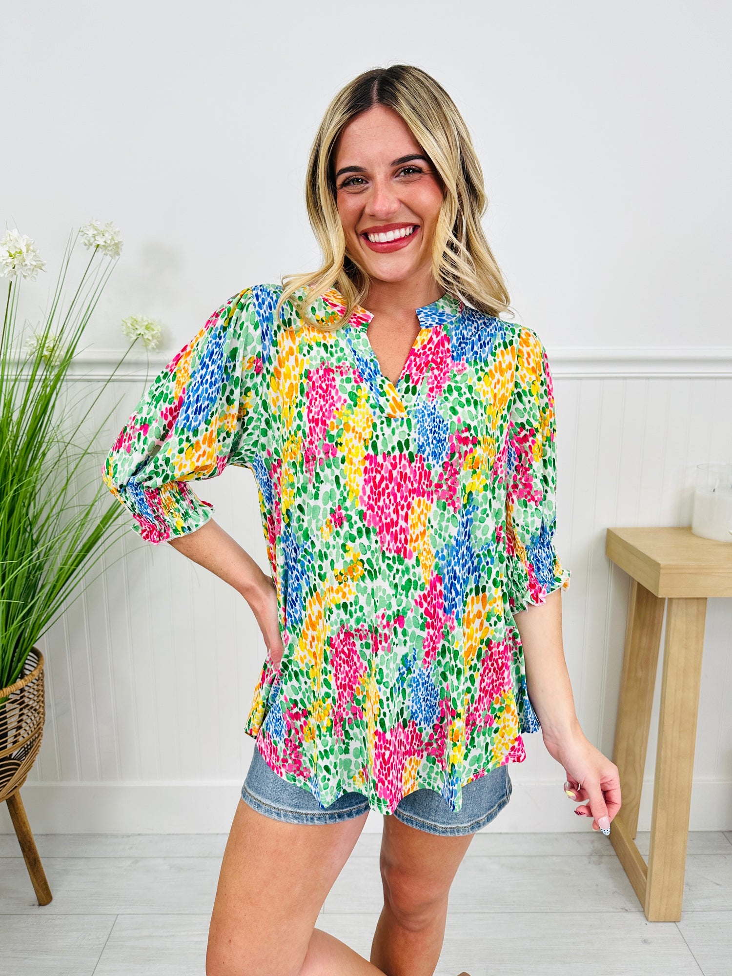 This new arrival is the perfect top to step into spring. This best selling top is available in brand new spring prints that will bring a pop of bold into your spring wardrobe. This top is wrinkle free, which means it's perfect to pack in a suitcase or bag. It's easy to throw on and pair with all of your favorite bottoms-- shorts, jeans, white denim, and even leggings. Dress it up or down for multiple, versatile looks this season.