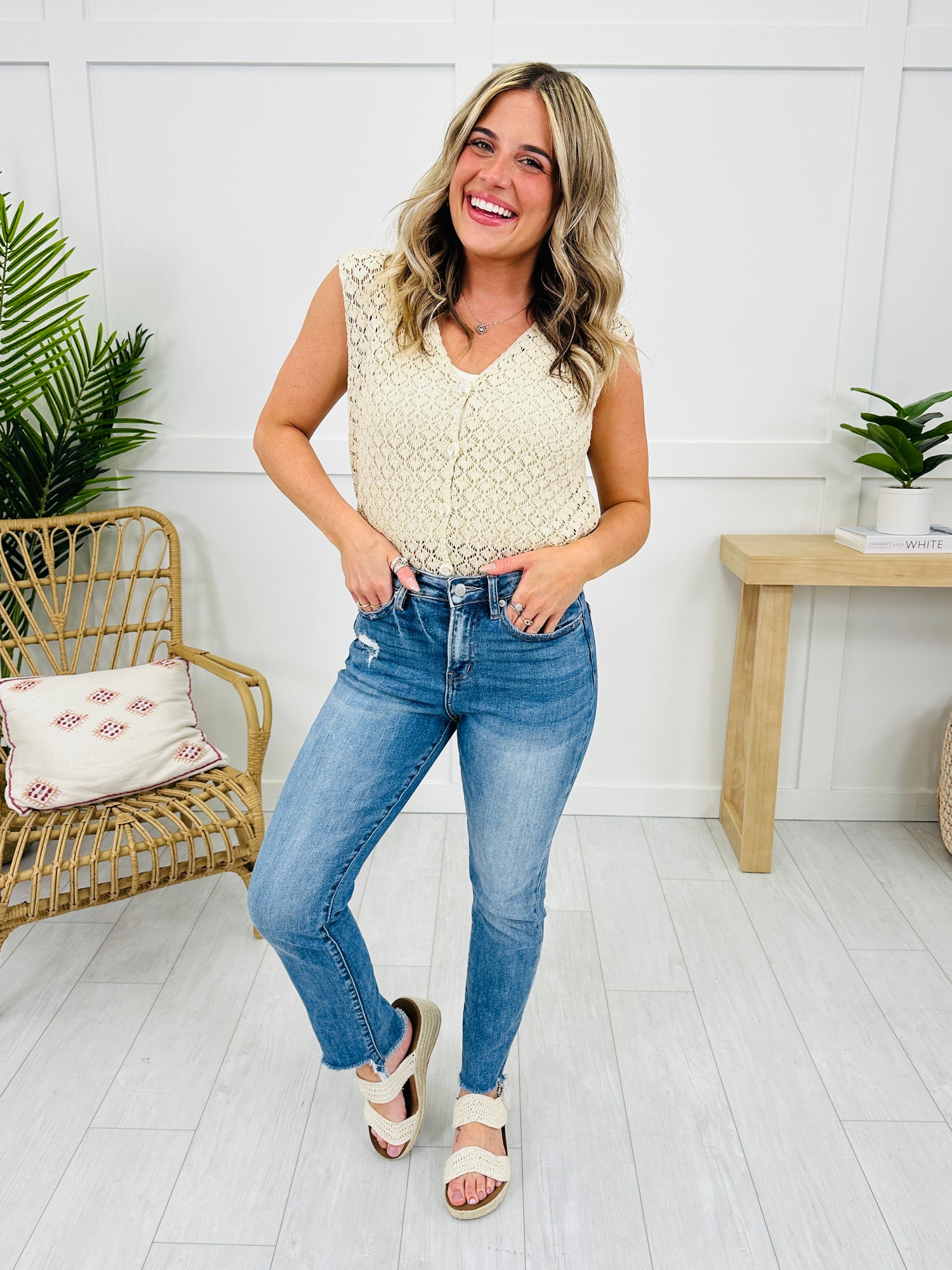 Set up your denim game with these new step hem straight leg jeans. They are so trendy and so comfortable! The fabrication is buttery soft and stretchy, and they snap right back into place, which means they hold their shape all day long.  We love the wash and grain combination.  These jeans have minimal distressing (no holes) and are work to weekend approved. The high rise holds everything in without sacrificing stretch or comfort. Step it up and get these new jeans in your cart while you still can!