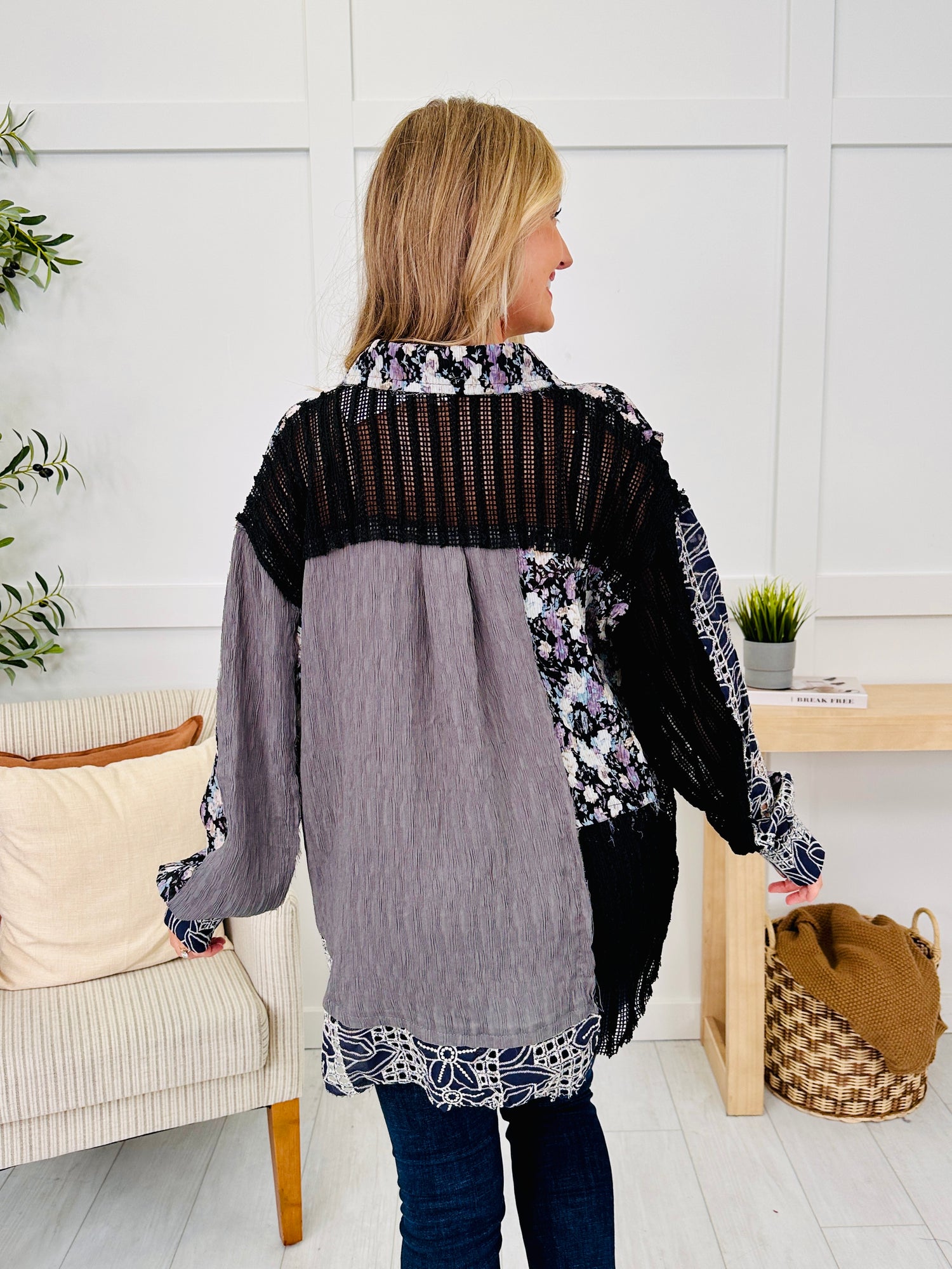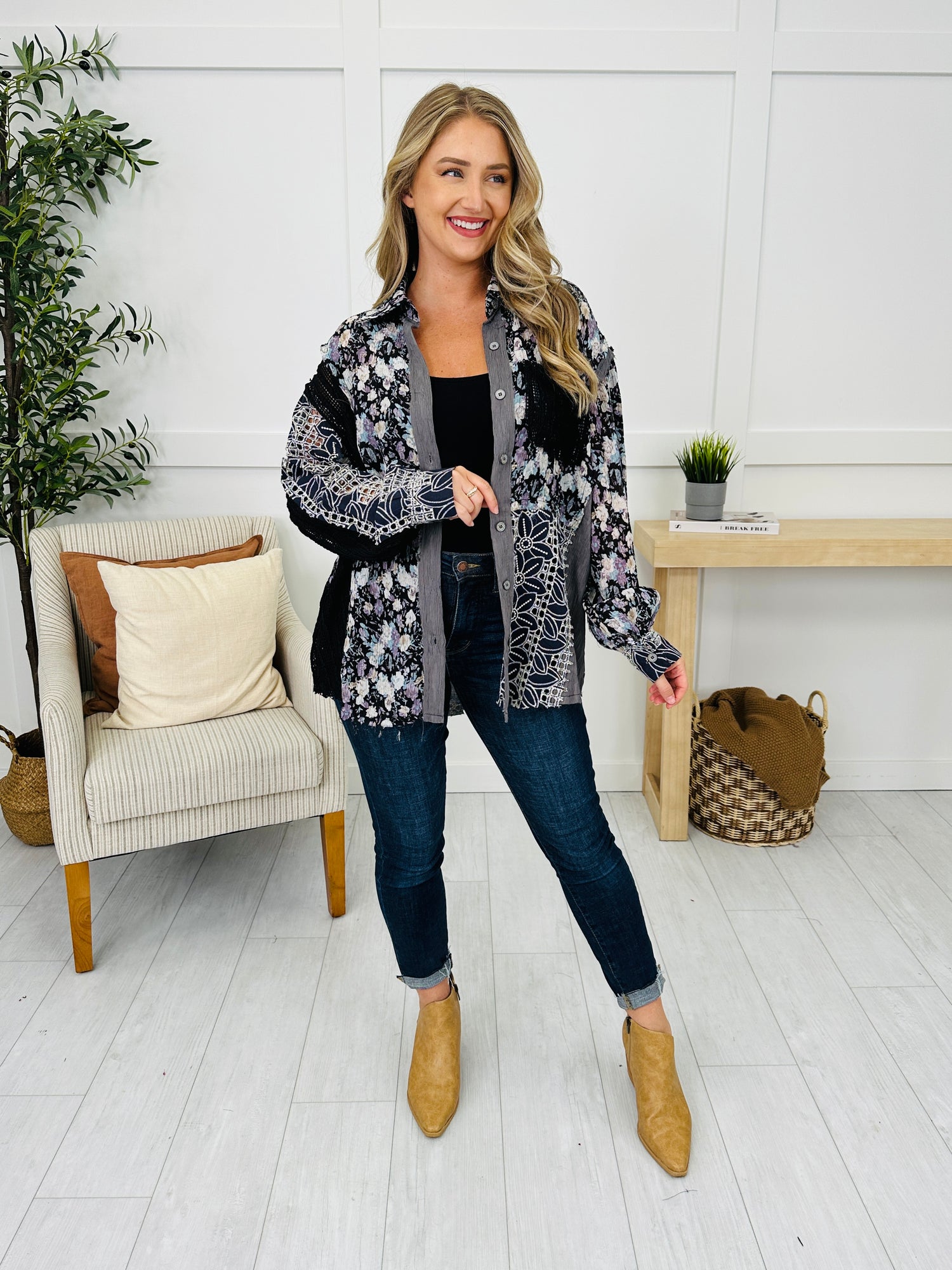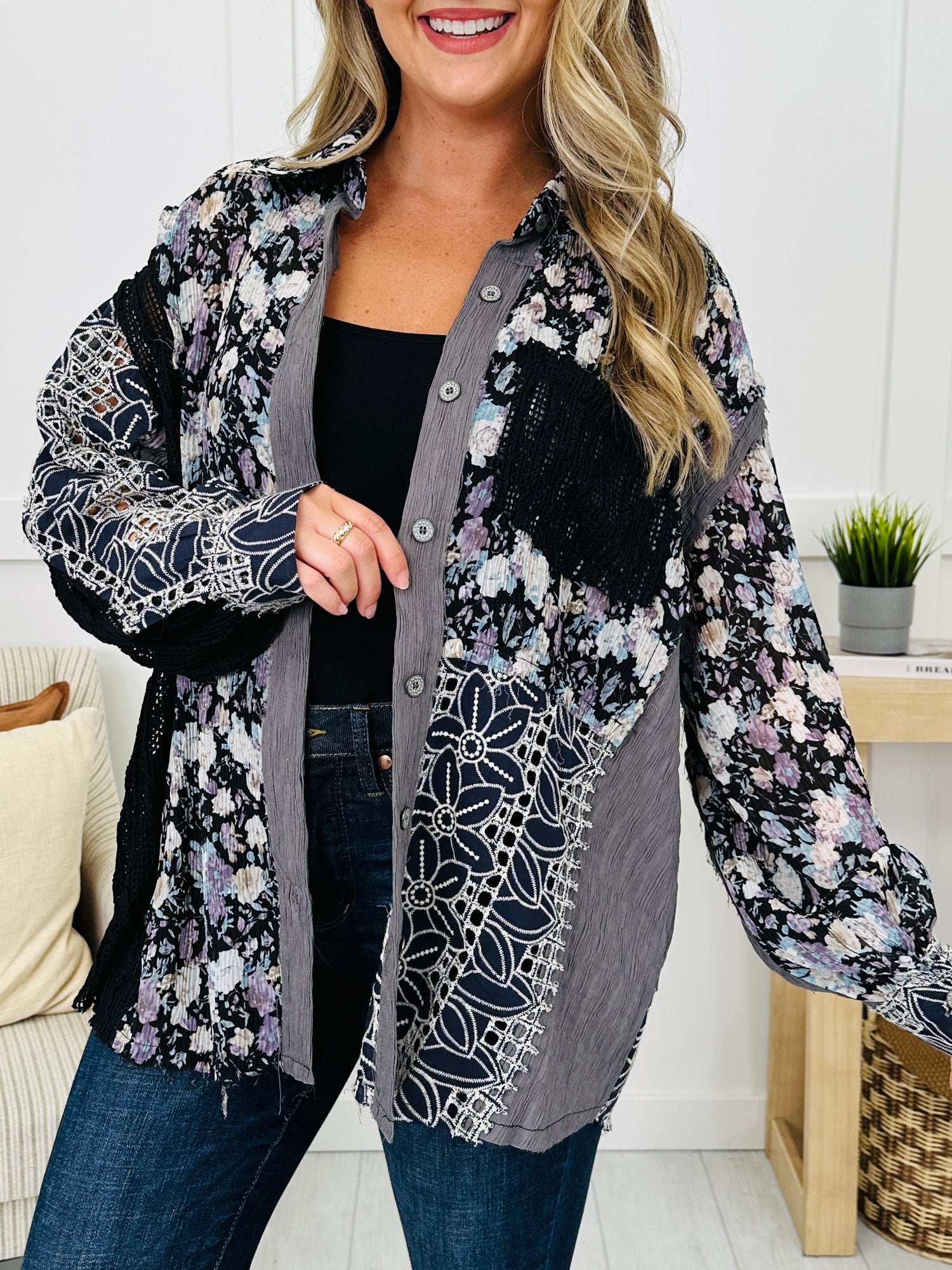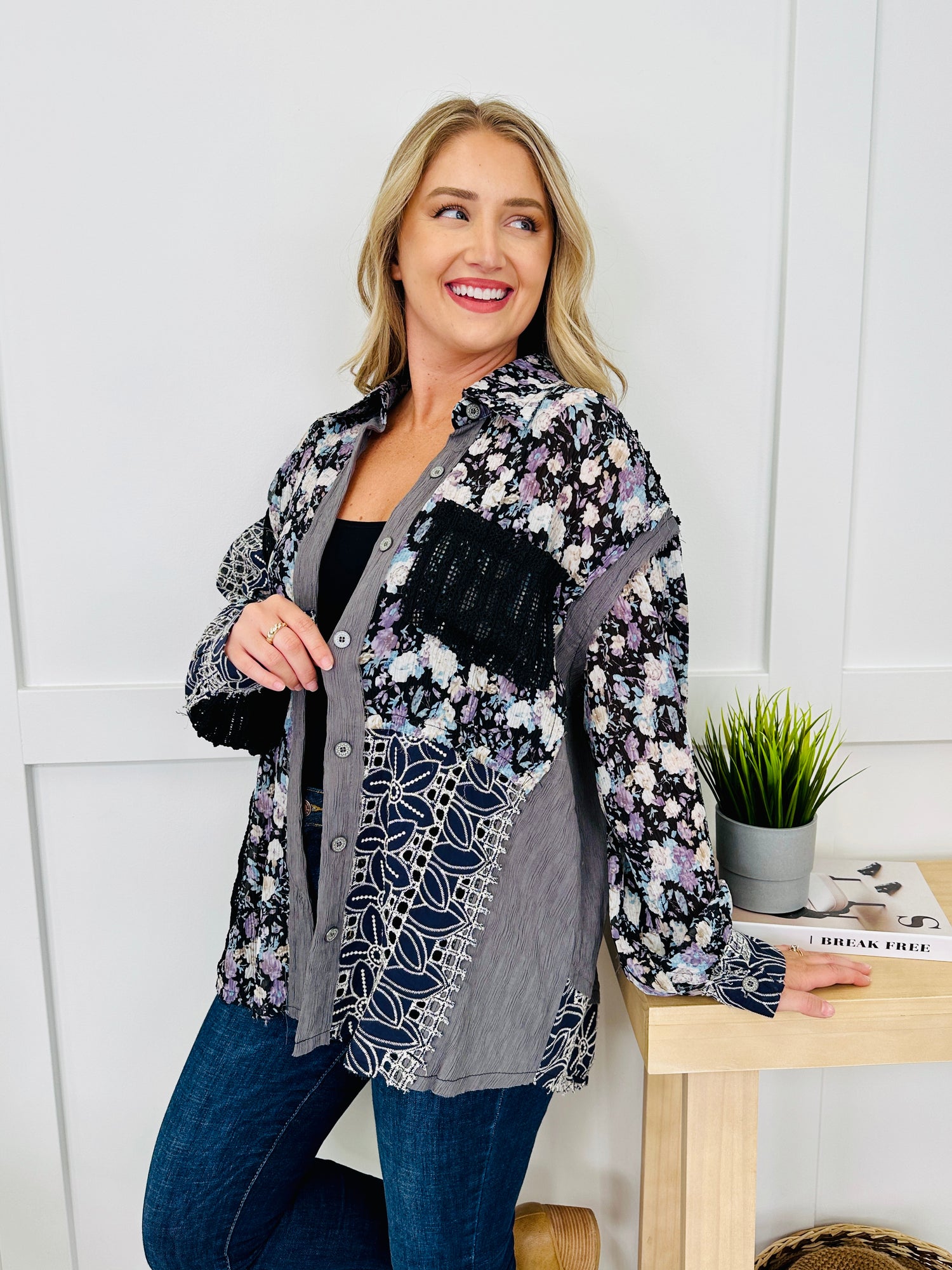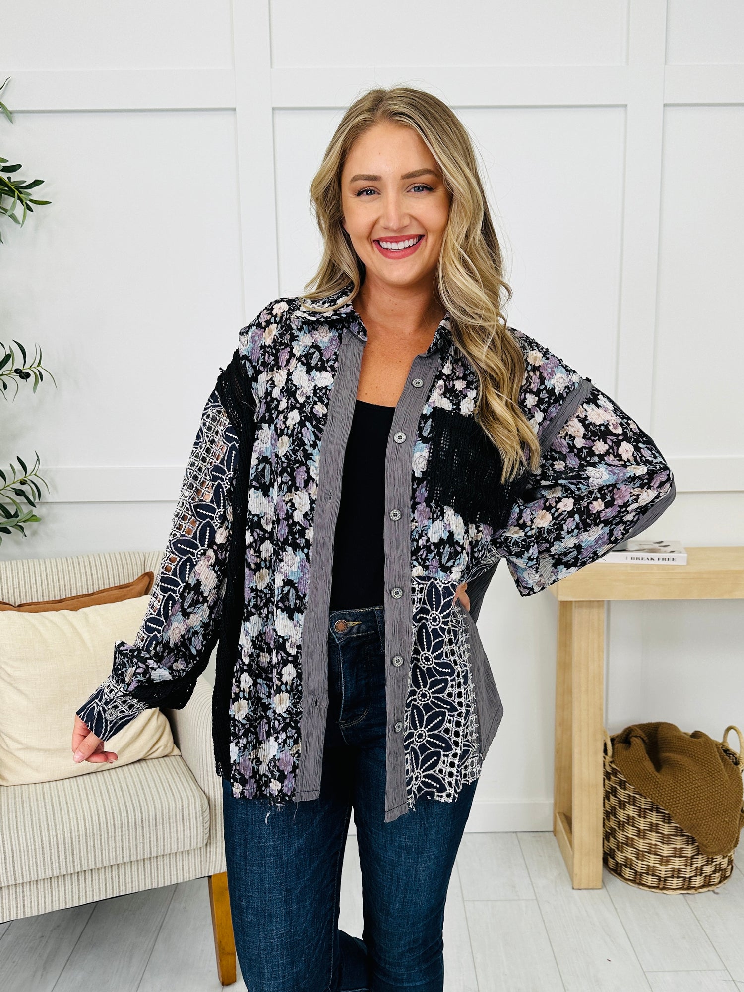This statement top is a true work of art, blending floral prints, embroidered lace, and sheer textured panels for a bold and beautifully layered look. The button-down silhouette offers a relaxed, flowy fit that works perfectly open or closed. Whether styled casually or dressed up, this piece brings all the boho-chic vibes with plenty of personality.