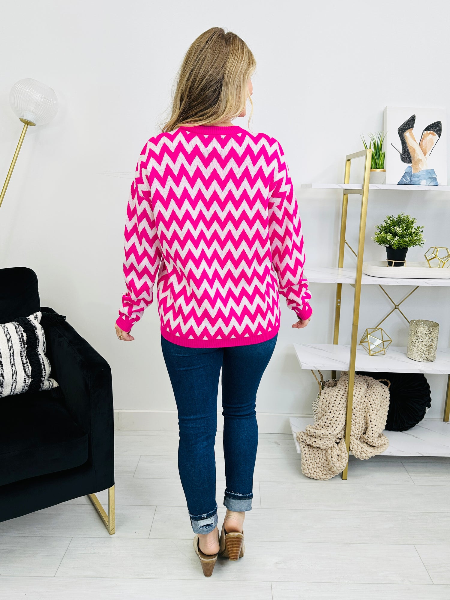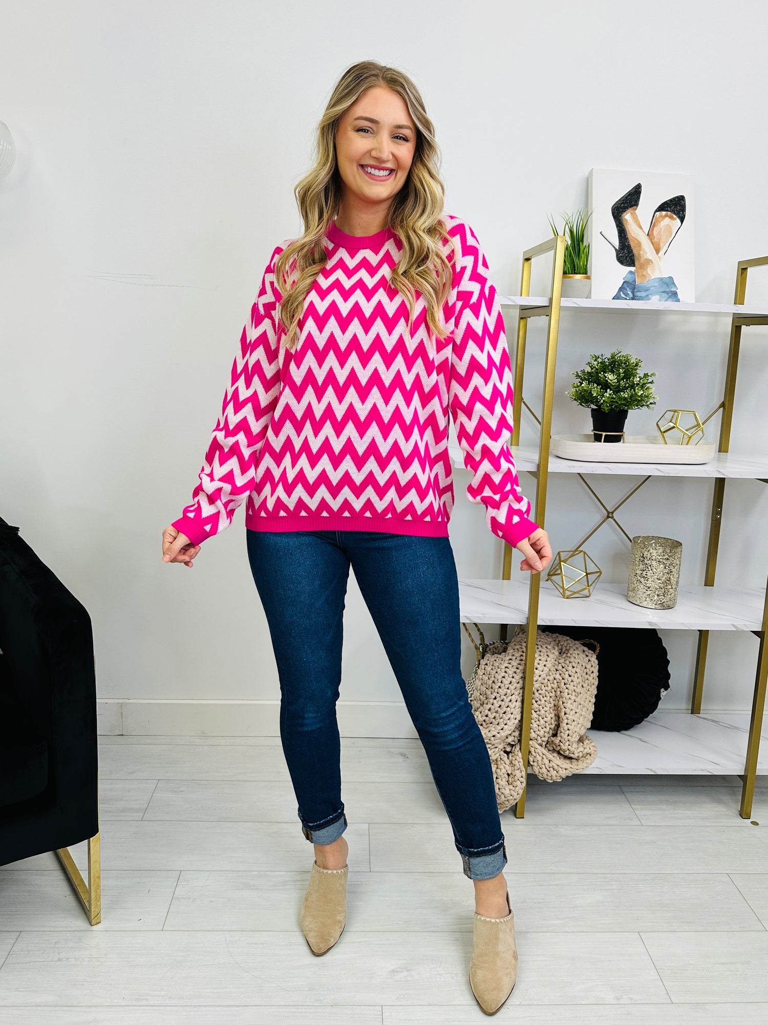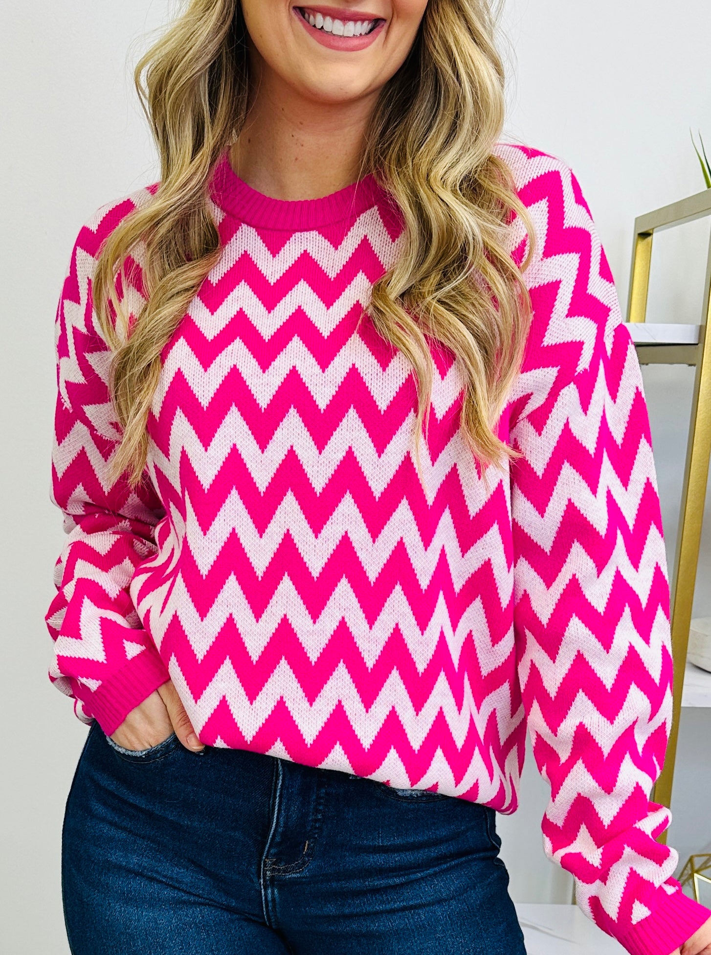 This cozy sweater combines a bold chevron pattern with a pop of vibrant pink and white for a playful yet stylish look. Its relaxed fit and soft texture ensure comfort while staying fashionable, making it a perfect choice for any casual outing. Pair it with your favorite jeans or leggings for an easygoing yet eye-catching outfit.