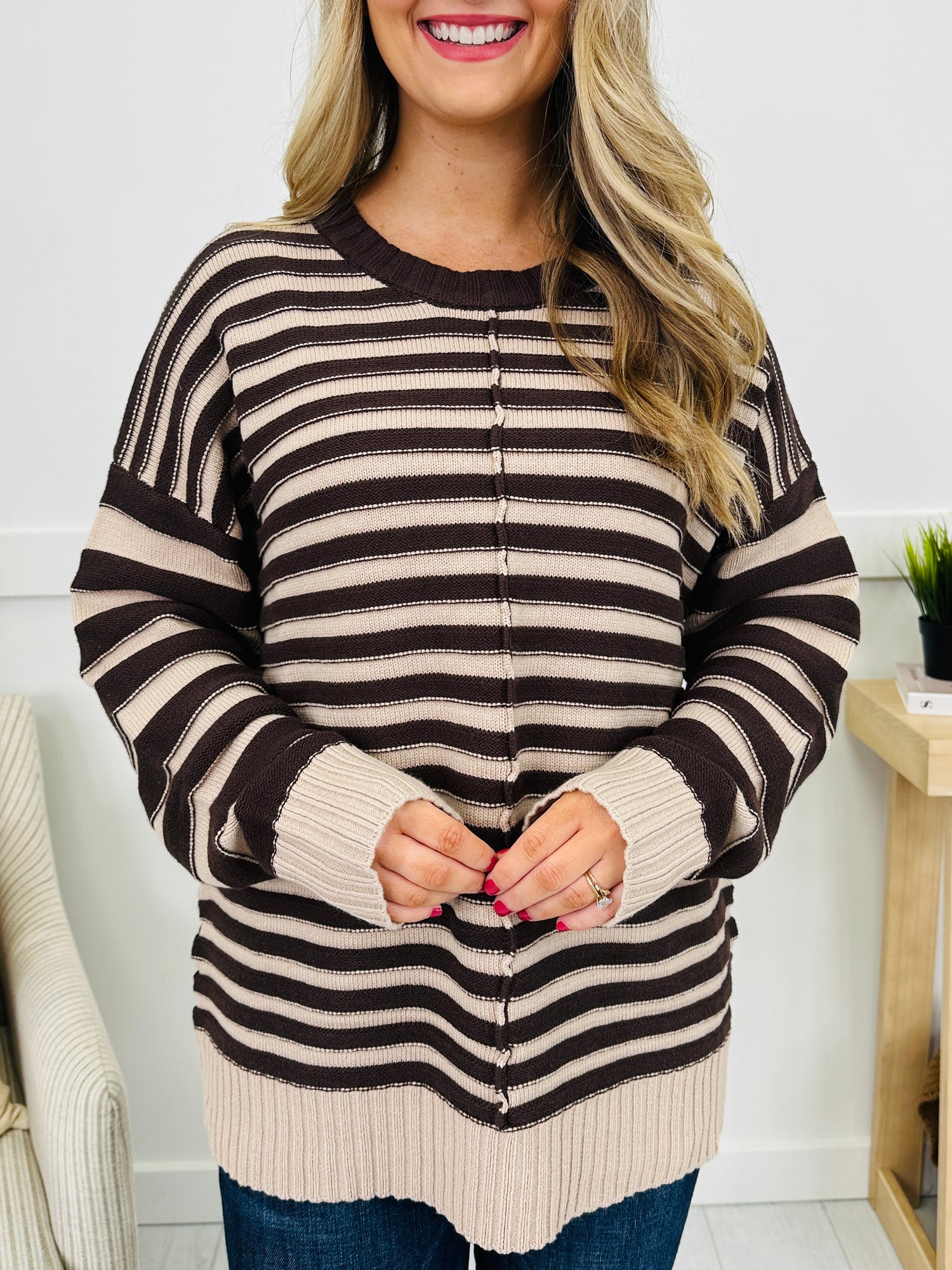 This striped sweater brings cozy texture and timeless style together effortlessly. The contrasting striped design gives it a bold yet classic appeal, while the textured knit finish adds soft dimension. Completed with banded hems and cuffs, it’s the perfect easygoing piece to keep your look polished and comfy all season long.