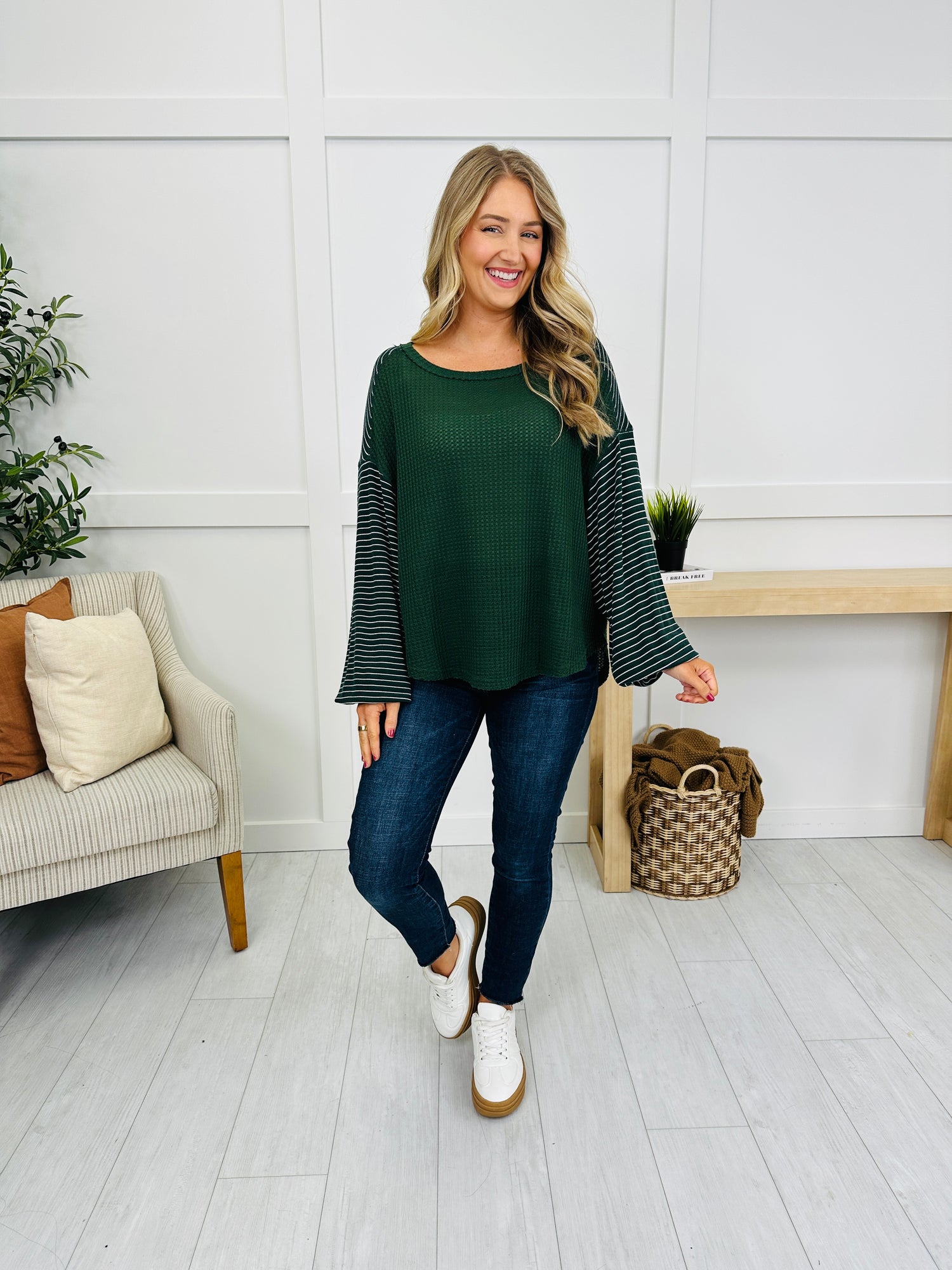 A soft, textured knit body pairs with contrasting striped sleeves that billow just right for a modern, feminine look. The relaxed silhouette and simple crew neckline make it an effortless throw-on with denim, while the mixed fabrics add that little pop without trying. Comfortable, lightweight, and polished—this one does casual and dressed-up with ease.