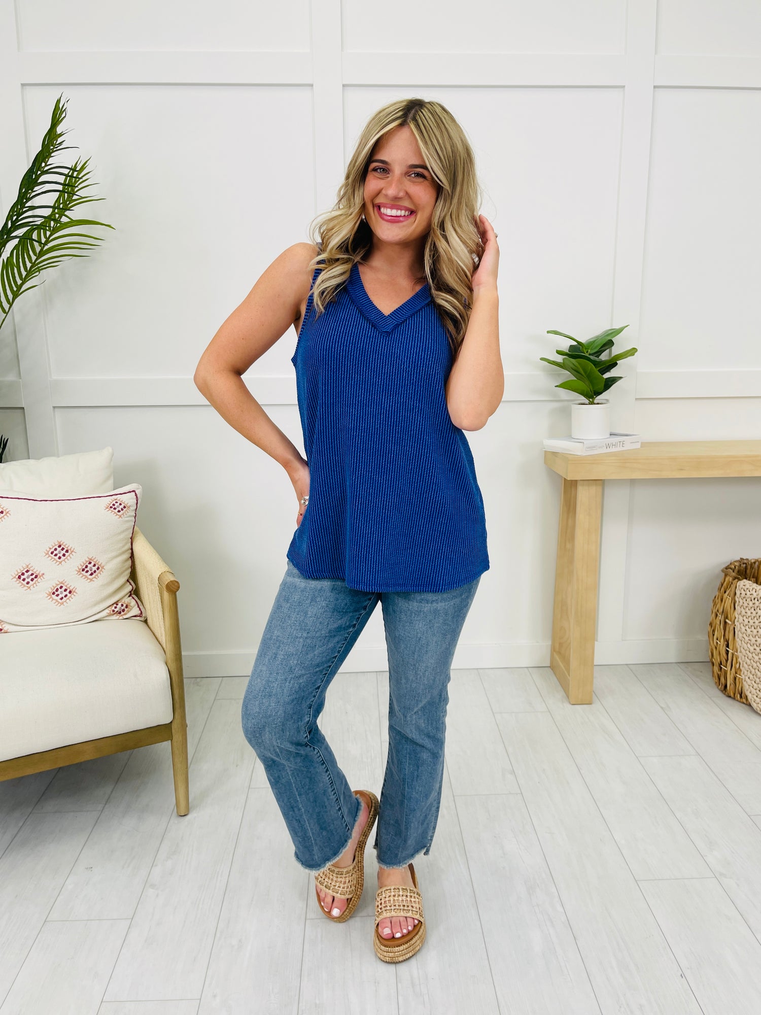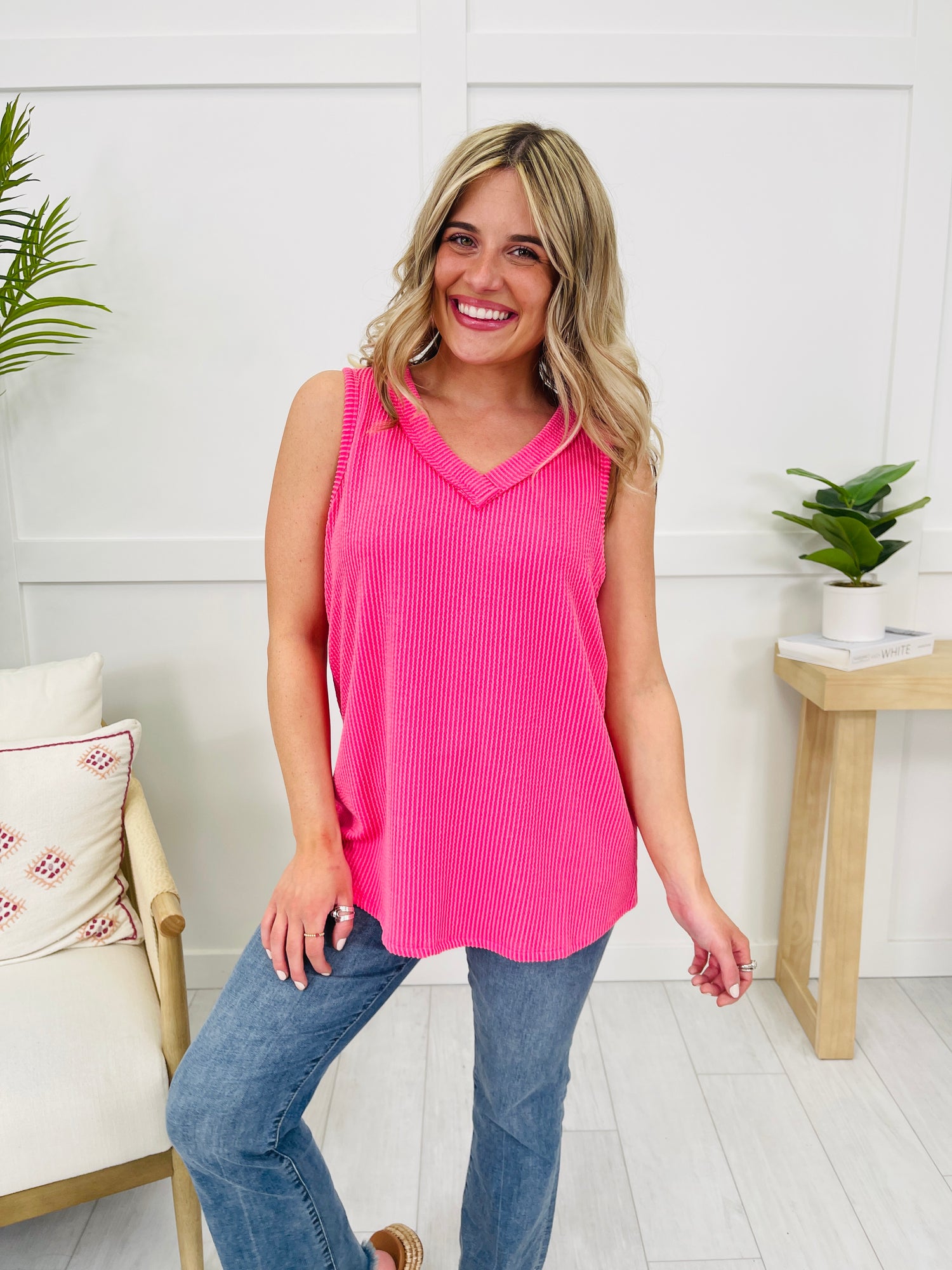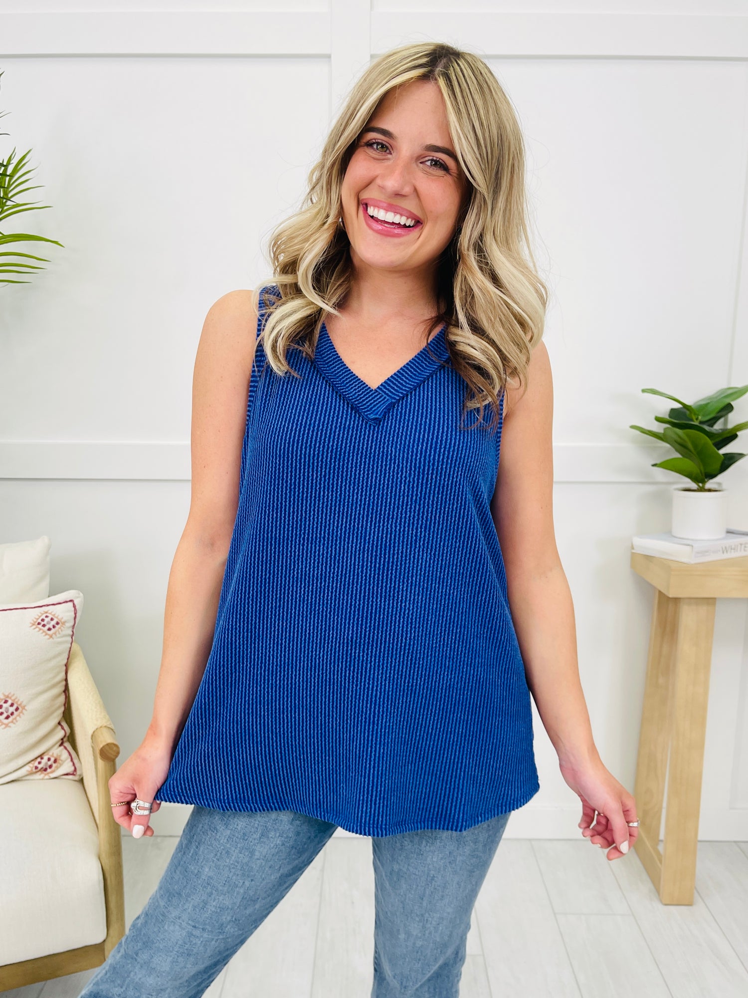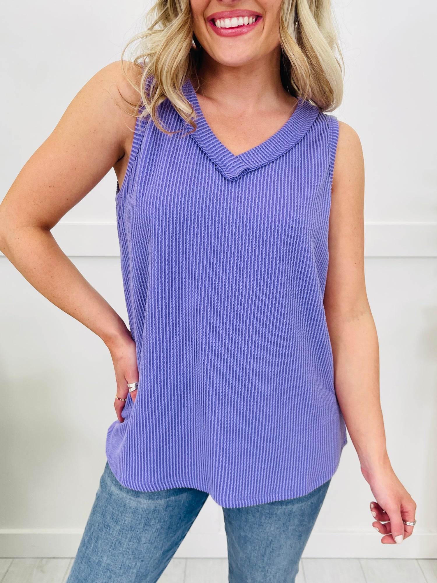 We can't wait to be in our summer era this year and this tank top will be worn on repeat all summer long! Our customers rave about this best selling fabric! It is brushed soft, stretchy, and so comfortable! This tank top is flowy and flattering on every single body type and we love the v-neck line for warmer weather. Pair this with shorts or jeans and dress it up or down for multiple versatile looks. We love the bright and bold colors and at this price point, you can get as many colors as your heart desires!