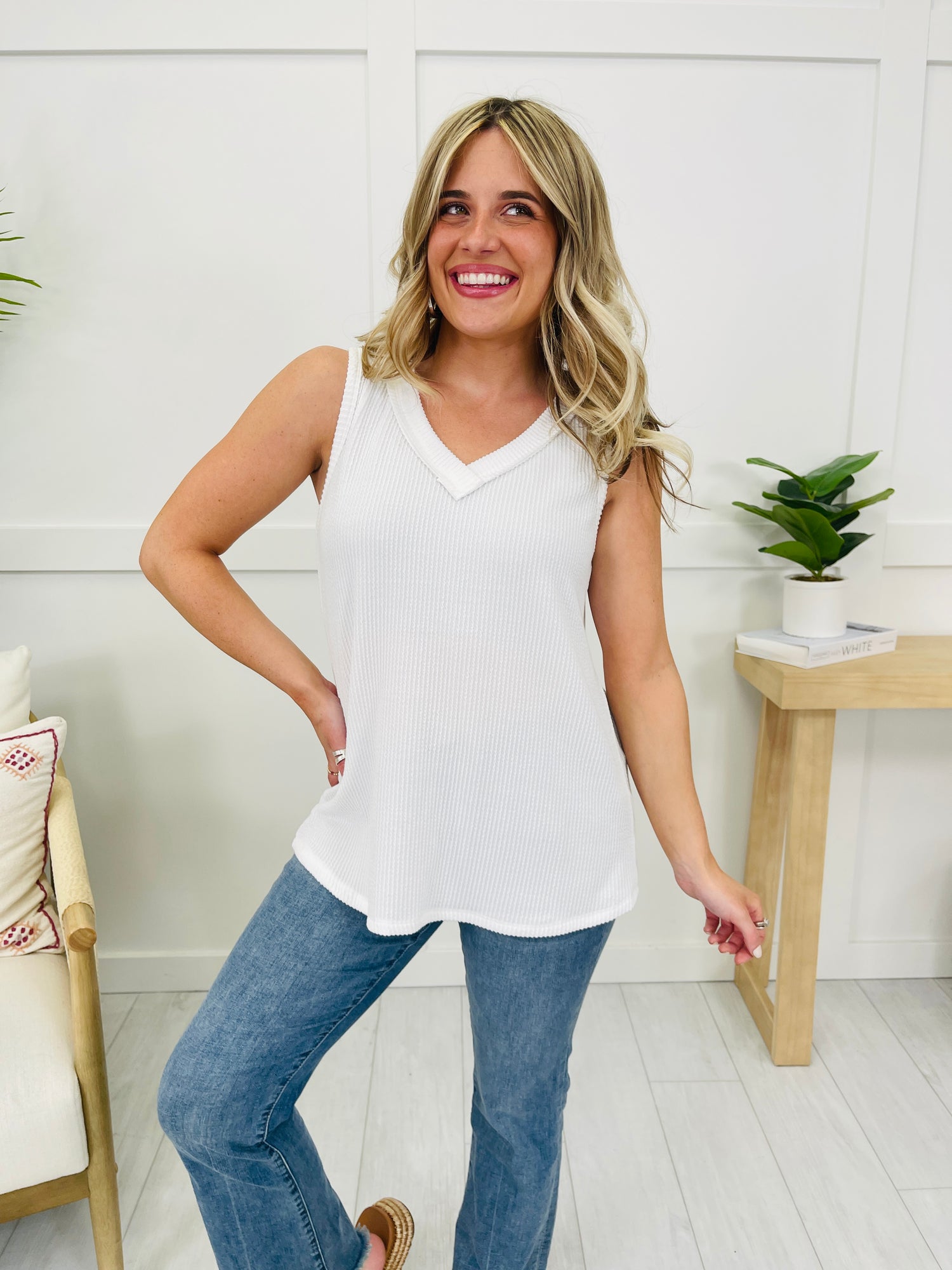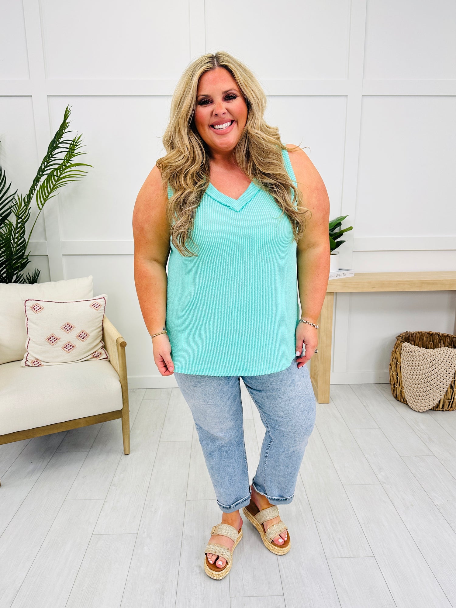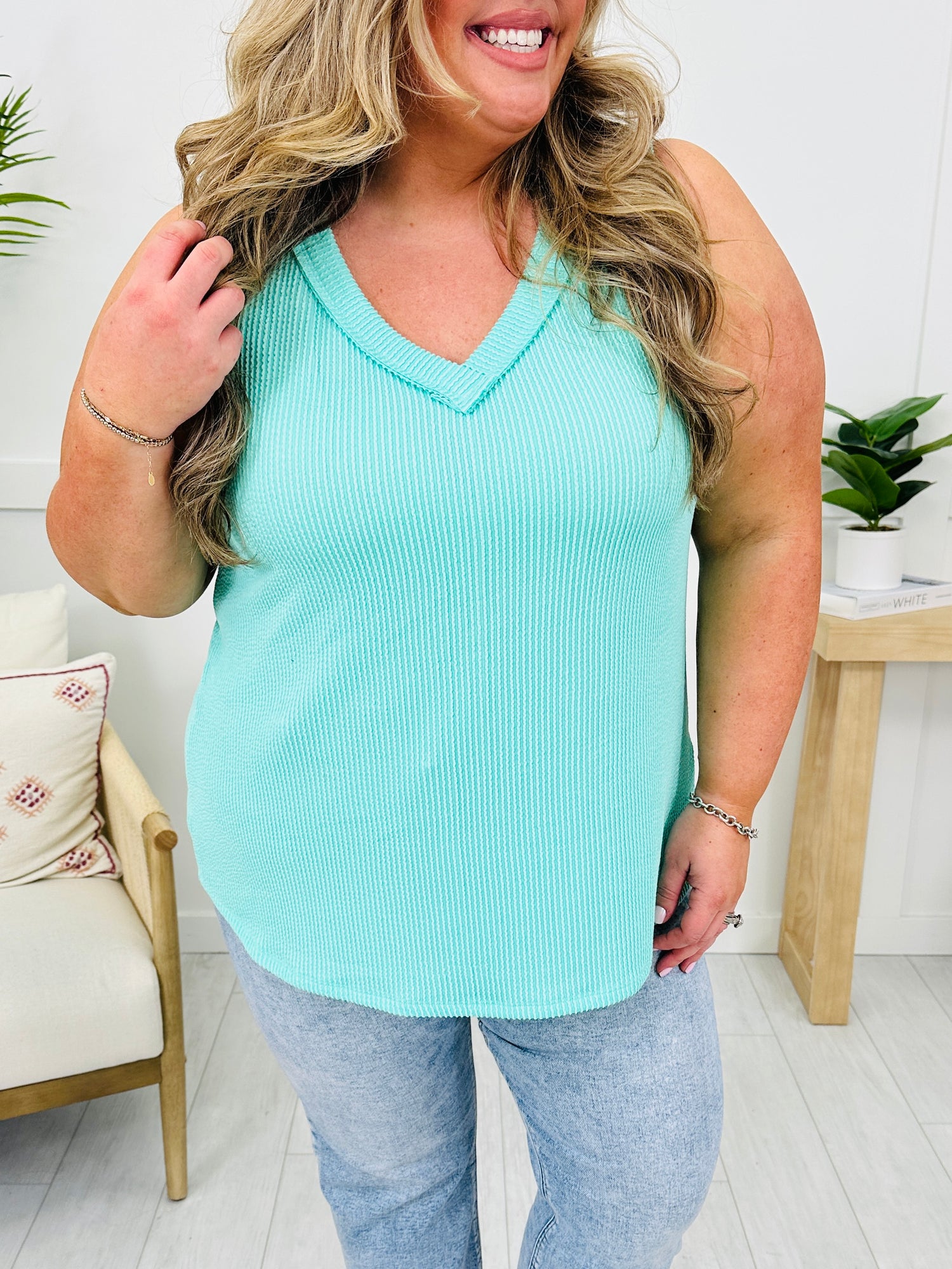 We can't wait to be in our summer era this year and this tank top will be worn on repeat all summer long! Our customers rave about this best selling fabric! It is brushed soft, stretchy, and so comfortable! This tank top is flowy and flattering on every single body type and we love the v-neck line for warmer weather. Pair this with shorts or jeans and dress it up or down for multiple versatile looks. We love the bright and bold colors and at this price point, you can get as many colors as your heart desires!
