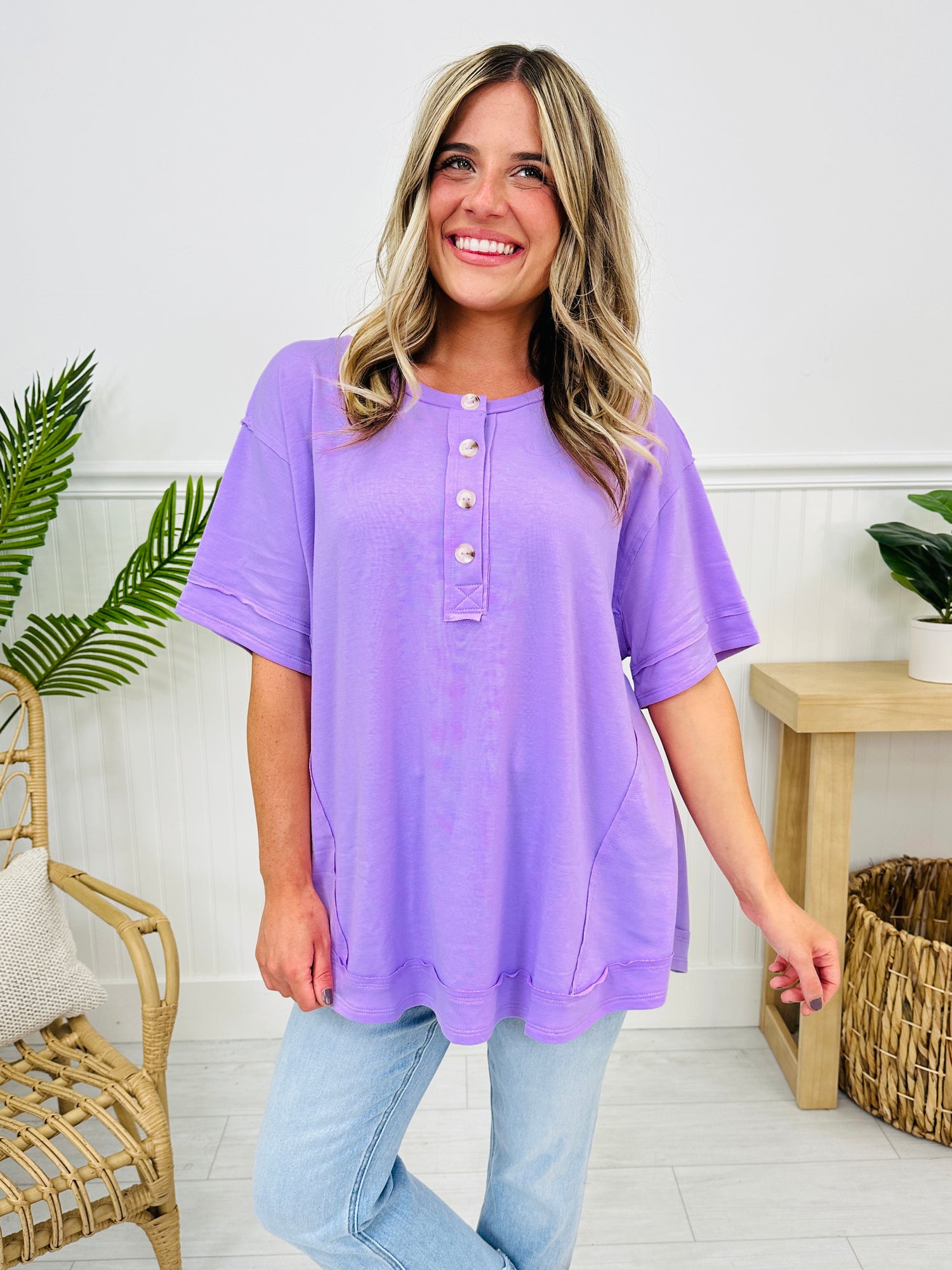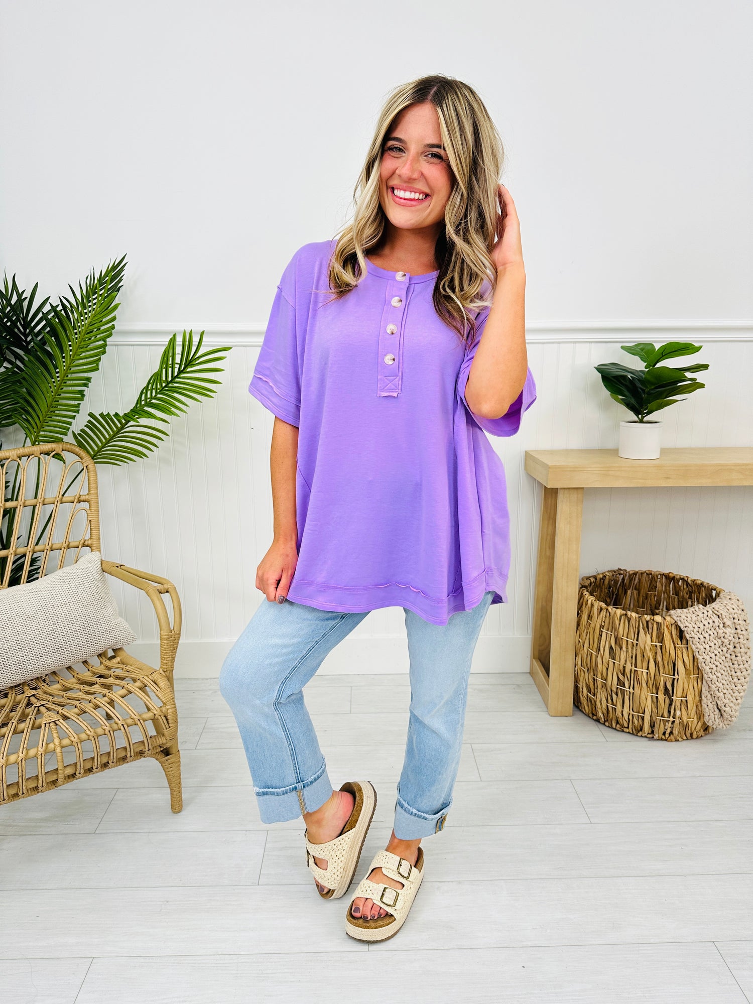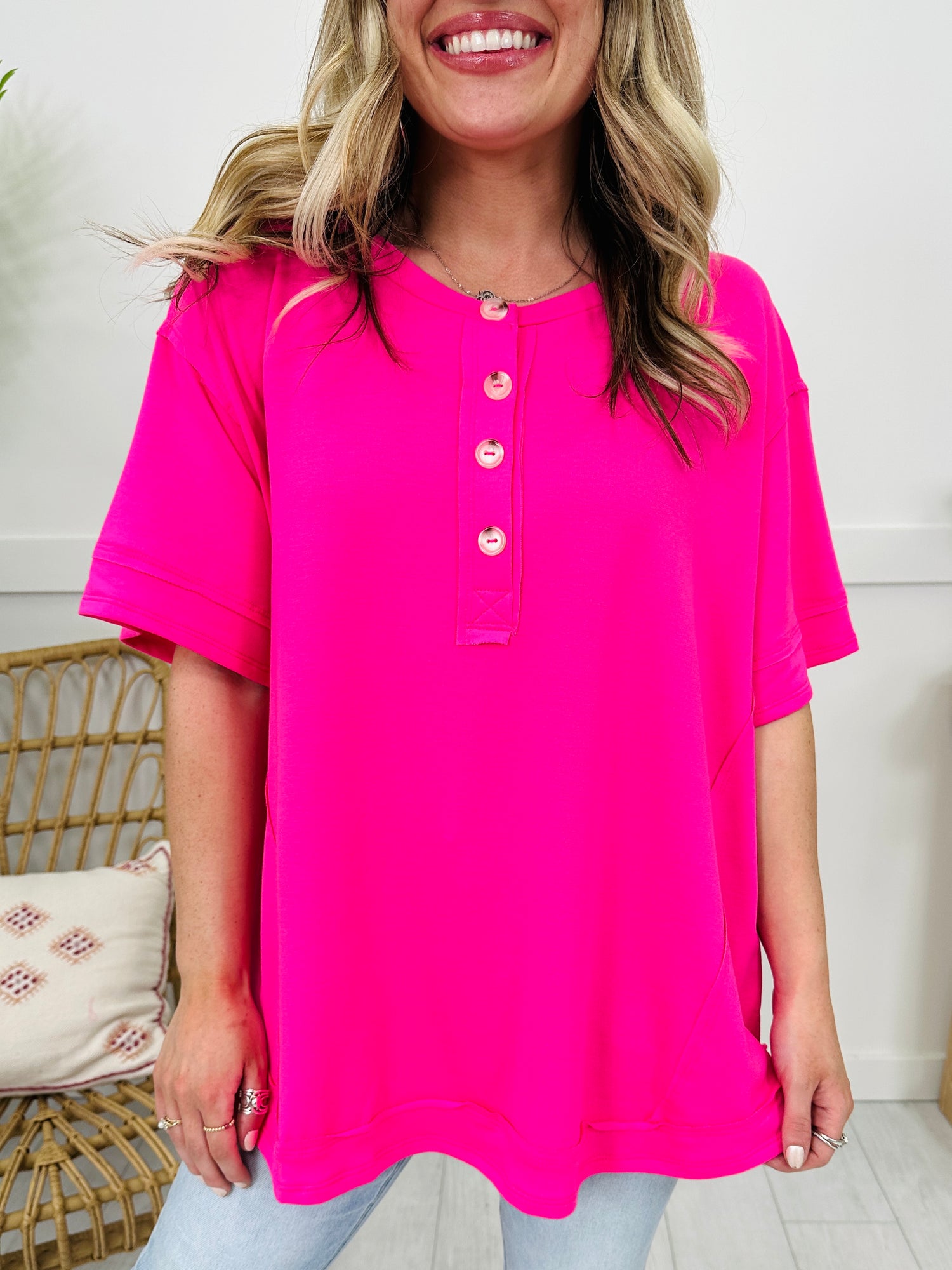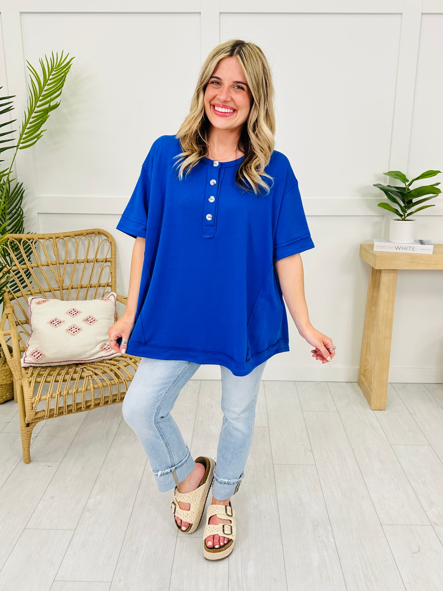This new arrival is going to give you that summer glow you've been dreaming about! This oversized top is flowy and flattering on every single body type! We love the length of the sleeves and the body. This versatile top can be paired with jeans, shorts, and even leggings! The faux buttons give you an elevated look without you having to worry about the buttons coming undone. We love the bright bold colors, too, and at this amazing price, you can get as many your heart desires!