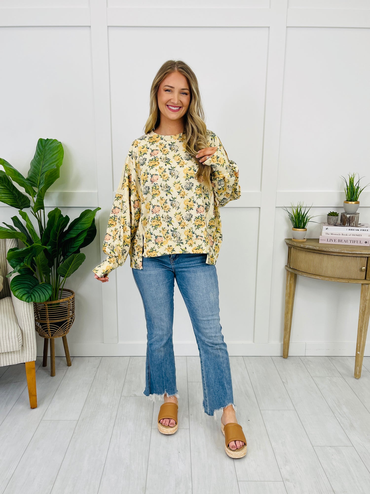 This top is the perfect mix of sweet and laid-back, with a pretty vintage floral print that instantly brightens up your everyday look. The striped sleeve accents add a fun pop of detail, while the side-slit hem gives it that easy, relaxed shape you’ll keep reaching for. Pair it with your favorite denim and you’ve got a comfy, cute outfit that feels effortless but still looks totally put together.