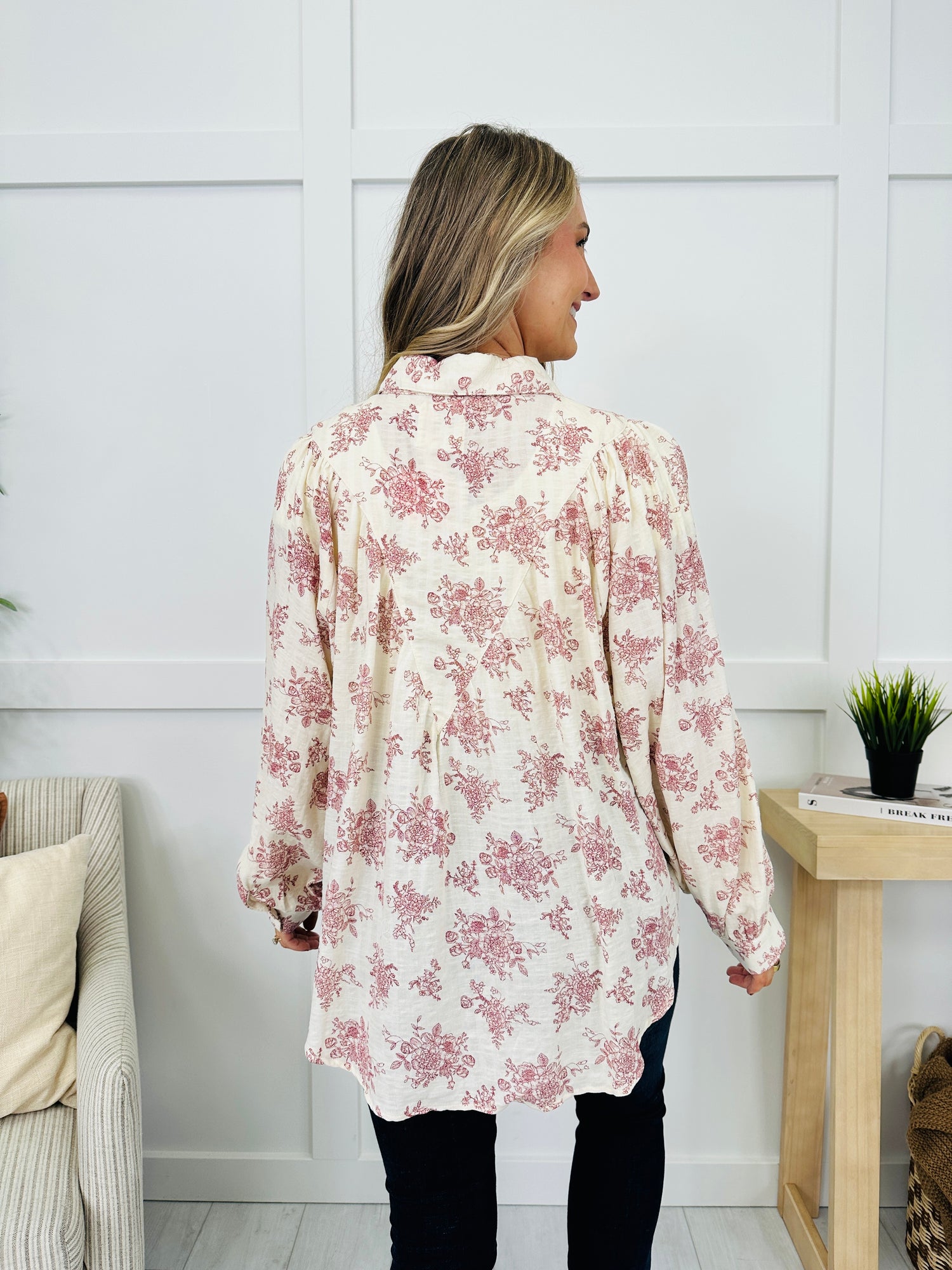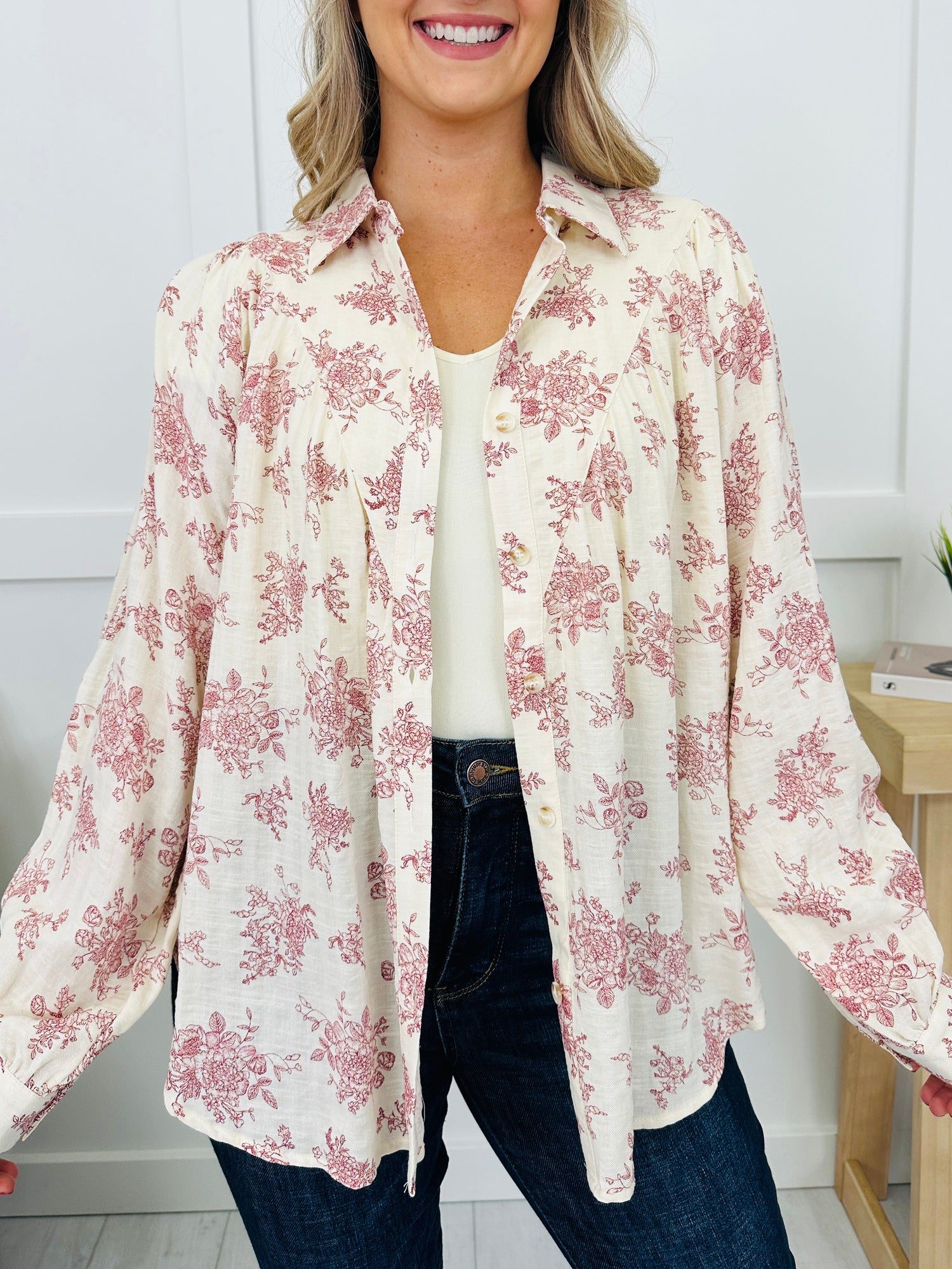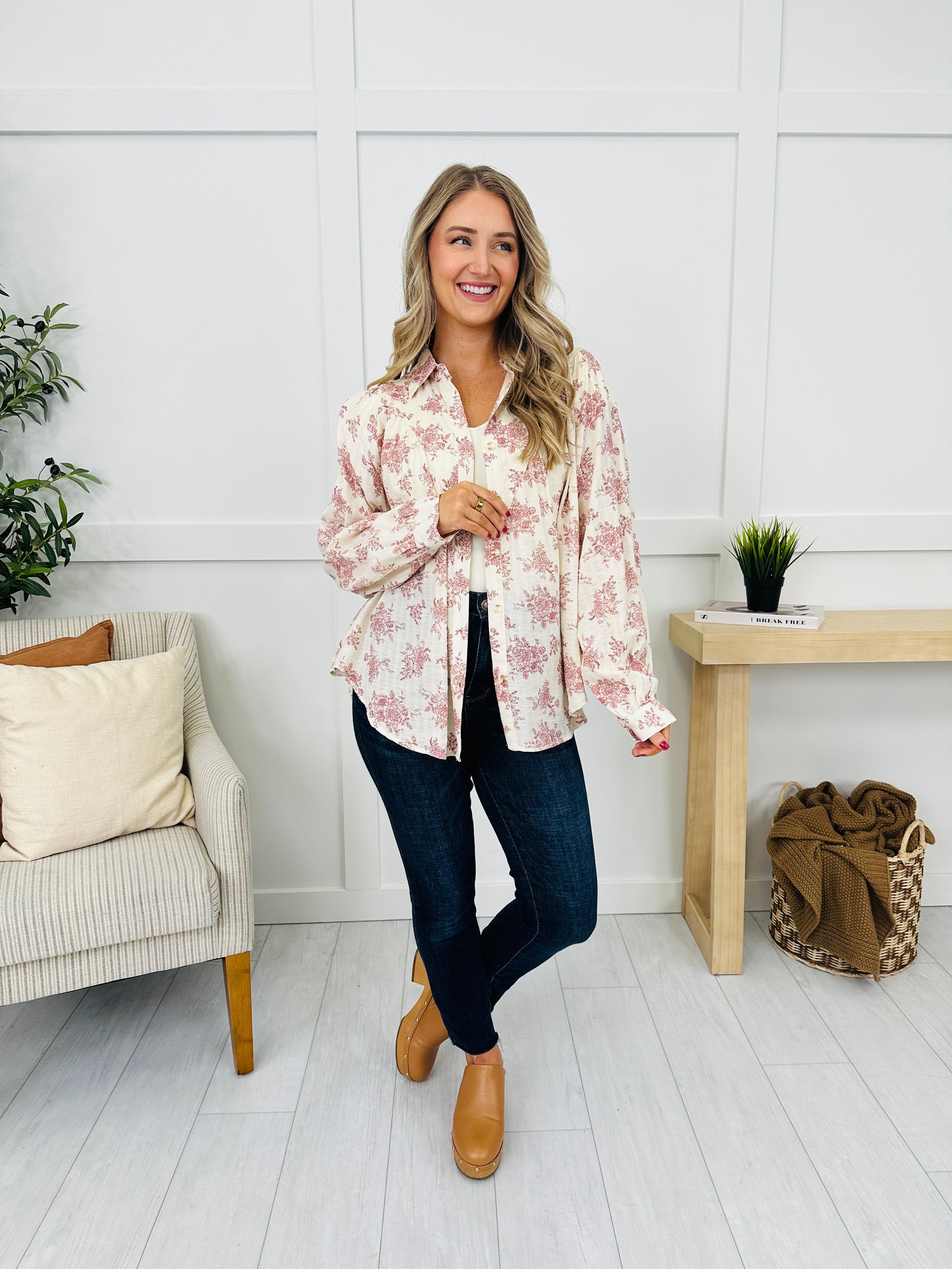 This top is all about timeless charm with its floral printed design that adds a feminine touch to your look. The classic button front makes it versatile for styling open or closed, while the modern seams and curved hem keep it effortlessly chic. A soft, flowy silhouette makes this piece an easy favorite for casual or dressed-up days.