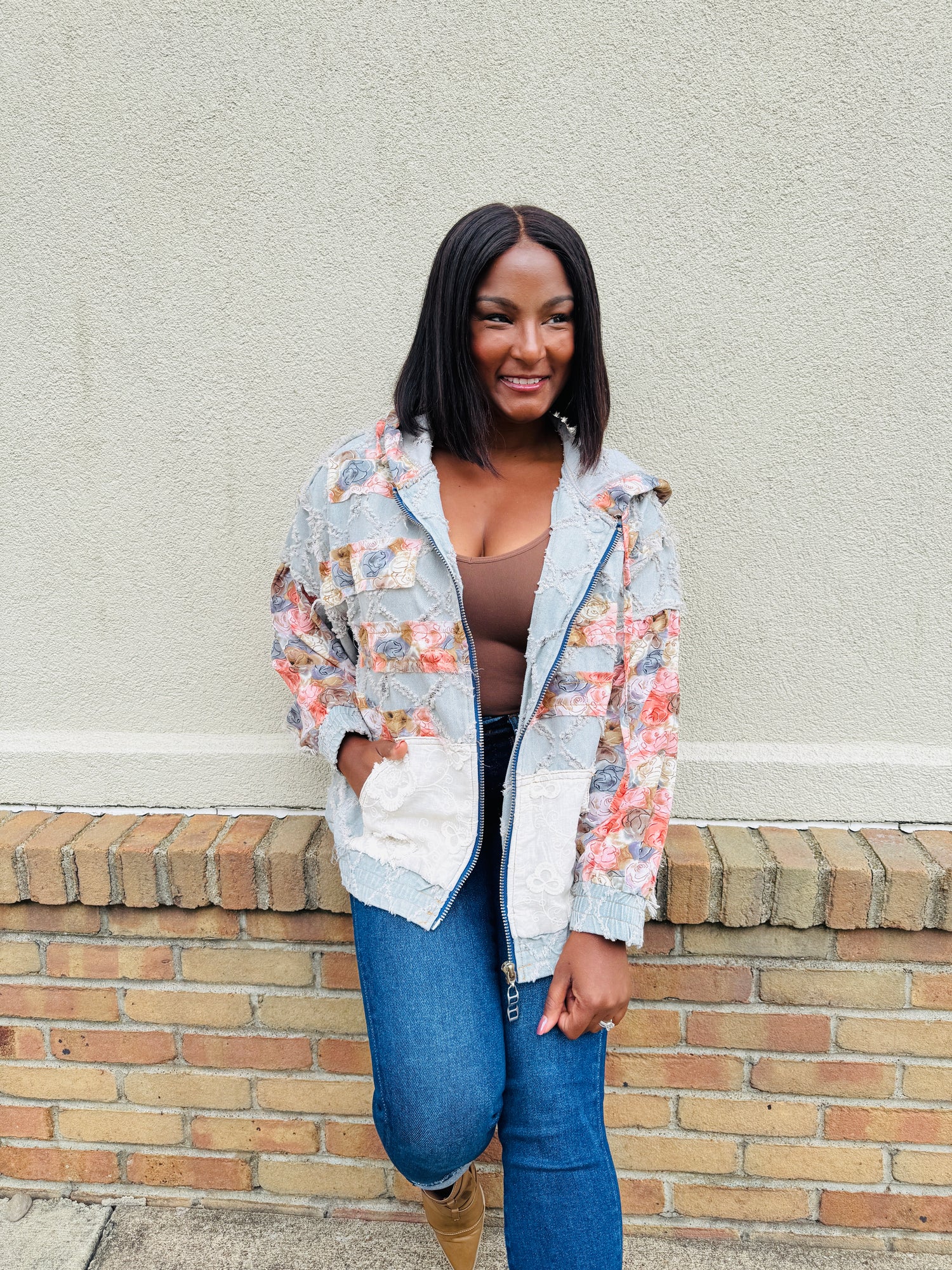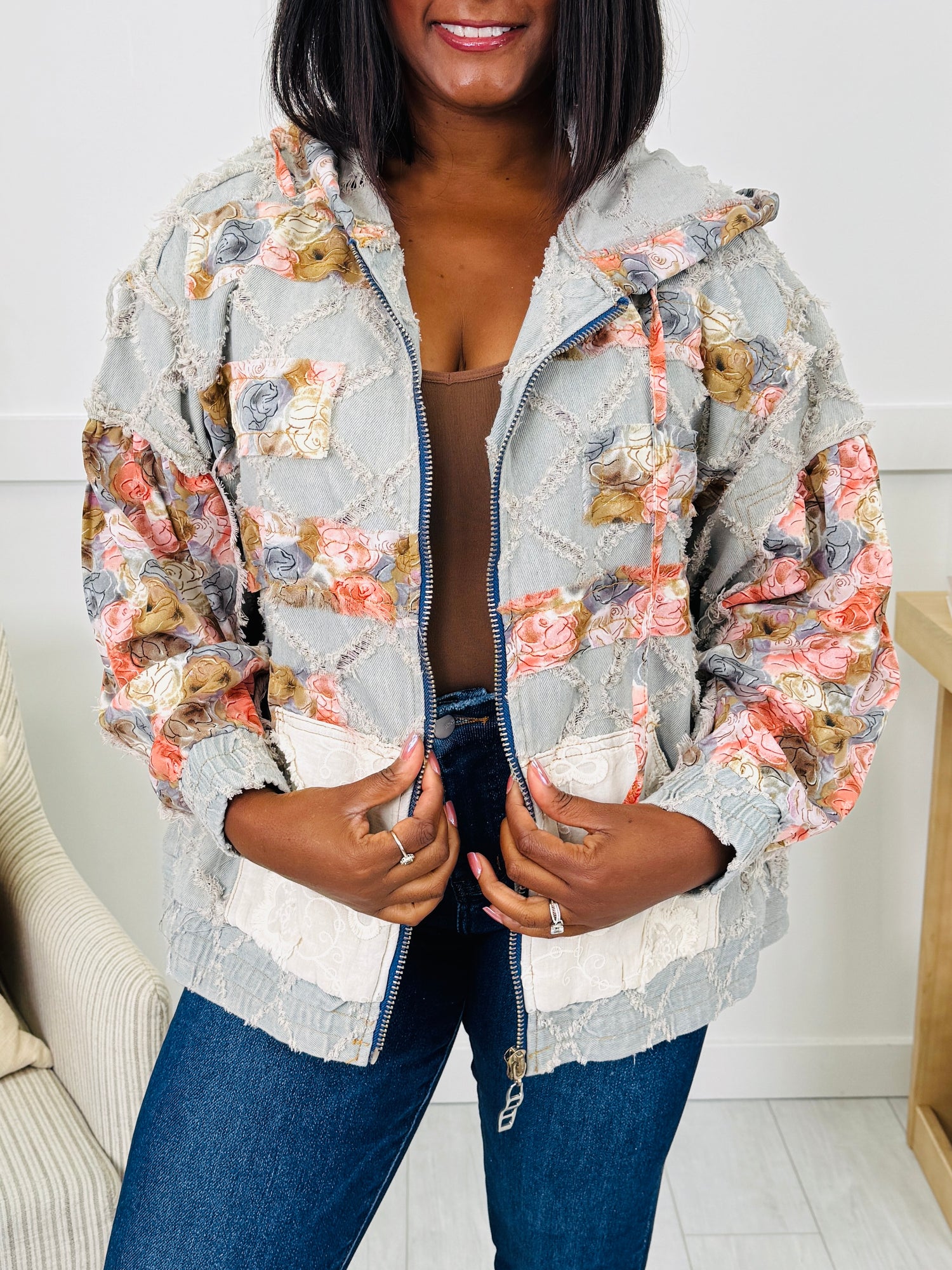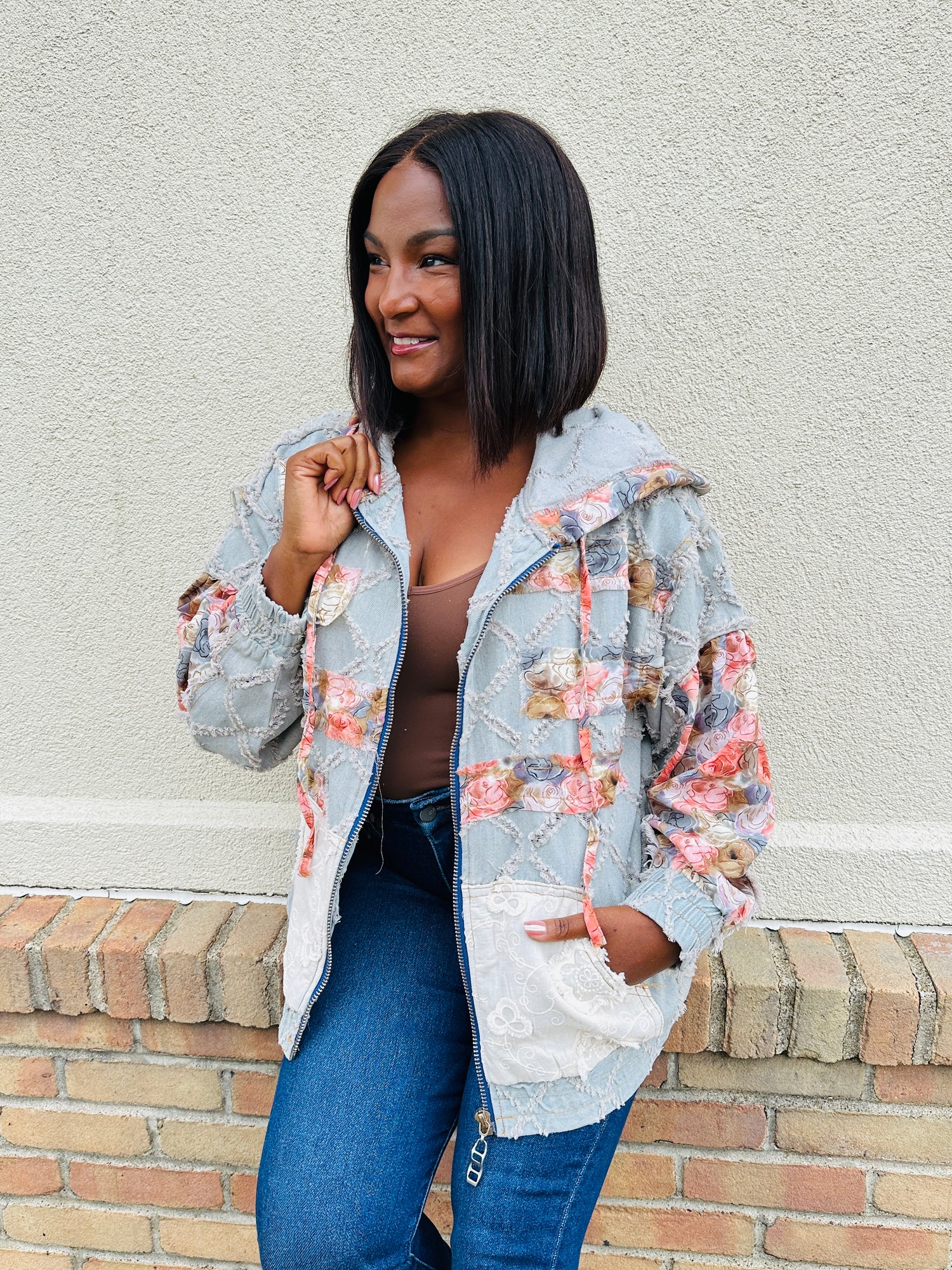This jacket is the perfect mix of laid-back charm and playful personality. The patchwork floral details on the sleeves, hood, and pockets pop beautifully against the textured diamond design, giving it a one-of-a-kind look. Finished with a casual zip-up fit and roomy front pockets, this piece is effortlessly stylish and easy to wear for everyday layering.