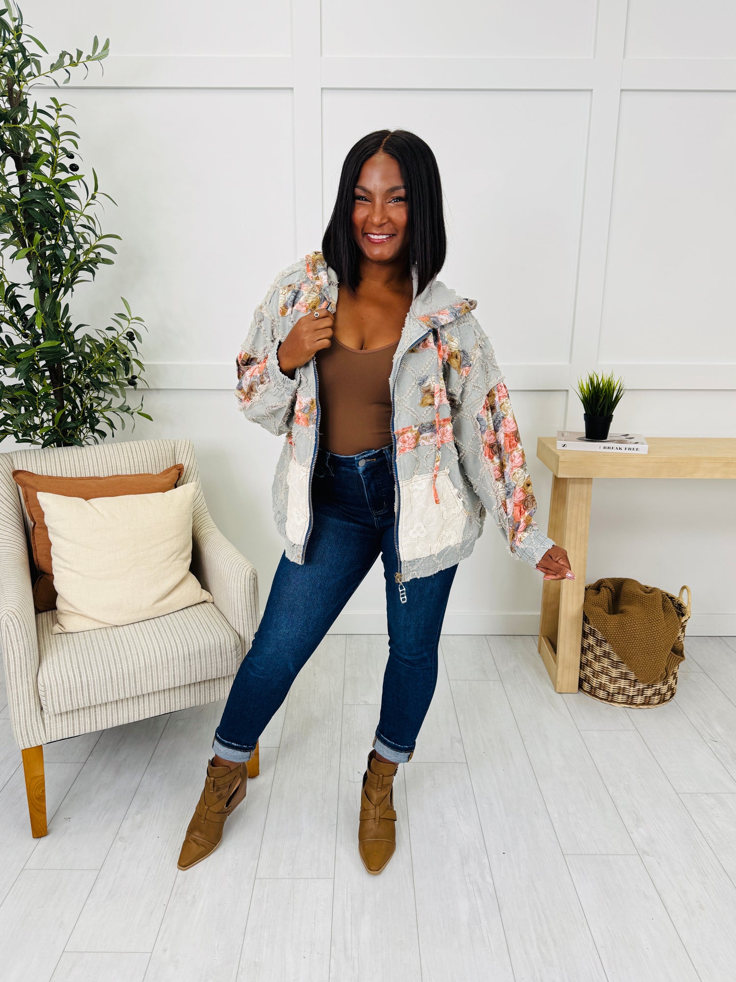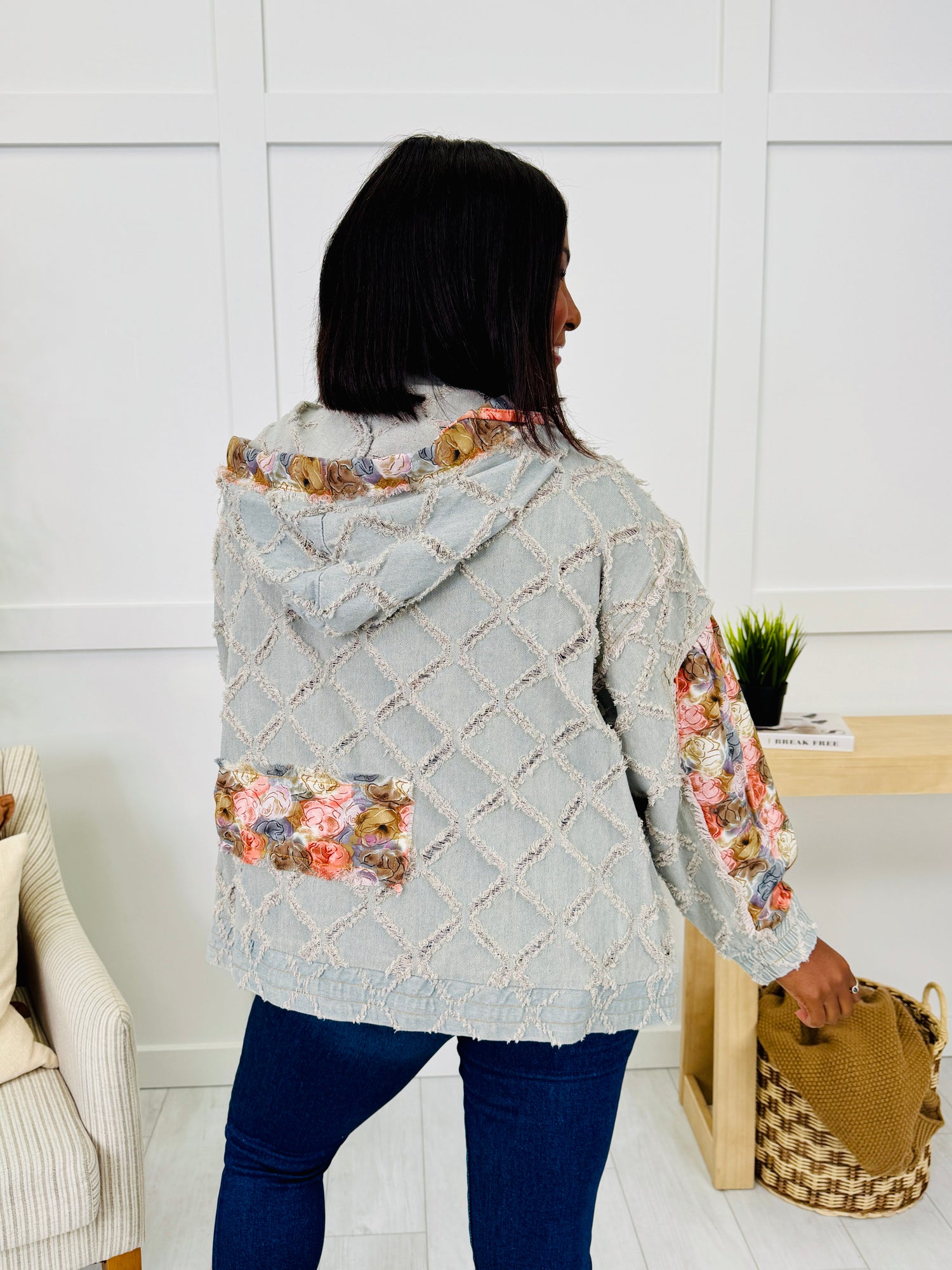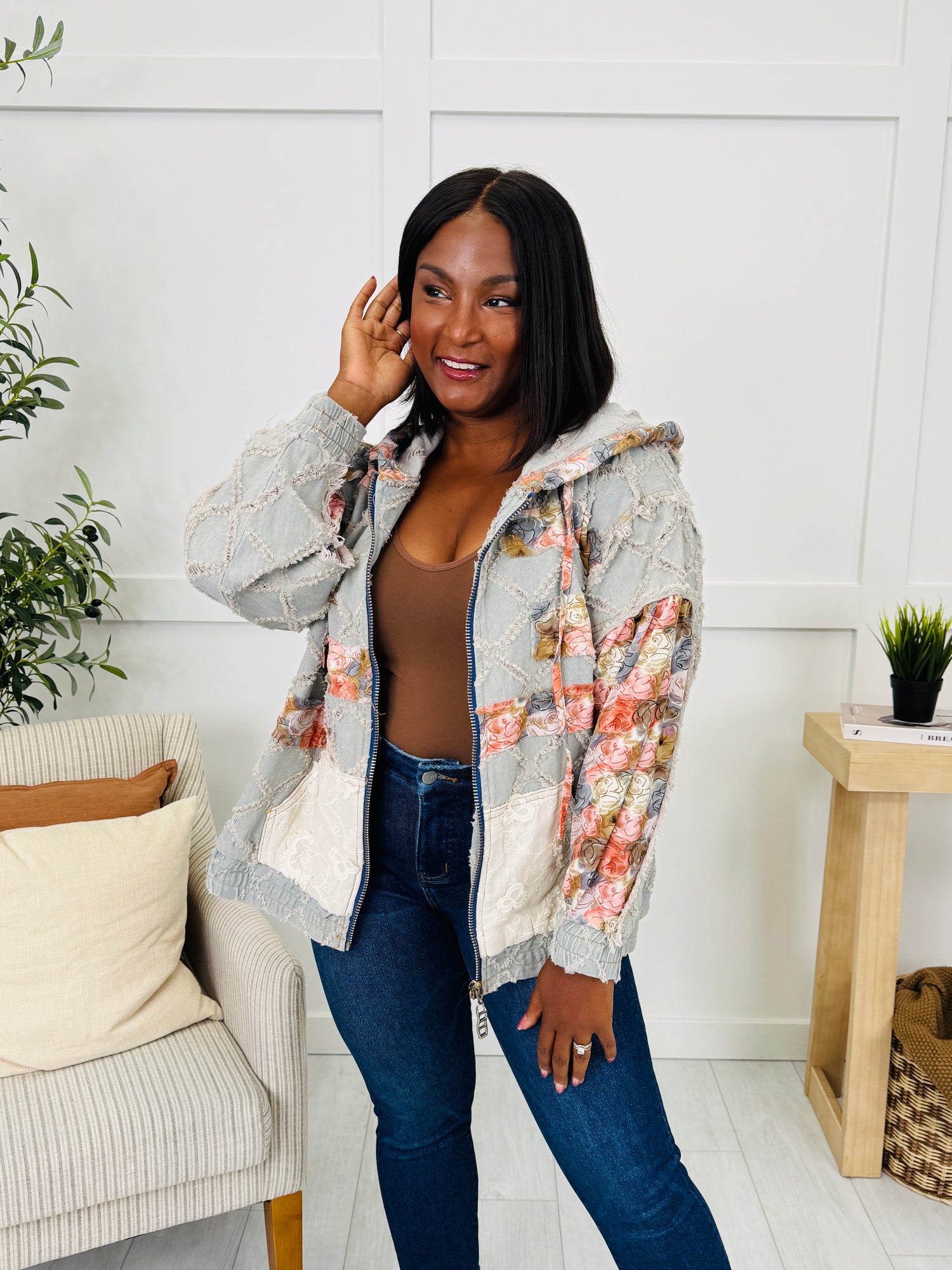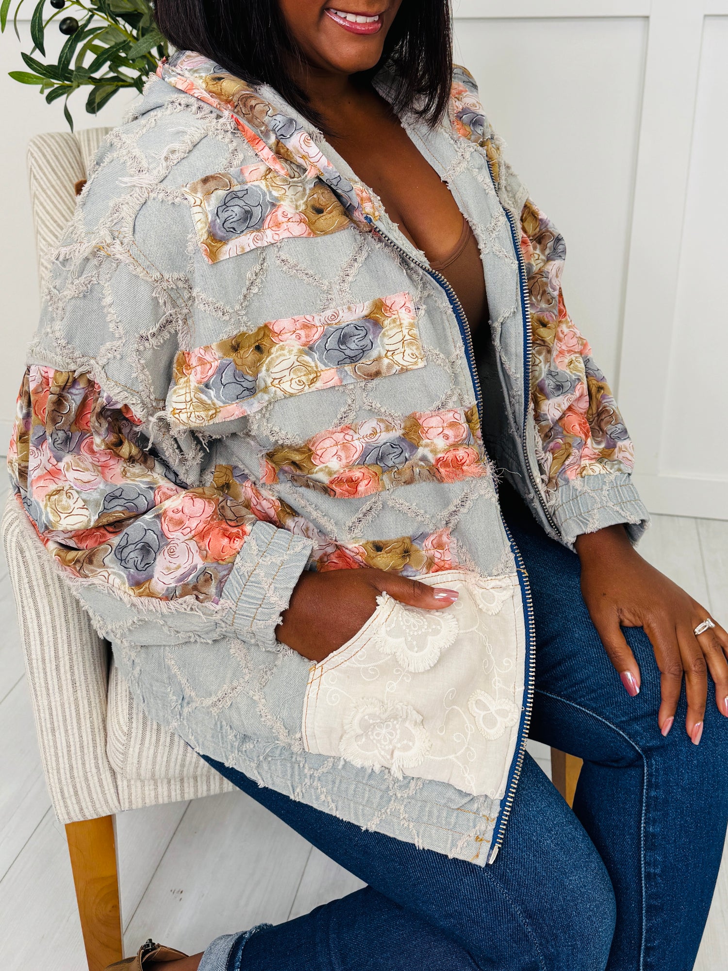 This jacket is the perfect mix of laid-back charm and playful personality. The patchwork floral details on the sleeves, hood, and pockets pop beautifully against the textured diamond design, giving it a one-of-a-kind look. Finished with a casual zip-up fit and roomy front pockets, this piece is effortlessly stylish and easy to wear for everyday layering.