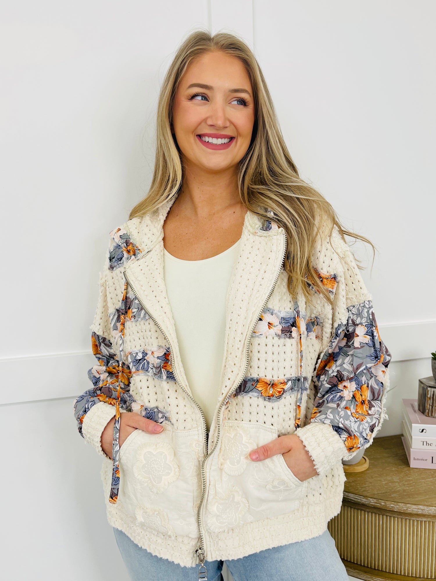 This jacket is the perfect mix of laid-back charm and playful personality. The patchwork floral details on the sleeves, hood, and pockets pop beautifully against the textured designs, giving it a one-of-a-kind look. Finished with a casual zip-up fit and roomy front pockets, this piece is effortlessly stylish and easy to wear for everyday layering.