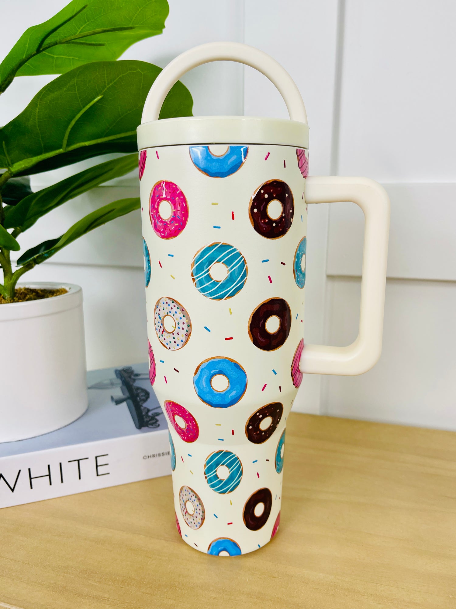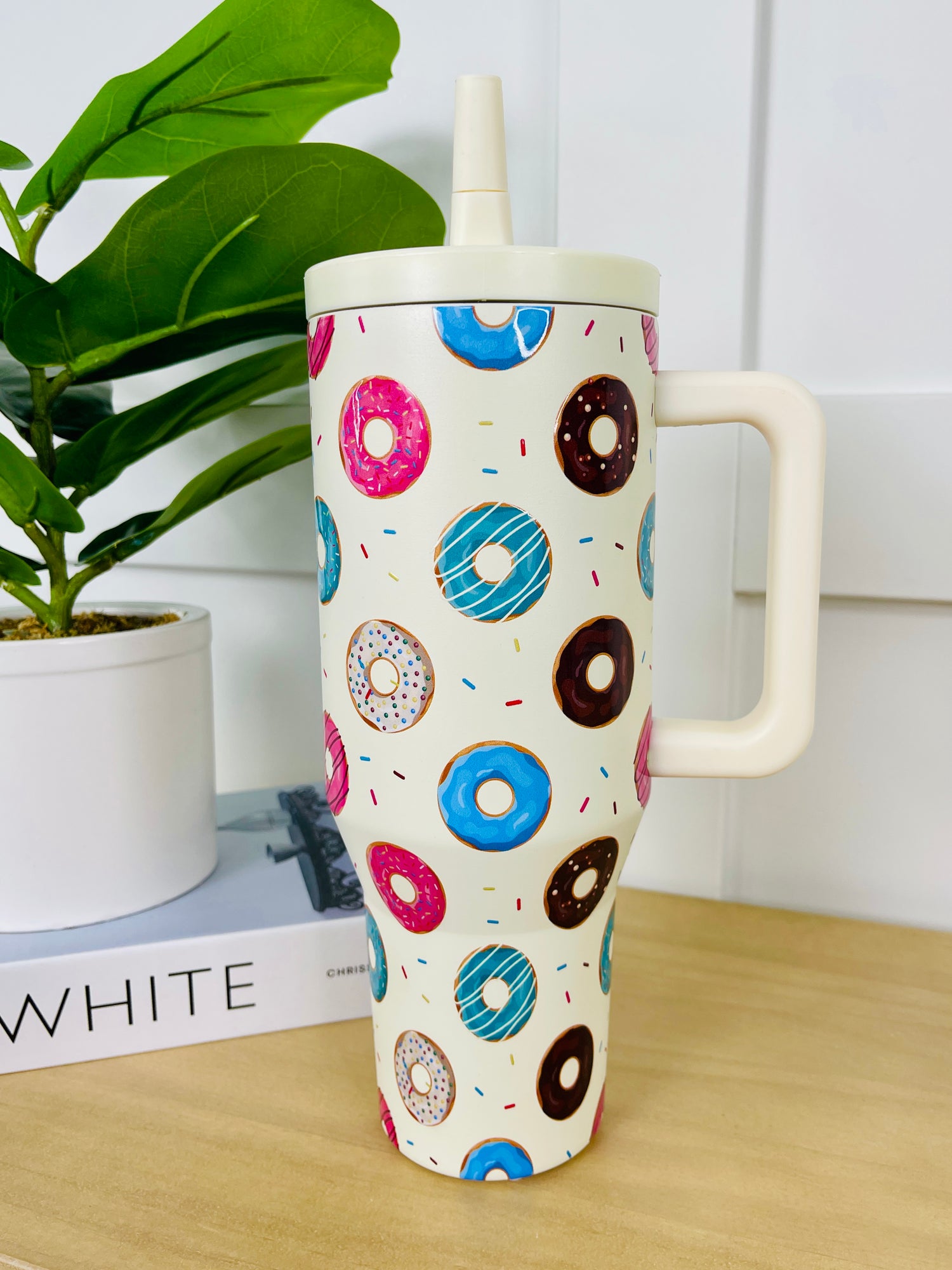 This fun and playful water bottle features a vibrant donut print with colorful sprinkles, perfect for adding some flair to your hydration routine. With a convenient flip-down straw and top handle, it's ideal for on-the-go sips and easy carrying. Stay stylish and refreshed with this must-have accessory!