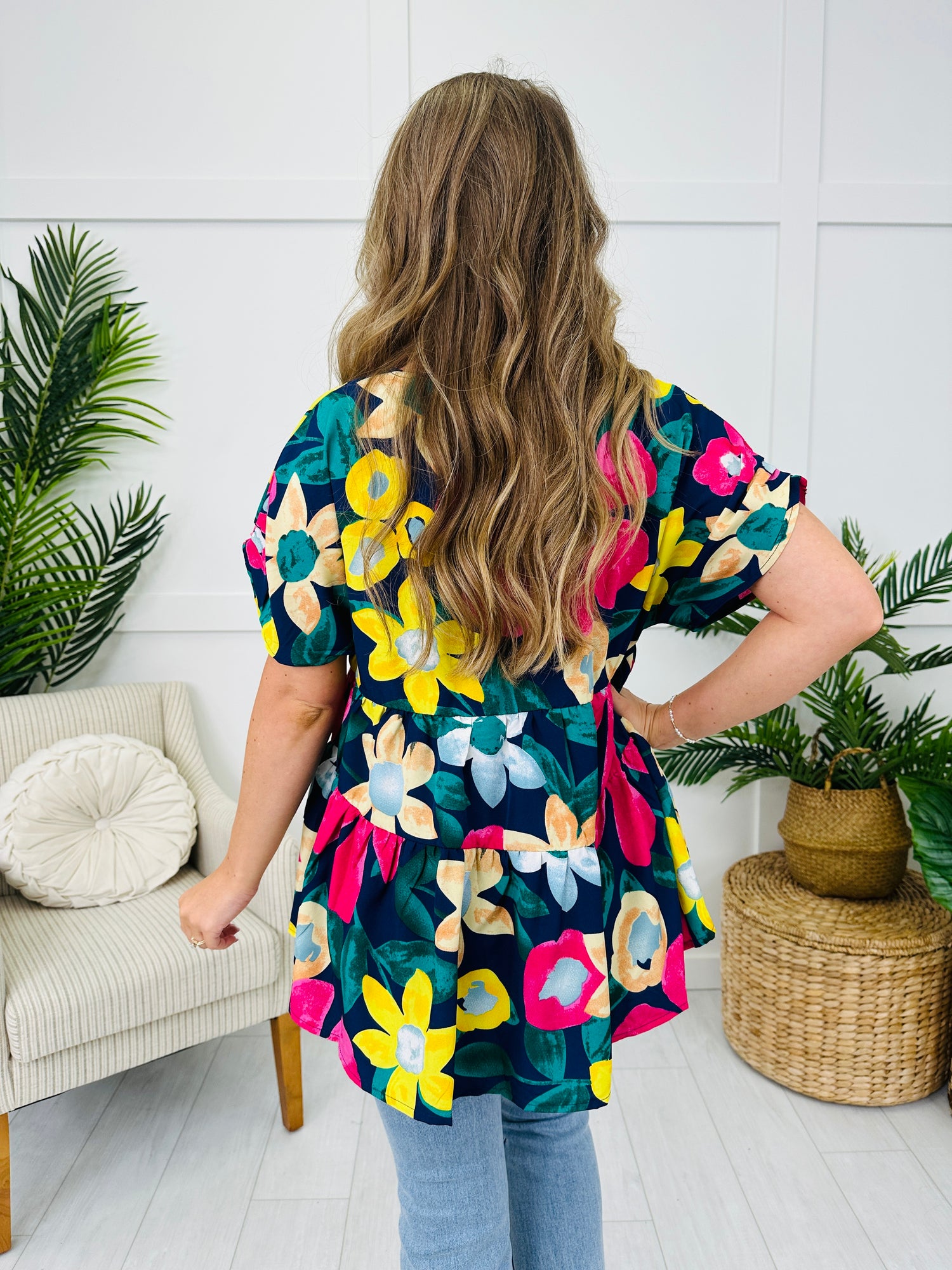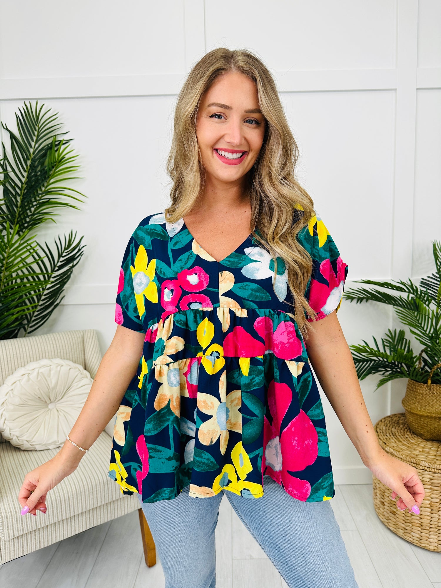 This top features a flattering V-neckline and a tiered, flowy design that offers a relaxed fit, perfect for all-day wear. The vibrant floral print brings a pop of color, making it an easy piece to pair with your favorite denim or shorts. Ideal for adding a playful touch to your wardrobe, this top is sure to turn heads with its bold and fun design.