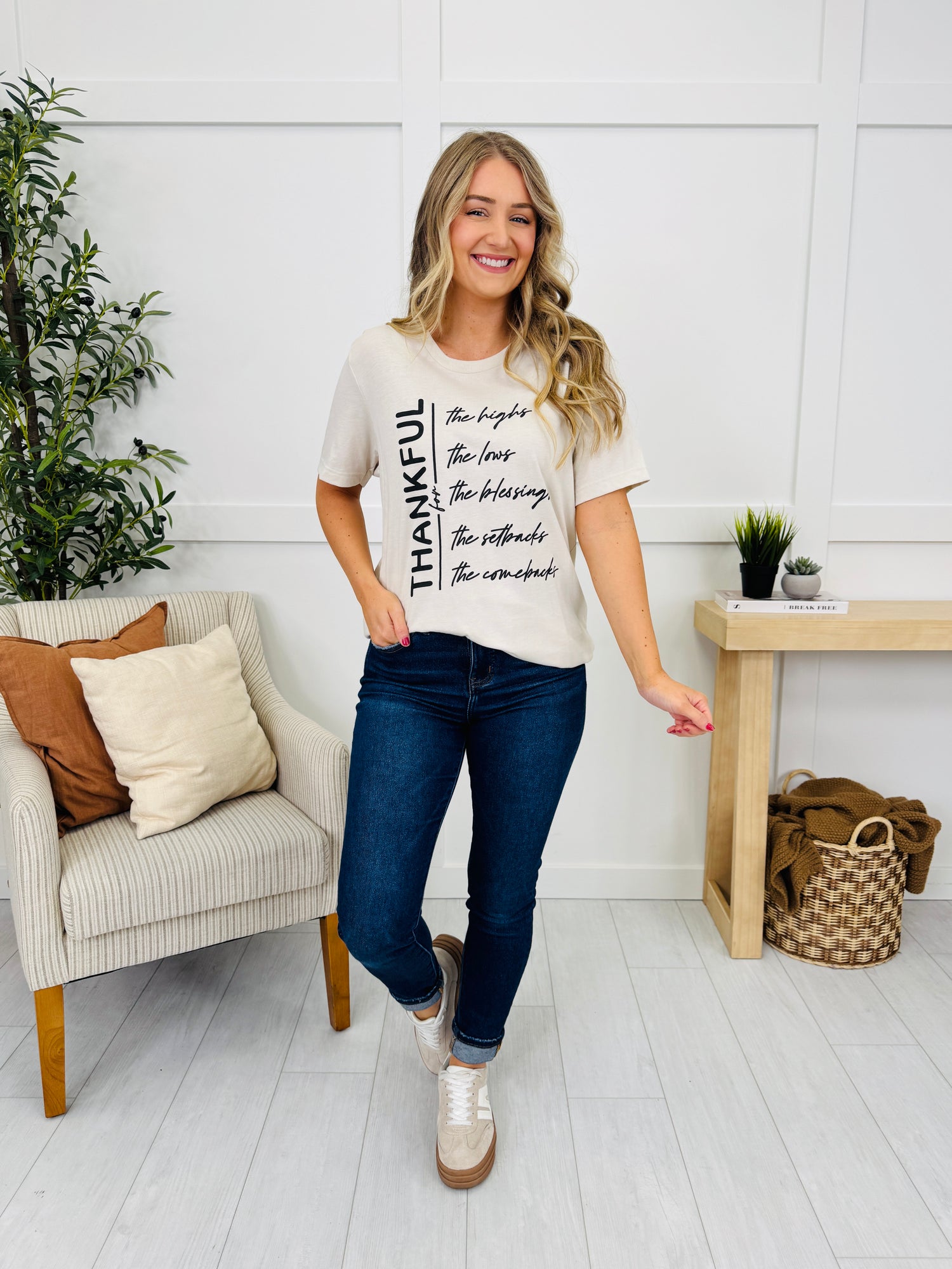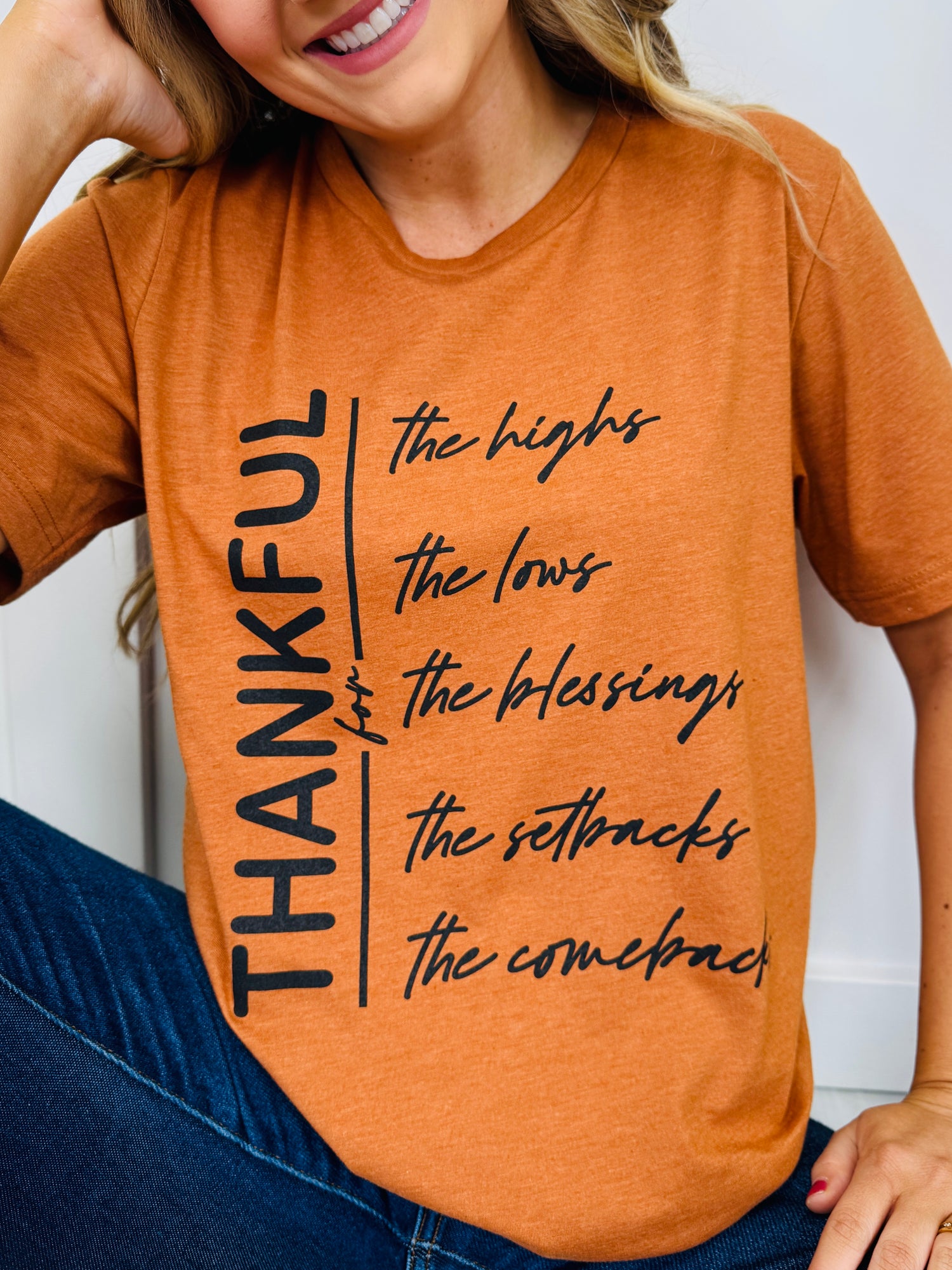 This new arrival is the perfect tee to wear during this season of thanks. It's a reminder to find gratitude in every part of the journey. Featuring an uplifting design that reads “Thankful for the highs, the lows, the blessings, the setbacks, the comeback,” this tee is the perfect mix of positivity and comfort.