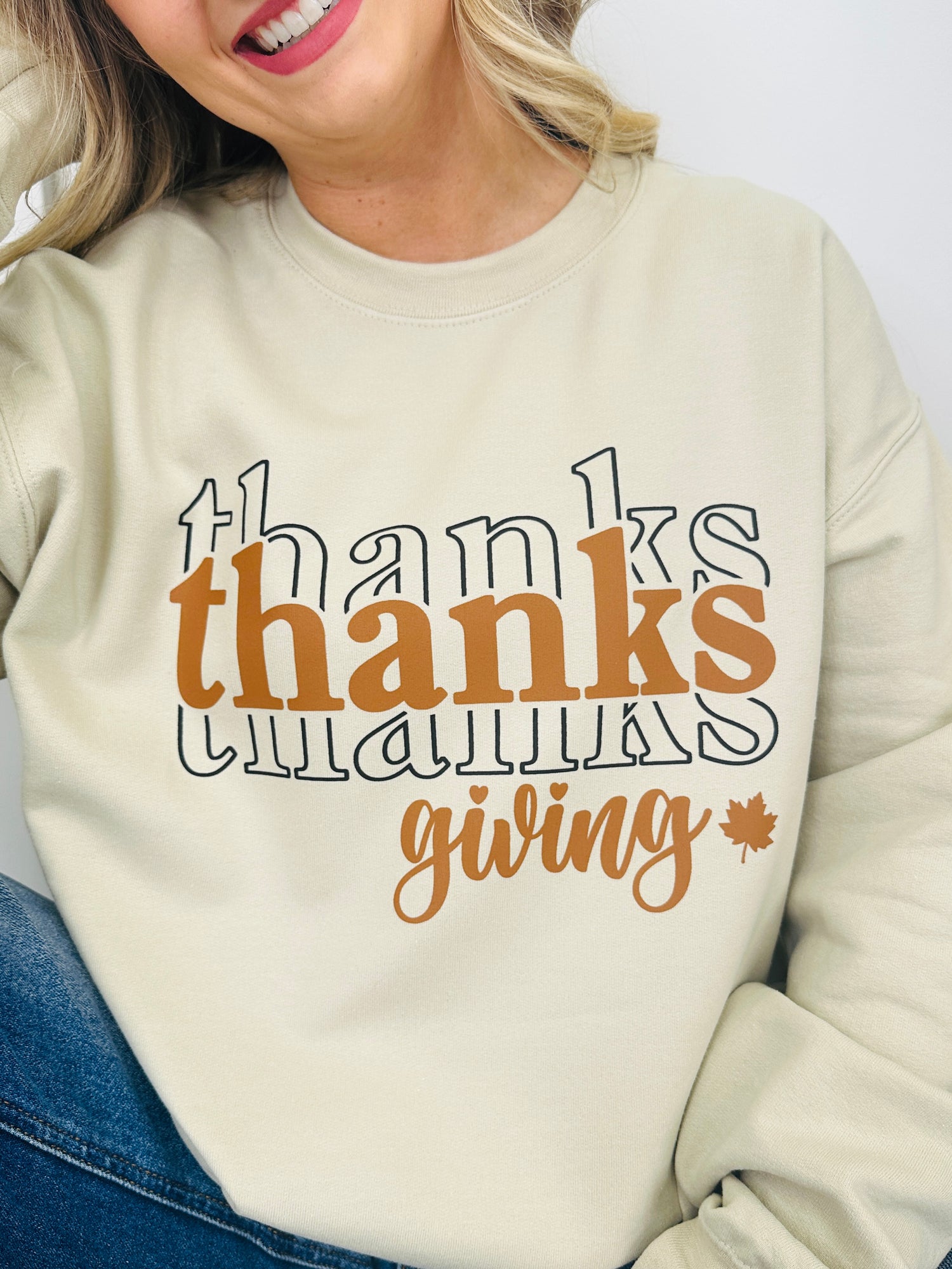 The festive graphic features bold layered “thanks” lettering with a playful “giving” script and a fall leaf detail, giving it that trendy seasonal touch. Add this festive favorite to your cart and celebrate in comfort and style!
